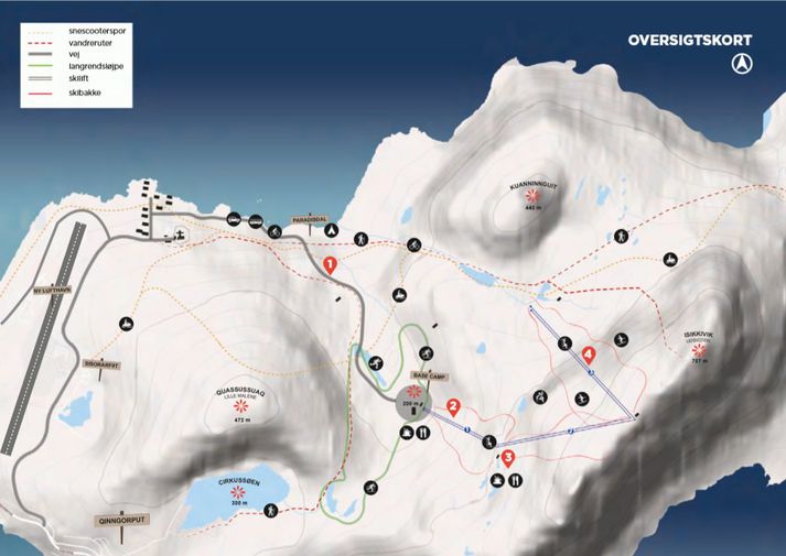 Metnaðarfullar hugmyndir hafa verið kynntar um uppbyggingu skíðamiðstöðvar í Nuuk í tengslum við gerð nýs alþjóðaflugvallar fyrir höfuðstað Grænlands. Rekstrarfélag núverandi skíðasvæðis, Sisorarfiit, sem kostað er af bæjaryfirvöldum í Nuuk, stendur á bak við þróunarverkefnið, sem hlotið hefur nafnið Arctic Park. Svo vill til að núverandi skíðasvæði er í göngufæri við flugvöllinn og eru aðeins um 250 metrar frá flugstöðinni að skíðalyftunni. Nýja skíðamiðstöðin er hins vegar áformuð inn af svokölluðum Paradísardal, um fjóra kílómetra frá flugvellinum og um átta kílómetra frá miðbæ Nuuk, í fjallasal girtum fjórum fjallstindum með stórbrotnu útsýni yfir Godthåb-fjörð. Yfirlitsmyndin sýnir Paradísardal og skíðamiðstöðina fyrir miðju og nýja alþjóðaflugvöllinn til vinstri.Teikning/TNT Nuuk-arkitektar.Aðstandendur verkefnisins telja að gerð alþjóðaflugvallarins leggi grunninn að mikilli fjölgun ferðamanna til Nuuk. Arctic Park er hugsað sem skíða- og skautasvæði en einnig sem frístunda- og athafnagarður allt árið um kring. Þar verði hægt að skíða jafnt sumar sem vetur en jafnframt verði svæðið útvistarparadís fyrir göngufólk, fjallgöngumenn og fjallahjólafólk.Stólalyfturnar yrðu í notkun allt árið og myndu nýtast fjölbreyttri útivist, eins og fjallahjólamönnum. Tjaldsvæði til vinstri og orlofshús til hægri á þessari samsettu mynd.Dalbotninn er skjólsæll og í um tvöhundruð metra hæð, með veiðiá og veiðivatni og fögrum blómagróðri og berjalyngi á sumrin. Hæstu fjöll ná nærri áttahundruð metra hæð og eru efstu hlíðar snævi þaktar allt árið. Stólalyftur myndu flytja skíðamenn og fjallahjólamenn upp í hæstu fjöll en einnig gætu venjulegir ferðamenn nýtt lyfturnar til að komast á magnaða útsýnisstaði. Ferðafólki byðist að tjalda í dalbotninum. Einnig yrðu veitingastaðir og orlofsbústaðir á svæðinu.Á sumrin myndi svæðið einnig nýtast margskonar útivist og skíðamenn gætu komist í snævi þaktar brekkur í hæstu fjöllum umhverfis Paradísardal. Nýja fangelsið í Nuuk er milli dalsins og flugvallarins.Teikning/TNT Nuuk-arkitektar.Gert er ráð fyrir að svæðið verði byggt upp í fjórum áföngum. Kostnaður með þremur stólalyftum og öllum innviðum, þar á meðal húsbyggingum, er áætlaður um 320 milljónir danskra króna, eða sem nemur 5,8 milljörðum íslenskra króna.Svifvængjaflug er einnig sýnt sem dæmi um afþreyingu sem byðist ferðamönnum í Arctic Park.Teikning/TNT Nuuk-arkitektar.Upplýsingarnar og meðfylgjandi teikningar eru fengnar frá TNT Nuuk-arkitektum. Af frétt grænlenska fjölmiðilsins Sermitsiaq má ráða að framundan sé að afla málinu pólitísks stuðnings og umræður um fjármögnun virðast einnig á frumstigi. Í þætti Stöðvar 2 um Nuuk fyrir þremur árum voru meðal annars sýndar myndir frá núverandi skíðasvæði: