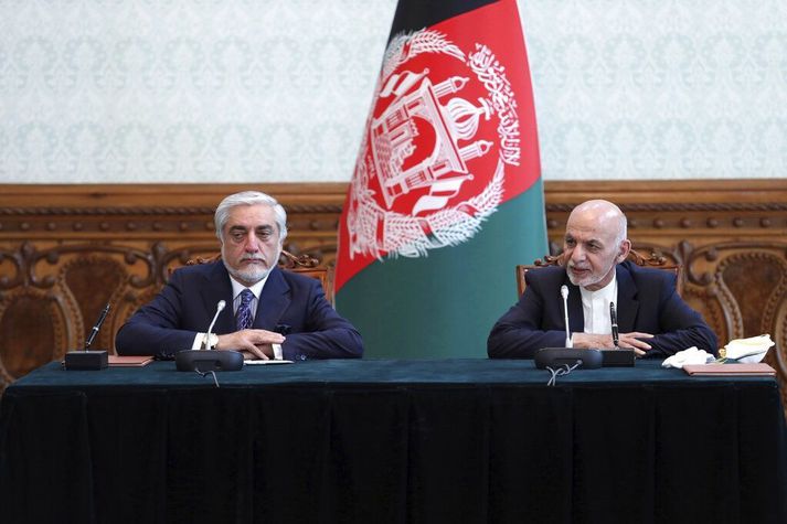 Ghani og Abdullah ná loks samkomulagi um að deila völdum Atli Ísleifsson skrifar 17. maí 2020 17:41 Abdullah Abdullah og Ashraf Ghani við undirritun samkomulagsins fyrr í dag. AP Ashraf Ghani, forseti Afganistans, og pólitískur andstæðingur hans, Abdullah Abdullah, hafa náð samkomulagi um að deila völdum í landinu. Pattstaða hefur verið í afgönskum stjórnmálum eftir forsetakosningarnar í landinu á síðasta ári. „Við munum deila byrðunum sem mun létta á herðum okkar, ef guð lofar,“ sagði Ghani þegar þeir Abullah undirrituðu samkomulagið í dag. Sýnt var frá undirrituninni í beinni útsendingu í afgönsku sjónvarpi. Þeir Ghani og Abdullah sögðust vonast til að samkomulagið muni leiða til vopnahlés og síðar varanlegs friðar í landinu. Samkvæmt samkomulaginu mun Ghani áfram gegna embætti forseta landsins, en Abdullah mun hafa það hlutverk að leiða friðarviðræður við Talibana. Helmingur ráðherra verður úr flokki Ghani og hinn helmingurinn úr flokki Abdullah. Fyrrverandi stríðsherrann og varaforsetinn Abdul Rashid Dostum, sem nú er á bandi Abdullah, verður yfirmaður afganska hersins. Landskjörstjórn lýsti því yfir eftir kosningarnar í september síðastliðinn að Ghani hafi haft sigur, en Abdullah sagðist efast um niðurstöðurnar og lýsti sjálfur yfir sigri. Abdullah og Ghani hafa lengi verið pólitískir andstæðingar, en þeir deildu völdum einnig á síðasta kjörtímabili. Afganistan Mest lesið Reynslubolti kveður lögregluna Innlent Rannsaka tengsl skotárásarinnar við annað morð Erlent Leitaði á lögreglustöð til að komast úr járnunum Innlent Sex um borð í einkaþotu sem hrapaði Erlent Mikið álag á bráðamóttökunni á Akureyri Innlent Fimm ára dómur fyrir hnífaárás á fjölskylduföður Innlent Sex hundruð miðar á vettvangi morðsins: „Fokking hálfvita fífl bæði tvö!!!!“ Innlent Nauðsyn að skýra betur hvort eða hvenær læknar megi rjúfa þagnarskyldu Innlent Evrópa samþykkir 90 milljarða evra lán til Úkraínu Erlent Telur hagræðingaráformin þau metnaðarfyllstu Innlent Fleiri fréttir Morðinginn í Brown háskóla fannst látinn Evrópa samþykkir 90 milljarða evra lán til Úkraínu Rannsaka tengsl skotárásarinnar við annað morð Sex um borð í einkaþotu sem hrapaði Beita dómara ICC refsiaðgerðum vegna Ísrael Taka á kvenfyrirlitningu með sérstöku námskeiði fyrir drengi Hæðist að og smánar fyrrverandi forseta á „frægðargangi“ Frú Macron í klandri eftir ósmekkleg ummæli um femínista „Dr. Dauði“ í lífstíðarfangelsi fyrir að myrða tólf Ekki hafi verið rétt að benda á Skandia-manninn sem morðingja Palme Myndskeið birt af Reiner eftir morðin og fyrir handtöku Sér eftir að hafa ekki sagt Eli oftar hve heitt hann elskaði hann Segir „evrópsk svín“ vilja hagnast á falli Rússlands Auðgaðist ævintýralega á svikum og prettum Eldur í Tívolí Meina fólki frá fjölda ríkja að ferðast til Bandaríkjanna Nuddari gerði dóttur Reiner-hjónanna viðvart Bondi morðinginn formlega ákærður í 59 liðum Trump setur hafnbann á olíuskip á leið til og frá Venesúela Nick Reiner ákærður fyrir að myrða foreldra sína Segir Trump hafa persónuleika alkóhólista Brestir í MAGA-múrnum Lögðu lengi á ráðin um herlög Tólf ára drengur grunaður um morð í Malmö Heimta enn héruð Úkraínu sem þeir halda ekki Ósátt við lögreglu sem leitar enn morðingjans Segjast hafa myrt átta sæfarendur til viðbótar FDA samþykkir tvö ný lyf gegn ónæmum lekandabakteríum Vill fimm milljarða Bandaríkjadala frá BBC Rannsaka hvort feðgarnir fengu herþjálfun á Filippseyjum Sjá meira