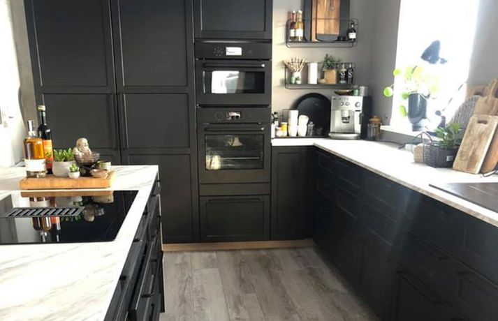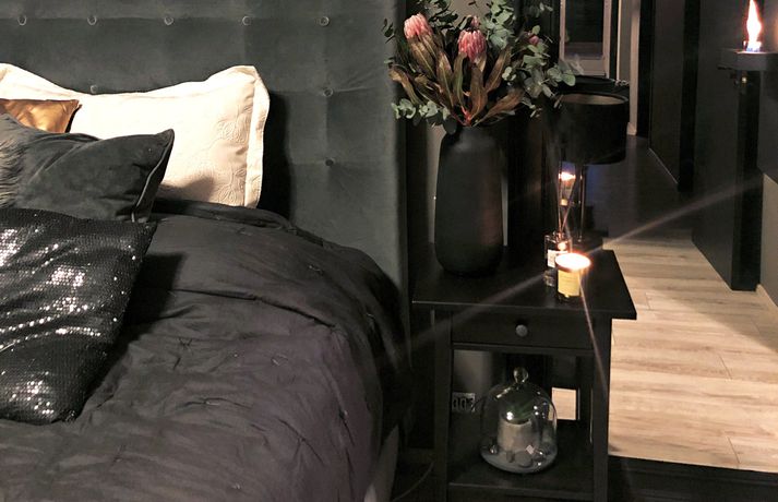 Svana Símonar og Ríkarð Svavar Axelsson keyptu sér hús á síðasta ári og gerðu ýmsar breytingar áður en þau fluttu inn. Svana deildi útkomunni í Facebook hópnum Skreytum hús og vakti það mikla athygli. Hjónin eru hrifin af svörtu og völdu meðal annars að skipta út hvítri eldhúsinnréttingu fyrir svarta. „Við byrjuðum framkvæmdir 29. nóvember og fluttum inn þremur vikum seinna, korter í jól,“ segir Svana í samtali við Vísi. „Vorum þá búin að rífa alla veggi í eldhúsi og stofu, parketleggja með hjálp frá Vigni mági mínum snillingi og mála alla hæðina, brjóta niður fyrir nýju hurðargati og fylla upp í annað. Svo vorum við búin að koma eldhúsinnréttingunni upp með hjálp frá smið. Ég sá samt um að skrúfa allar skúffur og skápa saman með hjálp frá vinum.“ Svana segir að þau hjónin hafi reynt að mála í stað þess að henda en þurftu þó að brjóta niður veggi til þess að opna rýmið.Mynd/Svana Hjónin eru í fullri vinnu og gerðu þetta með börnin en sjá ekki eftir því að hafa farið af stað í þetta krefjandi verkefni. „Ég mæli ekki endilega með þessu en með jákvæðni og dass af þolinmæði tókst þetta,“ segir Svana. Þau breyttu eldhúsinu, ganginum, baðherberginu og svefnherberginu sínu síðustu mánuði en reyndu að láta framkvæmdirnar vera ekki of kostnaðarsamar. Svefnherbergisgangurinn fyrir og eftir breytingar. Mynd/Svana Svana hefur áður breytt húsi á Akureyri með ódýrum og sniðugum lausnum. Fjallað var um breytingarnar á Vísi fyrir tveimur árum. Sjá einnig - Tóku hús í gegn á Akureyri: Það þarf ekki að vera dýrt að gera heimilið fallegra Svarti liturinn er í miklu uppáhaldi hjá Svönu.Mynd/Svana „Við tókum bara í gegn það sem var komið á tíma og þurftum að gera, nýttum allt sem hægt var að nýta, eins og á baðinu og allar hurðar.“ Svana valdi að lakka flísarnar í stað þess að brjóta þær upp og setja nýjar.Mynd/Svana Svana vandaði einstaklega mikið litavalið á rýminu, til þess að láta það henta betur þeirra stíl. „Litapallettan er úr Sérefni, þeir heita deep sarcelles á alrýminu, dark sarcelles á baðinu og arninum, intence sarcelles í svefnherberginu. Dásamlegir og hlýir að mínu mati. Mér finnst ég búa á hóteli. Ég lakkaði múrsteinavegginn með lakki frá Sérefni sem heitir superfinish og það kom út eins og flauelsáferð, mjög töff. Við máluðum hurðar með superfinish og baðflísarnar með wapex 660“ Svefnherbergið er dökkt og kósýMynd/Svana Hún er ánægð með allar breytingarnar sem þau gerðu og á erfitt með að velja hvað stendur upp úr. „Ég myndi líklega vera alltaf inn í svefnherbergi ef það væri í boði en annars er ég rosalega glöð með eldhúsið okkar. Skápaplássið er geggjað og það er orðið virkilega gaman að elda.“ Borðplatan í eldhúsinu er filmuð spónaplata.Mynd/Svana Hún bætir því svo við að reyndar sé það eiginmaðurinn sem eldi oftast. „Það er vel hægt að gera fallegt án þess að rífa allt út, málningin gerir kraftaverk,“ segir Svana að lokum. Áhugasamir geta fylgst með Svönu á Instagram.