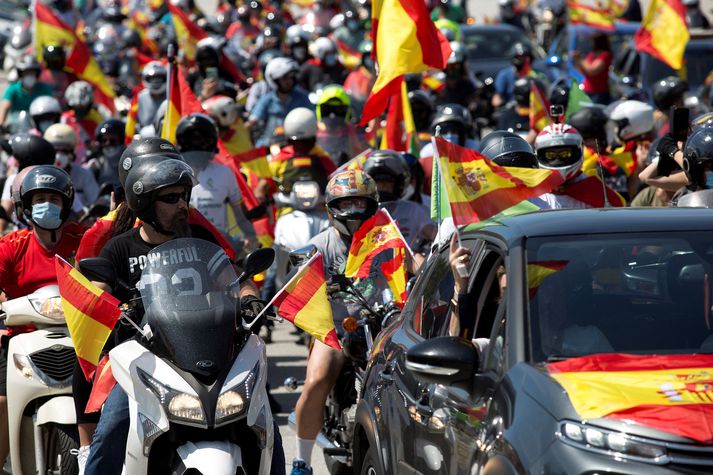 Þúsundir mótmæltu í gær viðbrögðum spænskra stjórnvalda við faraldri kórónuveirunnar sem valdið getur Covid-19. Öfgahægriflokkur í landinu hvatti til mótmælanna. Mótmælendur óku í gegnum höfuðborg Spánar, Madríd, og veifuðu spænska fánanum. Það var krafa þeirra að samfélagslegum takmörkunum í borginni yrði aflétt og að Pedro Sánchez, forsætisráðherra landsins úr flokki sósíalista, segði af sér embætti. Mótmælin, sem hvatt var til af öfgahægriflokknum Vox, byggja á því að takmarkanirnar sé til þess fallnar að fara illa með atvinnulíf og efnahag landsins. Santiago Abascal, leiðtogi flokksins, leiddi mótmælin í opinni rútu. Hann var með andlitsgrímu og sagði ríkisstjórnina „beinlínis ábyrga fyrir verstu viðbrögðum við faraldrinum í öllum heiminum.“ Tæplega ein milljón Spánverja missti vinnuna í mars, og hagspár gera ráð fyrir því að efnahagur Spánar dragist saman um allt að 12 prósent á þessu ári sökum faraldursins. Slakað var á helstu samfélagslegu takmörkunum í landinu um miðjan mars, en íbúar tveggja fjölmennustu borga Spánar, Madríd og Barcelona, hafa áfram mátt sæta harðari takmarkana, vegna fjölda kórónuveirutilfella innan þeirra. Á mánudag verður þó slakað á höftum þar, og fólki leyft að snæða utandyra og hittast í allt að tíu manna hópum. Í gær tilkynnti Sánchez um tvenns konar fyrirhugaðar tilslakanir á samfélagslegum takmörkunum. Annars vegar sagði hann að knattspyrnuyfirvöld hefðu fengið grænt ljós á að hefja spænsku deildarkeppnina frá 8. júní og hins vegar að Spánn yrði opnaður fyrir ferðamönnum í júlí.