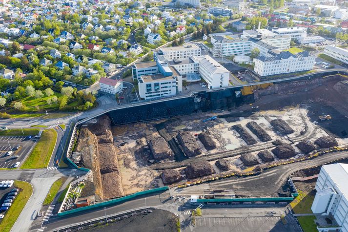 Síðasta táknræna, stóra sprengingin vegna framkvæmda við byggingu meðferðarkjarna nýs Landspítala við Hringbraut var gerð fyrr í dag. Til stendur að opna sjúkrahúsið árið 2026. Svandís Svavarsdóttir heilbrigðisráðherra var viðstödd sprenginguna en meðferðarkjarninn er stærsta byggingin í heildaruppbyggingu Nýs Landspítala við Hringbraut. Enn á eftir að ráðast í fáeinar minniháttar sprengingar við frágang, en sprengingin í dag var gerð í norðausturhorni framtíðar bílakjallara. Í tilkynningu er haft eftir Svandísi að þetta séu stór tímamót og mikill áfangi að sjá draum landsmanna um uppbyggingu Landspítala rætast. Vopnaður heilbrigðisráðherra við Hringbraut.Hringbrautarverkefnið „Framkvæmdir hér á svæðinu hafa gengið vel og færa okkur nær þvi markmiði að hér verði tekið í notkun nýtt þjóðarsjúkrahús árið 2026. Nýtt sjúkrahús mun breyta miklu til framtíðar allri heilbrigðisþjónustu, auka þjónustu við sjúklinga og stórbæta aðstöðu heilbrigðisstarfsfólks,“ sagði Svandís. Lokað útboð Einnig er haft eftir Gunnari Svavarssyni, framkvæmdastjóra NLSH ohf, að jarðvegsframkvæmdir við grunn hússins hafi gengið samkvæmt áætlun. ÍAV hefur verið aðalverktaki verksins. „Verkefnið hefur ekki haft neina samgönguröskun í för með sér á svæðinu og um leið endurspeglar landfyllingarverkefnið gildi umhverfisþátta og þess metnaðar sem lagt er upp með. Þessi táknræna lokasprenging í grunninum segir okkur að nú sé næsta stóra verkefnið að steypa upp húsið og áætlanir NLSH eru að uppsteypan geti hafist von bráðar í samræmi við heimildir. Fimm verktakar munu fljótlega skila inn tilboðum í lokuðu útboði,“ segir í tilkynningunni. Svandís og Gunnar.Hringbrautarverkefnið