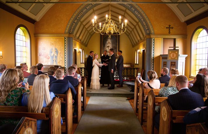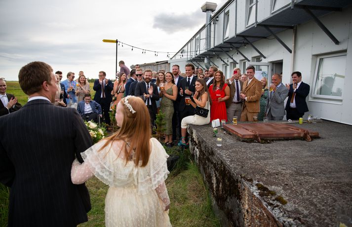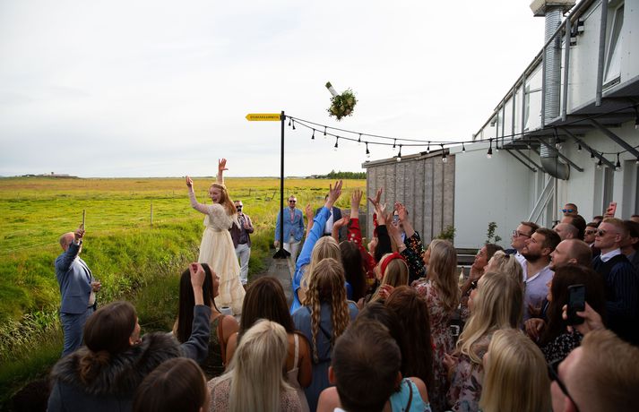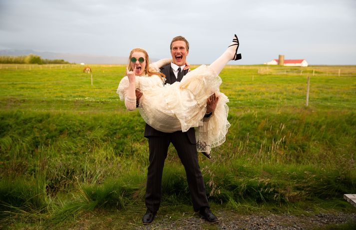 Héldu brúðkaup sem enginn gifti sig í Hallgerður Kolbrún E. Jónsdóttir skrifar 27. júlí 2020 14:47 Brúðhjónin mæta til veislu. Aðsend/Håkon Broder Lund Um 90 manna vinahópur hélt nú um helgina upp á sveitabrúðkaup þeirra Gumma og Urðar við mikinn fögnuð. Athöfnin fór fram í Oddakirkju rétt hjá Hvolsvelli og veislan á hóteli þar nærri. Það er svo sem ekki í frásögur færandi að ungt par hafi ákveðið að ganga í það heilaga en það sem vekur athygli er að enginn gifti sig í raun og veru. Brúðhjónin voru í raun áhugaleikarar og vinahópurinn fékk hlutverk hinna ýmsu persóna í veislunni. Nokkrir meðlimir vinahópsins ákváðu í vor að taka sig til og skipuleggja veislu sem allra flestir meðlimir í þessum stóra vinahópi kæmust í. Þá kom ákveðin spurning upp. Við hvaða tilefni getur fólk kastað öllu frá sér á stuttum tíma, fengið frí í vinnu og pössun fyrir börnin? Svarið var að sjálfsögðu hjónavígsla og hófst þá undirbúningur þessarar stórglæsilegu brúðkaupsveislu. View this post on Instagram Besta dag í livið okkur #gurdur2020 A post shared by @ urduroggummi on Jul 25, 2020 at 12:26pm PDT „Ég er einn af góðum hópi manna og kvenna sem var að standa fyrir þessu sveitabrúðkaupi þar sem við í raun settum á svið brúðkaup, fengum leikara til að taka að sér hlutverk brúðhjóna. Hugmyndin kviknaði fyrst vegna þess að það er búið að vera að aflýsa brúðkaupum og enginn í vinahópnum er að fara að gifta sig í sumar. Við vildum henda í eitthvað gott kvöld með stórvinahópnum, það er langt síðan fólk kom allt saman,“ segir Ísak Einar Rúnarsson, einn skipuleggjenda veislunnar. Staðgengill prests verður hér eftir kallaður Sigurður hinn Helgi Út voru send boðskort í brúðkaup þeirra Gumma og Urðar – sem auðvitað enginn í hópnum kannaðist við – og hótel og kirkja voru tekin á leigu fyrir herlegheitin. Áhugaleikarar voru ráðnir í hlutverk brúðhjóna og prests og undirbúningur tónlistaratriða, ræðuhalda og annarra fastaliða í brúðkaupsveislum hófst. View this post on Instagram Best vinir okkur #gurdur2020 A post shared by @ urduroggummi on Jul 25, 2020 at 12:28pm PDT „Fólk vissi ekkert hvað á sig stóð veðrið þegar þetta kom í pósti. Við vorum ekki búin að láta þau vita að það stæði til að halda eitthvað brúðkaup og náttúrulega enginn þekkti þau sem ætluðu að gifta sig,“ segir Ísak. Á boðskortunum var svokallaður QR kóði sem fólk gat skannað og opnaðist þá viðburður á Facebook þar sem veislan var útskýrð. „Þá kom aðeins betur í ljós hvernig í pottinn var búið,“ segir Ísak. View this post on Instagram Kórdrengir fagna ástinni í brúðkaupi aldarinnar. #gurdur2020 photocred: @broderlund A post shared by Birkir Grétarsson (@birkirgretars) on Jul 27, 2020 at 5:57am PDT Þrátt fyrir að fæstir í hópnum vissu hverjir Gummi og Urður væru slógu flestir til og mættu prúðbúnir til kirkju. Hátt í áttatíu manns mættu til veislu sem haldin var á Hvolsvelli. Sóknarpresturinn í Odda, Elína Hrund Kristjánsdóttir, leyfði hópnum að halda hjónavígsluna í kirkjunni og ávarpaði hún brúðkaupsgesti þegar til kirkju var komið. „Svo var einn úr hópnum, Sigurður Helgi, hér eftir kallaður Sigurður hinn Helgi sem tók að sér hlutverk prests og gaf þau bara í þykjustunni saman. Það var farið með alla ritninguna.“ View this post on Instagram #gurdur2020 A post shared by @ skurdur91 on Jul 26, 2020 at 12:47pm PDT „Svo var þetta bara með hefðbundnu sniði. Einn úr hópnum sem er píanóleikari, Jón Birgir Eiríksson, spilaði undir þegar brúðurin gekk inn kirkjugólfið og það var í raun í fyrsta skipti sem fólk sá hana. Einn úr vinahópnum leiddi hana inn, var með hlutverk föður brúðarinnar. Þau þekktu hann en ekki brúðina sjálfa.“ „Heppnaðist alveg stórkostlega“ Leikararnir sem fóru með hlutverk brúðhjóna, þau Fannar Arnarsson og Gréta Arnarsdóttir, voru í karakter allt kvöldið. „Þau blönduðu geði við gestina. Svo tóku þau lagið, sungu til hvors annars „Don‘t Go Breaking My Heart,“ Elton John dúettinn. Það var alveg geggjað!“ segir Ísak. Áhugamannakór vinahópsins, sem ber nafnið Miðkórinn, söng þegar brúðhjónin gengu út kirkjugólfið að lokinni „hjónavígslu“. Aðrir meðlimir hópsins höfðu fengið hin ýmsu hlutverk, hlutverk systur brúðarinnar og svaramanns og fluttu þau ræður um brúðhjónin og „kynni“ sín af þeim. „Þau bjuggu til baksögu fyrir brúðhjónin sem var þrædd inn í það sem vinahópurinn hefur gengið í gegn um saman þannig að það var hægt að tengja þau inn í alls konar atburði, gera grín að gestunum og svona.“ Hann segir stemninguna hafa verið gríðarlega góða. Fólk hafi vissulega verið hissa en mikil stemning hafi skapast. „Maður fann það líka bara áður en að þetta byrjaði að það voru allir tilbúnir að redda hinu og þessu því það þurfti að redda öllu sem þarf að redda fyrir hefðbundið brúðkaup hér um bil. Svo voru bara allir rosalega glaðir og kátir í veislunni og athöfninni sjálfri. Þetta heppnaðist alveg stórkostlega.“ „Hafa talað um fermingar eða jafnvel erfidrykkjur“ Ísak segir hugmyndina að veislunni hafa fæðst í byrjun júní og skipulagning veislunnar hafi því tekið um einn og hálfan mánuð. „Þetta var alveg svolítið mál en það var margt fólk sem lagði hönd á plóg. Það voru allir tilbúnir til að græja og gera og við njótum þess að hafa mikið af hæfileikaríku fólki í vinahópnum sem gat tekið að sér allskonar hlutverk og reddingar.“ Einn meðlimur hópsins tók jafnframt að sér hlutverk æskuástar brúðarinnar og tók hann lagið fyrir brúðhjónin. Hann flutti lagið „Álfhei