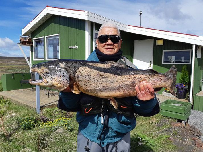 14.305 veiddir fiskar í Veiðivötnum Karl Lúðvíksson skrifar 5. ágúst 2020 09:00 Ning-De-Jesus veiddi þennan 13 punda urriða í Grænavatni og er það stærsti fiskurinn úr Veiðivötnum í sumar. Mynd: Bryndís Magnúsdóttir Veiðin í Veiðivötnum er búin að vera undir væntingum í sumar þó svo að margir hafi verið að gera ágæta veiði. Það sést þegar veiðitölur eru skoðaðar að það vantar svolítið upp á að veiðin verði á pari við það sem hún var í fyrra sem mörgum þótti heldur magurt ár. Í fyrra 2019 veiddust 20.393 fiskar, árið 2018 veiddust 19.876 fiskar, árið 2017 20.315 fiskar og svo 2016 veiddust 21.066 fiskar. Heidlarveiðin á þessu tímabili er 14.305 fiskar og það er eiginlega orðið nokkuð ljóst að heildarveiðin í vötnunum er ekki að fara ná neinu meðaltali síðustu þriggja ára. Mesta veiðin er í Snjóölduvatni þar sem 4977 fiskar hafa veiðst en þar af eru ekki nema 73 urriðar sem er ekkert skrítið því vatnið er að upplagi bleikjuvatn og þarna er hægt að mokveiða 1-2 punda bleikju. Nýjavatn hefur gefið 2.136 fiska og þar af 11 urriða. Þar er mikið af bleikju sem er um 1-2 pund en auðvitað eru stærri bleikjur inn á milli. Litli Sjór hefur gefið bestu urriðaveiðina með 1.923 fiska. Stærsti fiskurinn úr vötnunum í sumar kemur úr Grænavatni en hann var 13 pund. Stangveiði Mest lesið Tilkynning frá SVFR vegna Hítará Veiði Bleikjan horfin úr Tungufljóti? Veiði Svona á að hamfletta rjúpurnar Veiði Sjáðu 111 sm lax ganga í Laugardalsá Veiði Góð veiði í Breiðdalsá og Jökla að fara í gang Veiði Hvað á rjúpa að hanga lengi? Veiði Erlendir veiðimenn uggandi yfir líklegu eldgosi Veiði Sumarblað Veiðimannsins er komið út Veiði Síðustu dagar Köldukvíslar framundan Veiði Vefsala SVFR opnuð Veiði