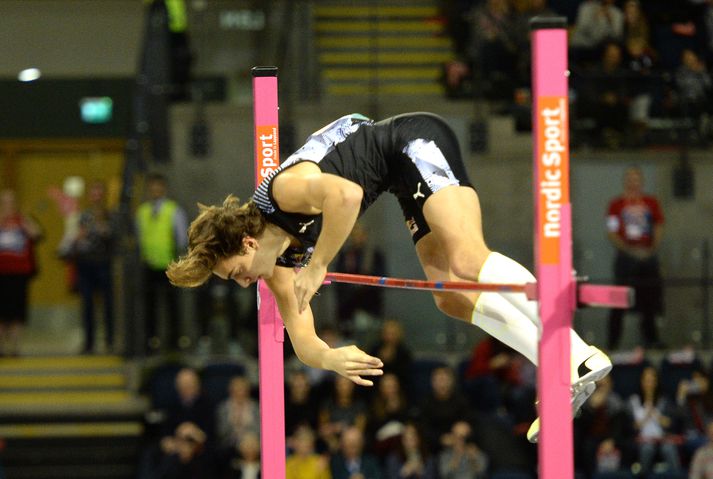 Bætti heimsmetið í annað sinn á viku Sindri Sverrisson skrifar 15. febrúar 2020 15:50 Armand Duplantis skellir sér yfir 6,18 metra og eins og sjá má á hann enn talsvert inni. vísir/getty Ný stjarna er fædd í frjálsíþróttaheiminum en hinn sænsk/bandaríski Armand Duplantis bætti í dag heimsmetið í stangarstökki í annað sinn á einni viku. Duplantis, eða Mondo eins og hann er kallaður, stökk yfir 6,18 metra í dag á innanhússmóti í Glasgow. Metið gildir einnig sem heimsmet utanhúss en fyrir viku stökk Mondo yfir 6,17 metra og bætti heimsmet Frakkans Renaud Lavillenie um einn sentímetra. What are we witnessing here?? Duplantis goes over 6.18m for a new PV World Record in Glasgow. How much did he clear this by??! pic.twitter.com/bpgJzq1zoE— Athletics World (@Athletics_World) February 15, 2020 „Ég hlakka mikið til utanhússtímabilsins,“ sagði Mondo við BBC en hann verður væntanlega áberandi á Ólympíuleikunum í Tókýó. „Ólympíuleikarnir eru það stærsta sem íþróttamaður getur tekið þátt í og þá vil ég vera upp á mitt allra besta,“ sagði Mondo. Duplantis með ávísunina sem hann fékk í dag. Það borgar sig að setja heimsmet.vísir/getty Mondo fékk 30.000 Bandaríkjadali, jafnvirði tæplega 4 milljóna króna, í vasann fyrir stökkið í dag. Hann er einnig með klásúlur í samningum við styrktaraðila sína sem færa honum drjúgan skilding með því að setja heimsmet. Mondo er fæddur og uppalinn í Bandaríkjunum og þjálfari hans er pabbi hans, Greg. Mamma hans heitir Helena og er sænsk fyrrverandi sjöþrautar- og blakkona. Frjálsar íþróttir Svíþjóð Mest lesið Sakaður um svindl á HM í pílukasti Sport Hleður Kjartan lofi eftir frábæra frumraun með Aberdeen Fótbolti Óttast að Isak hafi fótbrotnað Enski boltinn Ótrúleg tíðindi á HM í pílukasti: „Mikið sjokk“ Sport Hjalti Þór ráðinn aðalþjálfari Álftaness Körfubolti HM í pílu: Littler flaug áfram og kvöldinu lauk með spennutrylli Sport Arnór Ingvi orðinn leikmaður KR Íslenski boltinn Albert skoraði í fyrsta sigri Fiorentina Fótbolti Túfa gerir þriggja ára samning í Svíþjóð Fótbolti Dómarinn hlýtur mikið lof fyrir stundarbræði í garð Jake Paul og Joshua Sport Fleiri fréttir Hjalti Þór ráðinn aðalþjálfari Álftaness HM í pílu: Littler flaug áfram og kvöldinu lauk með spennutrylli Hleður Kjartan lofi eftir frábæra frumraun með Aberdeen Óttast að Isak hafi fótbrotnað Ótrúleg tíðindi á HM í pílukasti: „Mikið sjokk“ Sakaður um svindl á HM í pílukasti Túfa gerir þriggja ára samning í Svíþjóð Arnór Ingvi orðinn leikmaður KR Albert skoraði í fyrsta sigri Fiorentina Rúnar sótti sinn fyrsta sigur sem þjálfari Wetzlar Bæjarar aftur á sigurbraut Tvenna frá Rogers tryggði Villa sigur gegn Manchester United Kolbrún María kom við sögu í endurkomu Hannover Haukur með sjö mörk og Magdeburg rétt marði botnliðið Barcelona með fjögurra stiga forskot inn í nýtt ár Alvöru innkoma: Kjartan með stoðsendingu gegn Celtic í sínum fyrsta leik Sandra María hetjan og með þeim markahæstu í Þýskalandi Katla skoraði annan leikinn í röð Tómas Bent og félagar unnu Rangers og náðu átta stiga forskoti á toppnum Breiðablik kaupir Jónatan frá Norrköping Rúmlega áttræður Moustafa endurkjörinn forseti IHF með yfirburðum Pílukastarinn biðst afsökunar á að hafa fallið á lyfjaprófinu og öllum lygunum Næstframlagshæstur í grátlegu tapi Hildur áfram í bikarnum og Amanda enn á toppnum Fimmta sinn sem Arsenal er á toppnum um jólin: Unnu ekki titilinn í fyrstu fjögur skiptin „Viljum við að okkar verði minnst fyrir að vera skræfur?“ Fékk næstum 4,5 milljóna króna sekt fyrir að sýna dómara fingurinn Tvær títanplötur settar í Jake Paul eftir kjálkabrotið „Ef dómarinn hefði sinnt sínu starfi almennilega hefði Romero ekki fengið spjald“ Haaland gaf barnabarni Hareide gjöf Sjá meira