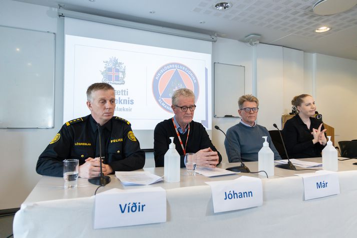 Fimm ný tilfelli af kórónuveirunni voru greind í dag og eru staðfest smit hér á landi því orðin fjórtán. Allir smituðust erlendis, ellefu komu í flugi frá Veróna og þrír frá München eftir skíðaferð í Austurríki. Fólkið er í einangrun en ekki alvarlega veikt. Einn þeirra smituðu starfar á Landspítalanaum og eru nú um tuttugu starfsmenn spítalans í sóttkví. Yfirmaður smitsjúkdóma hefur áhyggjur af því að veiran lami starfsemina. Á blaðamannafundi almannavarna kom fram að hættumat vegna kórónuveirunnar gengi út frá því að faraldurinn muni ganga yfir á nokkrum vikum; sem gætu til dæmis verið átta til tólf. „Við eigum eftir að vera hérna að tala saman og fara yfir þessa hluti í einhverja mánuði,“ sagði Víðir Reynisson, deildarstjóri hjá almannavörnum á fundinum í dag. Sálfræðingur Rauða krossins sagði heilbrigðan kvíða gagnlegan að vissu leyti. Fólk fylgi þá frekar gefnum fyrirmælum. Mikilvægt væri þó að halda ró gagnvart börnum. „Það er alveg nóg að börn viti að það sé eitthvað hræðilegt í gangi en hvað þá að mamma og pabbi eða annað fullorðið fólk í kring sé alveg að fara á límingunum. Þá er þeirra öryggi farið,“ sagði Jóhann Thoroddsen, sálfræðingur á fundinum í dag. Yfir þrjú hundruð manns eru nú í sóttkví. Talið er að búið sé að ná til allra Íslendinga sem hafa verið að koma frá áhættusvæðum. Aðrir í sóttkví eru þeir sem teljast útsettir fyrir smiti. Í því felst að einstaklingur hafi verið í innan við eins til tveggja metra fjarlægð við staðfest smit í meira en korter. Heimsóknir verða takmarkaðar vegna kórónuveirunnar. Á meðal þeirra sem eru í sóttkví eru læknar og hjúkrunarfræðingar sem starfa á Landspítalanum og voru í skíðaferð. „Það eru um og yfir 20 starfsmenn nú þegar í sóttkví. Við höfum verið að greina veirusýkingar og langflestir eru með eitthvað annað en COVID-19. En þó er starfsmaður sem er með staðfest smit og er í einangrun,“ segir Már Kristjánsson, yfirlæknir smitsjúkdómalækninga á Landspítalanum. Sá mætti ekki til vinnu eftir heimkomu en vel er fylgst með heilsu allra starfsmanna. Starfsfólk hefur raunar verið beðið um að fresta ferðalögum enda segir Már útbreiðslu meðal starfsfólks helsta áhyggjuefnið. Sem að gæti þá lamað starfsemi spítalans. „Við höfum séð dæmi um það frá Osló til dæmis að heilu sjúkrahúsin hafa verið í mikilli rekstraráhættu bara vegna veikinda starfsfólks,“ segir Már. Til að draga úr áhættu fyrir starfsfólk og sjúklinga verða heimsóknir takmarkaðar. „Við biðlum til fólks sem er með öndunarfæraeinkenni að koma alls ekki inn á sjúkrastofnanir og heldur ekki að heimsækja ættingja á öldunarstofnunum,“ segir Már. „Við viljum hafa stjórn á því hverjir eru að koma inn á spítalann þannig við missum þetta ekki úr böndunum.“