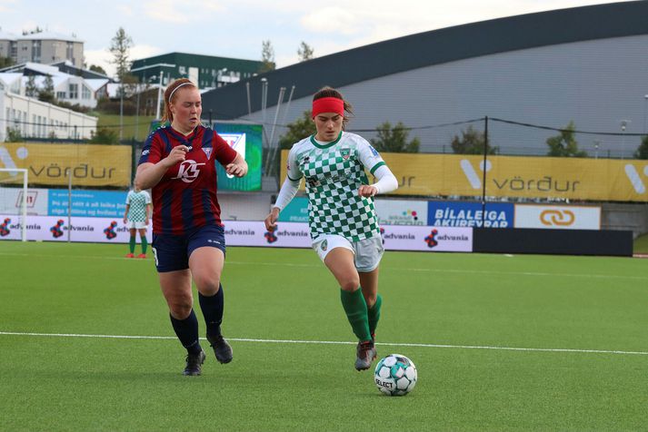 Hún var ekki lítið ánægð, Bryndís Rut Haraldsdóttir, fyrirliði Tindastóls, þegar blaðamaður Vísis heyrði í henni hljóðið í gær. Og ekki að ástæðulausu enda tryggði Tindastóll sér sæti í Pepsi Max-deild kvenna með 0-4 sigri á Völsungi á Húsavík á miðvikudaginn. Þetta er í fyrsta sinn sem Sauðárkrókur eignast lið í efstu deild í fótbolta. „Tilfinningin var ólýsanleg enda stóru markmiði loksins náð. Maður er enn að reyna ná sér niður á jörðina og trúir þessu varla,“ sagði Bryndís. Súrt í fyrra en stefndu strax upp Hún segir að stefnan hafi alltaf verið sett á að komast upp í Pepsi Max-deildina í sumar. Í fyrra var Tindastóll, sem þá var nýliði í Inkasso-deildinni, aðeins tveimur stigum frá því að komast upp í Pepsi Max-deildina. Í sumar kom svo aldrei neitt annað til greina en að klára dæmið. „Strax eftir tímabilið í fyrra ræddum við um að við ætluðum okkur meira sem hópur. Þetta var frekar súrt í fyrra. En það er virkilega gaman að vera í þessari stöðu núna, að vera búnar að tryggja þetta,“ sagði Bryndís. Tindastóll er með sjö stiga forskot á Keflavík á toppi Lengjudeildarinnar. Stólarnir hafa unnið þrettán af fimmtán leikjum sínum, gert eitt jafntefli og tapað einum leik. „Við vitum alveg hvað við höfum í kjarnanum og ætluðum okkur meira en í fyrra. Hópurinn er mjög samstíga og við erum búnar að standa okkur ótrúlega vel finnst mér,“ sagði Bryndís. Amber Michel hefur aðeins fengið á sig fimm mörk í Lengjudeildinni.vísir/sigurbjörn árni óskarsson Á síðasta tímabili var oft mikið fjör og mikið skorað í leikjum Tindastóls eins og markatalan 48-34 gaf til kynna. Varnarleikur Stólanna hefur verið miklu sterkari í ár en í fyrra og þeir aðeins fengið á sig fimm mörk í fimmtán leikjum í Lengjudeildinni. Höfum varist mjög vel „Við bættum okkar mikið í varnarleiknum og það var rosalega stórt markmið að fækka mörkunum sem við fáum á okkur. Það markmið náðist. Maður setur sér alltaf lítil markmið inni í stóra markmiðinu. Við höfum varist mjög vel sem lið,“ sagði Bryndís en Tindastóll hefur haldið hreinu í síðustu sex leikjum sínum sem allir hafa unnist. Í leikmannahópi Tindastóls eru margar heimastelpur, nokkrir leikmenn frá Akureyri og þrír erlendir leikmenn, Amber Michel, Jacqueline Altschuld og markadrottningin Murielle Tiernan sem er á sínu þriðja tímabili hjá Tindastóli. Mögnuð Murielle Tiernan, sem er 26 ára bandarískur framherji, byrjaði að spila með Tindastóli í 2. deildinni 2018. Hún skoraði þá 24 mörk í fjórtán deildarleikjum og var markahæst í deildinni. Hún skoraði einnig 24 mörk í Inkasso-deildinni í fyrra og var markadrottning hennar. Og í sumar er Tiernan búin að skora 22 mörk í fimmtán leikjum og hefur skorað helmingi fleiri mörk en næstmarkahæsti leikmaður Lengjudeildarinnar. Alls hefur Tiernan skorað 70 mörk í 46 deildarleikjum á Íslandi. „Hún er rosalega góð og lykilmaður í okkar liði. Þetta er algjör markamaskína og hún gerir aðra leikmenn í kringum sig góða. Hún er eiginlega óstöðvandi,“ sagði Bryndís sem hefur ekki trú á neinu öðru en að Tiernan láti til sín taka í Pepsi Max-deildinni næsta sumar. Murielle Tiernan er langmarkahæst í Lengjudeildinni.vísir/sigurbjörn árni óskarsson „Já, eins og hún gerði þegar við fórum úr 2. deildinni var fólk að spá í hvernig hún yrði í 1. deildinni. Hún sannaði sig strax þar og ég held hún geri nákvæmlega það sama í Pepsi Max-deildinni.“ Tindastólshjartað er stórt Bryndís hefur leikið með Tindastóli allan sinn feril. Hún lék sinn fyrsta leik með meistaraflokki 2011, þá á sextánda aldursári. Bryndís segir að það hafi í raun aldrei komið til greina að fara frá Tindastóli, jafnvel þótt misvel hafi gengið hjá liðinu. „Mér hafa ekki boðist mörg tækifæri til þess. En Tindastólshjartað er frekar stórt í mér og með þetta markmið í huga í haust var aldrei neitt annað í stöðunni en að klára það,“ sagði Bryndís sem hefur lengi stefnt að því að spila með Tindastóli í efstu deild. „Það eru mörg ár síðan ég setti mér þetta markmið. Þetta er draumur sem er að rætast og ég er enn að átta mig á þessu,“ bætti Bryndís við. Tindastóll hefur unnið sex leiki í röð án þess að fá á sig mark.vísir/sigurbjörn árni óskarsson Sauðárkrókur hefur í gegnum tíðina verið þekktari sem körfuboltabær en fótboltabær. Bryndís segir þó að stuðningurinn við fótboltann á Króknum sé góður. „Mér finnst samfélagið styðja virkilega vel við bakið á okkur. Ég held að fólk sé virkilega ánægt með okkur. Við höfum fundið fyrir miklum stuðningi og erum rosalega þakklátar fyrir hann. Það eru margir sem koma á völlinn sama hvernig veðrið er,“ sagði Bryndís. Sögulegt afrek Hún kveðst mjög stolt af því að hafa komið Tindastóli almennilega á íslenska fótboltakortið. „Þetta er sögulegt afrek sem við höfum náð og maður er enn að reyna að átta sig á því að þetta sé raunverulegt. Eins og fyrir mig. Það eru örugglega þrjú ár síðan ég ræddi um að komast upp í Pepsi Max-deildina,“ sagði Bryndís en uppgangur Tindastóls undanfarin ár hefur verið hraður. Eftir að hafa endað í 10. og neðsta sæti 1. deildar 2017 vann Tindastóll 2. deildina ári seinna. Í fyrra var liðið svo hársbreidd frá því að komast upp í Pepsi Max-deildina, eins og áður sagði, en náði stóra markmiðinu í ár. Sumarið 2021 keppir Tindastóll því við bestu lið landsins í Pepsi Max-deildinni. Stólarnir ætla sér að vinna Lengjudeildina.vísir/sigurbjörn árni óskarsson Stólarnir hlakka til að spila í efstu deild en stefna fyrst að því að vinna