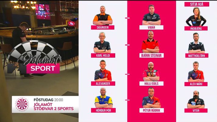 „Stöð 2 Sport hafði samband við Íslenska pílukastfélagið og hafði áhuga á covid-vænu jólamóti og við fögnuðum því. Þetta var spilað á Bullsey Darts & Drinks í Reykjavík,“ sagði Matthías Örn Friðriksson, einn þátttakanda á jólamótinu. Tólf af fremstu pílukösturum Íslands kepptu á jólamótinu. Hér fyrir meðan má sjá þá sem mættust í 1. umferðinni. Í 2. umferðinni komu svo þau Matthías, Vitor Charrua, Ingibjörg Magnúsdóttir og Alex Máni Pétursson inn. Þessi mætast í 1. umferð jólamóts Stöðvar 2 Sports Sigurgeir Guðmundsson (Pílufélag Akraness) - Viðar Valdimarsson (Píludeild Þórs) Karl Helgi Jónsson (Pílufélag Reykjavíkur) - Björn Steinar Brynjólfsson (Pílufélag Grindavíkur) Alexander Þorvaldsson (Pílufélag Grindavíkur) - Hallgrímur Egilsson (Pílufélag Reykjavíkur) Hörður Þór Guðjónsson (Pílufélag Grindavíkur) - Pétur Rúðrik Guðmundsson (Pílufélag Grindavíkur) Matthías segir að jólamótinu svipi til boðsmótsins sem Stöð 2 Sport hélt í vor. „Þetta er mjög svipað nema aðeins stærra, fleiri keppendur. Þeir voru átta á boðsmótinu en tólf núna,“ sagði Matthías. Á jóladag verður sýnt frá 1. umferðinni og 2. umferðin, undanúrslitin og úrslitaleikurinn verða sýnd á öðrum degi jóla. Bein útsending hefst báða dagana klukkan 20:00. Klippa: Jólamót Stöðvar 2 Sports