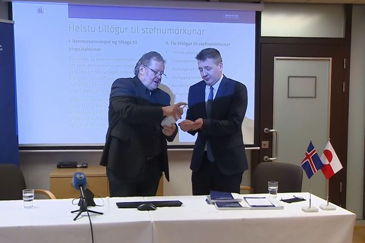 Segir Grænland vera að hrökkva í gírinn sem tilvonandi sjálfstætt ríki Kristján Már Unnarsson skrifar 21. janúar 2021 22:00 Össur sprittar Guðlaug Þór eftir að hafa afhent honum Grænlandsskýrsluna með þéttingsföstu handtaki. Arnar Halldórsson Stefnt er að því að stórefla samstarf Íslendinga og Grænlendinga og var fyrsta skrefið kynnt í dag þegar Össur Skarphéðinsson, formaður Grænlandsnefndar utanríkisráðherra, afhenti Guðlaugi Þór Þórðarsyni yfirgripsmikla skýrslu um hvernig best væri að fara að. Í skýrslunni eru 99 tillögur um hvernig megi efla tengslin milli Íslands og Grænlands en fjallað er um málið í frétt Stöðvar 2. Ráðherrann segist hafa fengið Össur til verksins vegna bæði þekkingar hans og ástríðu á málefnum Grænlendinga. Með honum í nefndinni voru Unnur Brá Konráðsdóttir og Óttar Guðlaugsson. Frá Nýlenduhöfn í Nuuk, höfuðstað Grænlands. Á hæðinni fyrir ofan húsið stendur styttan af Hans Egede, trúboðanum sem með leyfi Danakonungs fór að leita að norrænum íbúum Grænlands fyrir nærri þrjúhundruð árum en fann þá bara inúíta.Árni Harðarson Eftir vinnslu skýrslunnar segir Össur eitt standa upp úr. „Það er sóknarhugur í Grænlandi og mér finnast Grænlendingar sem þjóð og tilvonandi sjálfstætt ríki vera að hrökkva í gírinn.“ Og nefnir sem dæmi þann kraft sem er í uppbyggingu sjávarútvegs, flugvallagerð og námavinnslu. En Grænland er einnig í sviðsljósinu vegna stóraukins áhuga stórveldanna á landinu sem og Norðurslóðum. „Aukið samstarf Íslands og Grænlands mun færa báðum löndunum ávinning, bæði pólitískan en líka efnahagslegan,“ segir Össur. Fyrrverandi og núverandi utanríkisráðherra takast í hendur. „Ég myndi kyssa hann ef ekki væri covid,“ sagði Össur.Arnar Halldórsson Ráðherrann er strax byrjaður að undirbúa rammasamning milli landanna og þingsályktunartillögu. „Það hefur alltaf verið þörf fyrir það að við vinnum náið saman, þessi lönd. En aldrei meira heldur en núna,“ segir Guðlaugur Þór. „Grænland hefur verið hið gleymda land á okkar svæði en er hins vegar að koma alveg óðfluga fram á sviðsljósið vegna þess að það hefur algera sérstöðu í mörgum efnum,“ segir Össur. „Þetta eru okkar næstu nágrannar og möguleikarnir á samstarfi okkar á milli eru gríðarlega miklir. Það mun styrkja báða,“ segir Guðlaugur Þór Þórðarson utanríkisráðherra. Hér má sjá frétt Stöðvar 2: Grænland Norðurslóðir Utanríkismál Varnarmál NATO Tengdar fréttir Endurtaka útboð í gerð flugvallar á Grænlandi Flugvallafélag grænlenskra stjórnvalda, Kalaallit Airports, hefur ákveðið að bjóða út að nýju gerð flugvallar við Qaqortoq, stærsta bæ Suður-Grænlands. Þetta er endurtekning á útboði í fyrra en tilboðin sem þá bárust voru sögð hafa verið öll hátt yfir fjárhagsramma verkefnisins. Íslenski verktakinn Ístak var í hópi bjóðenda, sem valdir höfðu verið að undangengnu forvali. 17. janúar 2021 22:00 Grænlendingar semja um hærri greiðslur fyrir kvóta Grænlendingar hafa endurnýjað samninga við Evrópusambandið sem tryggja þeim andvirði þriggja milljarða íslenskra króna í árlegar tekjur af fiskveiðiheimildum í lögsögu Grænlands. Fyrirtæki í eigu Íslendinga er meðal þeirra sem nýta kvótana. 13. janúar 2021 09:09 Grænlendingar sömdu um Thule-herstöðina án undirskriftar Dana Samningar sem landsstjórn Grænlands gerði við Bandaríkjastjórn í vikunni um Thule-herstöðina, eitt hernaðarlega mikilvægasta mannvirki norðurslóða, voru án formlegrar aðildar ríkisstjórnar Danmerkur. Þetta er í fyrsta sinn sem slíkt gerist. 1. nóvember 2020 08:14 Grænlendingar kynna olíuleit norðan Íslands Grænlensk stjórnvöld hafa kynnt umhverfismat vegna fyrirhugaðrar olíuleitar við Austur-Grænland, beint norður af Íslandi. Matsskýrslan fjallar meðal annars um áhrif olíuleka á lífríki sjávar milli Íslands og Grænlands. 11. september 2020 22:35 Eldur sagður kveikja gullæði á Grænlandi Gullæði á Grænlandi. Þannig hljómar fyrirsögn eins grænlensku fjölmiðlanna eftir að fréttir bárust um stóran gullfund fyrirtækis, sem Íslendingurinn Eldur Ólafsson stendur að. 14. desember 2019 23:00 Mest lesið Ætlar ekki að beita sér í máli starfsmanns Útlendingastofnunar Innlent Sextán ára fékk greitt fyrir að færa Epstein stúlkur Erlent Hljóti að vera komið að því að skoða öryggisgæslu við skóla Innlent „Þetta er bara ljótt“ Innlent „Ég vil ekki nokkurn tímann sjá neitt svona aftur“ Innlent Milljónir til almannatengla og átta sinnum meira en í fyrra Innlent Systir og amma drengs í meðferð létust í Suður-Afríku Innlent Eyjólfur í orlof og Inga þrefaldur ráðherra Innlent Fóru um borð í vélvana rússneskt skip Erlent Grunaður um manndráp eftir að tveggja ára drengur féll úr blokk Erlent Fleiri fréttir Fjórir fluttir á sjúkrahús eftir bílveltu á Suðurlandi Leggur aftur til hverfislögreglustöð í Breiðholti Nú má heita Love, Tóní, Ranimosk og Draumur Kvartar til umboðsmanns og vonar að Vegagerðin sjái að sér Ætlar ekki að beita sér í máli starfsmanns Útlendingastofnunar „Ég vil ekki nokkurn tímann sjá neitt svona aftur“ Gyðingar á Íslandi upplifa aukinn ótta Ferðaþjónusta blómstrar í uppsveitum Árnessýslu „Þetta er bara ljótt“ Hljóti að vera komið að því að skoða öryggisgæslu við skóla Ætlar að skýra hvenær rjúfa megi þagnarskyldu Þagnarskylda heilbrigðisstarfsfólks og öryggisgæsla við grunnskóla Eyjólfur í orlof og Inga þrefaldur ráðherra Vegagerðin segir flóðin í Vík fyrirséð Fjölmiðlar, bókmenntir og hægrimennska á Sprengisandi „En hver sagði að þetta ætti að vera auðvelt?“ Mill