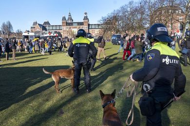 Lögreglumenn á hestum og óeirðalögreglan mættu á staðinn, beittu kylfum og lögregluhundum gegn mótmælendum eftir að þeir neituðu að yfirgefa svæðið að loknum mótmælum. Kjörstaðir opnuðu í gær vegna þingkosninga sem fara nú fram í landinu. Kjörstaðir verða opnir í þrjá daga vegna sóttvarnaaðgerða og til þess að forða því að of margir mæti á kjörstað hverju sinni. Yfirvöld höfðu gefið leyfi fyrir mótmælum, en aðeins fyrir 200 manns, en mun fleiri söfnuðust saman í miðborginni. Lestarsamgöngur inn í borgina voru stöðvaðar um tíma til þess að koma í veg fyrir að fleiri bættust í hóp mótmælenda. Lögregla handtók einhverja við mótmælin en nákvæm tala er óþekkt. Einhverjir voru handteknir í mótmælunum en óvíst er hve margir það voru.EPA-EFE/EVERT ELZINGA Myndband sem er í dreifingu á netinu sýnir lögreglumenn berja mótmælanda sem liggur í jörðinni með kylfum. Að sögn lögreglu hafði maðurinn ráðist á lögreglumenn með priki. Þá greindi hollenska lögreglan frá því í dag að lögreglumenn hafi skotið viðvörunarskoti af byssu þegar verið var að rýma svæðið. Það mál er nú til rannsóknar. „Það kann að vera að hér sé veira en það að loka öllu samfélaginu er allt of langt gengið,“ sagði Michel Koot, 68 ára mótmælandi, í samtali við fréttastofu AFP í dag. „Ég hef tekið eftir því að það er mjög auðvelt að taka mörg okkar réttindi í burt á augabragði og meirihluti fólks tekur ekki einu sinni eftir því en það er margt í gangi. Ég hef áhyggjur af því hvað þetta mun gera barnabörnum mínum,“ sagði hann. Lögregla nálgast fólk, sem mótmælir kórónuveiruaðgerðum, í Amsterdam í febrúar.EPA-EFE/EVERT ELZINGA Þetta eru ekki fyrstu mótmælin vegna sóttvarnaaðgerða sem farið hafa fram í Hollandi. Eftir að útgöngubann frá klukkan 21 til 4:30 var innleitt í janúar var mótmælt í fjölda hollenskra borga. Útgöngubann hafði þá ekki verið sett á frá því að Nasistar hertóku landið í síðari heimstyrjöld. Útgöngubannið mun gilda að minnsta kosti þar til í lok mars. Allar verslanir og fyrirtæki sem ekki eru talin nauðsynleg eru lokuð. Fleiri en tveir mega ekki koma saman. Meira en 1,1 milljón manns hafa greinst smitaðir af kórónuveirunni í Hollandi frá upphafi faraldursins og meira en 16 þúsund hafa látist af völdum hennar.