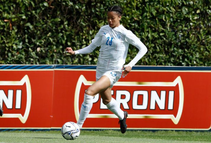 Hin 19 ára gamla Sveindís hafði átt draumabyrjun í atvinnumennsku með liði Kristianstad nú í apríl – greinilega tilbúin til að taka sænsku úrvalsdeildina með trompi. Aftonbladet sagði að hún yrði hreinlega fljótt of góð fyrir deildina og hún var valin besti leikmaður síðasta mánaðar í deildinni. Á föstudagskvöld, í fyrri hálfleik í leik við Växjö á útivelli, virtist draumurinn hins vegar hafa breyst í martröð. Sveindís meiddist í hné og var borin af velli. Sif Atladóttir, liðsfélagi hennar, sat með henni inni í klefanum og hughreysti hana, á meðan að leikurinn hélt áfram, og ekkert benti til þess að aðeins væri um beinmar að ræða en ekki krossbandsslit: „Ég fann rosalega til í hnénu við að lenda í þessu og vissi ekkert hvað hefði komið fyrir. Síðan fóru allir að tala um að krossbandið væri slitið og ég var ótrúlega stressuð. Ég var því meira stressuð en að mér væri illt,“ segir Sveindís í samtali við Vísi. Klippa: Sveindís Jane meiddist Myndband af því þegar hún meiddist má sjá hér að ofan. Sveindís meiddist á föstudag en fékk ekki að vita fyrr en á mánudag að meiðslin væru ekki næstum því eins alvarleg og útlit var fyrir. Ef krossband hefði slitnað hefði Sveindís ekki spilað meiri fótbolta á þessu ári en hún ætti að geta snúið til baka á völlinn um miðjan júní. Læknirinn skildi ekki hvernig krossbönd héldust óslitin „Allir sem sáu vídjóið virtust vissir um að krossbandið hefði slitnað og það sögðu líka læknar hérna í Svíþjóð þegar þeir sáu atvikið. Þetta leit því ekki vel út fyrir mig. Ég var orðin ótrúlega svekkt með að missa af undankeppni HM með landsliðinu [sem hefst í september] og Meistaradeildinni með Kristianstad – ég var bara komin þangað í huganum. Þess vegna var alveg geggjað að heyra að þetta væri ekki krossbandið,“ segir Sveindís. Sveindís Jane Jónsdóttir hefur slegið í gegn í appelsínugulu treyju Kristianstad.Instagram/@kristianstadsdff Læknirinn sem kvað upp úr um að um beinmar væri að ræða furðaði sig á því að krossbandið skildi ekki hafa slitnað. Liðbönd héldust einnig heil. Það rímar reyndar kannski vel við einstaka, líkamlega burði Sveindísar að hún komi læknum á óvart: „Þetta var greinilega mjög fær læknir sem vissi allt um krossbandaslit. Hann skildi hins vegar ekki hvernig á því gat staðið að krossbandið væri ekki farið. Öll liðbönd eru í lagi en ég er með beinmar á hnéskelinni. Þetta fór einhvern veginn þannig að lærleggsbeinið og hnéskelin skullu saman, og þess vegna heyrði ég skell í hnénu þegar ég lenti. Það ætti að taka sex vikur að jafna sig af svona beinmari,“ segir Sveindís. Sveindís Jane Jónsdóttir lék vináttulandsleikina tvo gegn Ítalíu 10. og 13. apríl, og sló svo strax í gegn í fyrstu leikjum sínum í sænsku úrvalsdeildinni.Getty/Matteo Ciambelli Sveindís kemur til með að missa af fimm leikjum með Kristianstad sem og landsliðsverkefni í næsta mánuði sem reyndar er ekki ljóst hvert verður. Hún ætti að geta snúið aftur til leiks um miðjan júní, eftir landsleikjahléið: „Ég má hjóla í þessari viku og þarf bara að fara eftir því hvernig mér líður í hnénu. Ég get sömuleiðis farið að hlaupa um leið og mér líður þannig – það gæti allt eins orðið í næstu viku. Mér finnst ég líka verða betri og betri með hverjum deginum.“ Sif hjálpaði mér mjög mikið Eins og fyrr segir átti Sveindís frábæra byrjun í sænsku úrvalsdeildinni, eftir að hafa orðið Íslandsmeistari með Breiðabliki í fyrra. Hún skoraði í fyrstu tveimur leikjunum í Svíþjóð og lagði upp eitt mark, og er Kristianstad með sjö stig eftir fyrstu þrjá leikina: „Ég var mjög sátt með þessa fyrstu leiki fram að meiðslunum. Þetta er búið að vera mjög næs hérna í Kristianstad, umhverfið hér er geggjað og gott að hafa Íslendinga í kringum sig. Ég fíla mig mjög vel hér,“ segir Sveindís og það kom henni ekki frekar en öðrum á óvart að hún myndi spjara sig vel í sterkari deild: „Nei, nei. Ég er líka með svo góða leikmenn í kringum mig sem að aðstoða mig mikið. Ég næ alveg að blómstra vel með þessa leikmenn í kringum mig. Þær hafa mjög mikið að segja um góða frammistöðu mína.“ Sif Atladóttir hældi Sveindísi á hvert reipi í viðtali við Vísi á dögunum og Sveindís er ekki síður hæstánægð með sinn nýja liðsfélaga, sem er að komast í gang eftir að hafa eignast sitt annað barn. „Það er alveg geggjað að hafa Sif hérna. Þegar ég meiddist þá var hún bara með mér inni í klefa alveg þangað til að hún þurfti að fara að hita upp því hún átti að koma inn á í leiknum. Hún hjálpaði mér mjög mikið þarna. Svo er líka bara alltaf hægt að tala við hana eða kíkja til hennar í mat. Hún er svo frábær.“