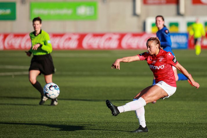 Glæsimarkið sem braut nýliðamúrinn, Hólmfríður sýndi að ákvörðunin var rétt og mörkin á Hlíðarenda Sindri Sverrisson skrifar 6. maí 2021 16:31 Mary Alice Vignola lék sinn fyrsta deildarleik fyrir Val í gær eftir komuna frá Þrótti í vetur. vísir/vilhelm Nýliðar Tindastóls þurftu ekki að bíða lengi eftir sínu fyrsta marki og fyrsta stigi í efstu deild í fótbolta frá upphafi, eftir að leiktíðin í Pepsi Max-deild kvenna hófst. Liðið var hársbreidd frá sigri gegn Þrótti. Fyrstu umferð deildarinnar lauk með þremur leikjum í gærkvöld. Mörkin úr leikjunum og viðtöl má sjá í myndbandinu hér að neðan. Klippa: Þrír leikir í fyrstu umferð Pepsi Max-deildar kvenna Hugrún Pálsdóttir skoraði fyrsta mark Tindastóls í efstu deild fyrir framan stuðningsmennina í brekkunni á Sauðárkróki. Staðan var 1-0 fram í uppbótartíma þegar Katherine Cousins skoraði stórglæsilegt mark úr aukaspyrnu og jafnaði metin. Valur vann 2-1 sigur á Stjörnunni. Ída Marín Hermannsdóttir skoraði fyrra mark Vals og Anna Rakel Pétursdóttir nýtti sér klaufaskap í vörn Stjörnunnar til að bæta við öðru snemma í seinni hálfleik. Hildigunnur Ýr Benediktsdóttir minnkaði muninn á 77. mínútu. Selfoss vann svo 3-0 útisigur gegn nýliðum Keflavíkur. Brenna Lovera skoraði fyrstu tvö mörk Selfoss, það seinna úr víti. Hin 36 ára gamla Hólmfríður Magnúsdóttir, sem ákvað að hætta við að leggja skóna á hilluna í vetur, innsiglaði sigurinn. Tveir leikir voru á dagskrá í fyrrakvöld og má sjá mörkin úr þeim leikjum í greininni hér að neðan. Pepsi Max-deild kvenna Tindastóll Valur UMF Selfoss Tengdar fréttir Umfjöllun og viðtöl: Keflavík - Selfoss 0-3 | Nýliðarnir fengu skell Nýliðar Keflavíkur tóku á móti Selfossi í fyrstu umferð Pepsi Max-deildar kvenna og það voru gestirnir sem fóru frá Reykjanesbæ með stigin þrjú. 5. maí 2021 21:10 Umfjöllun og viðtöl: Valur - Stjarnan 2-1 | Valskonur sluppu með skrekkinn Valur vann 2-1 sigur á Stjörnunni í fyrsta leik sínum í Pepsi Max-deild kvenna í kvöld. Ída Marín Hermannsdóttir og Anna Rakel Pétursdóttir skoruðu mörk Vals en Hildigunnur Ýr Benediktsdóttir mark Stjörnunnar. 5. maí 2021 21:54 Umfjöllun: Tindastóll - Þróttur 1-1 | Úrvalsdeildarævintýrið hófst á grátlegu jafntefli Tindastóll og Þróttur Reykjavík skildu jöfn, 1-1, í fyrstu umferð Pepsi Max-deildar kvenna í fótbolta í kvöld. Tindastóll komst grátlega nálægt sigri í sínum fyrsta leik í efstu deild en aukaspyrnumark í uppbótartíma bjargaði stigi fyrir Þrótt. 5. maí 2021 20:00 Mest lesið Þessi tíu eru tilnefnd sem Íþróttamaður ársins 2025: 23 ára aldursmunur Sport Sakaður um niðurlægingu: „Við viljum ekki hafa hann sem þjálfara“ Handbolti Einn leikmaður með samning og völlurinn ólöglegur Fótbolti Áfallið staðreynd og Isak búinn í aðgerð Enski boltinn Vildi tapa legg: „Mesti hávaði sem ég hef heyrt“ Sport Salah færði Egyptum draumabyrjun Fótbolti Steraleikarnir segi ungu fólki að það sé aldrei nógu fullkomið Sport Sagði látna systur sína hafa tryggt sigurinn ótrúlega Sport Dagskráin í dag: Kæst yfir NFL, pílu og enska boltanum Sport Körfuboltakvöld: Tilþrif tímabilsins til þessa Körfubolti Fleiri fréttir Meira en 37 stöðugildi hjá Knattspyrnusambandi Íslands Óskar Hrafn um komu Arnórs Ingva: „Gífurlega dýrmætt fyrir KR“ Arnór Ingvi orðinn leikmaður KR Breiðablik kaupir Jónatan frá Norrköping Elías mættur til meistaranna KR sagt vera að landa Arnóri Ingva Hilmar Árni til starfa hjá KR Segir fjórðung í bók Óla ósannan Víkingur í úrslit Bose-bikarsins eftir sigur „Verið heiður að spila í appelsínugulu með frábærum liðsfélögum“ Þekkir Egilshöllina vel og skoraði gegn fyrrum félögum Strákar Heimis Guðjóns fengu slæman skell í fyrsta leik Axel verður áfram hjá Aftureldingu Kveður pabba sinn í Laugardalnum og fer til FH „Félag sem var í basli með að ná endum saman og greiða laun á réttum tíma“ Skrýtið og taktlaust: „Ég er ekkert sátt með niðurstöðuna“ Fanndís kveður sviðið: „Ég er búin að fella nokkur tár“ Gylfi með tvö og Víkingar byrja á sigri Frá Akureyri til Danmerkur Markadrottningin heldur að landsliðið sé búið spil Strákarnir í 2. flokki Vals þeir einu sem ekki spila fyrir áramót Dæturnar vildu norður: „Mun alltaf gera allt fyrir þær“ Stjarnan sækir markvörð í 3. deildina „Ég var orðinn algjörlega bugaður“ Jónatan áfram á Hlíðarenda: „Var alltaf jákvæður fyrir því að framlengja“ Óli Jó kallar ráðninguna á Jóa Kalla algjört bull „Ég elska þig Ísland, takk fyrir allt!“ Sextán ára með fernu fyrir meistara Víkings Valur dregur sig úr Bose-bikarnum „Sagði bara við hann: Djöfulsins fíflið þitt“ Sjá meira