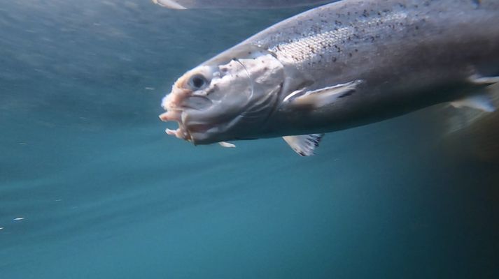 Myndirnar hafa farið sem eldur um sinu um samfélagsmiðla síðustu daga og vakið nokkurn óhug fólks. Á þeim má sjá mjög illa særða laxa sem synda um sjókvíar fyrirtækjanna Arnarlax og Arctic Fish í Dýrafirði og Arnarfirði. Þessi lítur ekki sérlega vel út.veiga grétarsdóttir Ekki algengt vandamál Hrönn Ólína Jörundsdóttir, forstjóri Matvælastofnunar (MAST), telur að illa farinn lax sé ekki algengt vandamál hjá fiskeldisfyrirtækjum. MAST tekur myndunum þó alvarlega og mun skoða hvort málið kalli á viðbrögð frá stofnuninni: „Við erum að fara yfir málið og skoða hvað gerðist. Hvað fór úrskeiðis hjá fyrirtækinu og erum að skoða það hvort að við bregðumst við á einhvern hátt eða hvort við teljum að viðbrögð fyrirtækisins við atvikinu séu nægjanleg,“ segir Hrönn. Er þetta algengt vandamál í sjókvíum landsins? „Ég held að þetta sé nú ekki algengt vandamál en það eru náttúrulega afföll af fiskunum í fiskeldi almennt og það er alltaf það sem við teljum vera eðlileg afföll eins og er í öllu dýraeldi. Afföllin eru yfirleitt mest til að byrja með, á seiðastiginu, og svo minnka afföllin eftir því sem fiskarnir verða eldri en það er þá verið að skoða hvort þetta séu eðlileg afföll eða ekki.“ Illa farið hrognkelsi úr sjókví. veiga grétarsdóttir Svo særður lax fer ekki á diskinn Náttúruverndarsamtök hafa lengi lagst gegn opnu sjókvíaeldi við strendur landsins. Instagram-síðan Vissiru kom nýlega fram en hún birtir þar ýmsar fullyrðingar um neikvæðar hliðar laxeldisins. Ein skilaboð þeirra hafa farið víða á samfélagsmiðlinum undanfarna daga; mynd af afar særðum laxi með yfirskriftinni: „Vissiru að laxinn sem þú borðar gæti hafa litið svona út?“ View this post on Instagram A post shared by @vissiru „Það eru alltaf einhverjir fiskar sem að særast og það er þá á ábyrgð fyrirtækjanna að finna þessa fiska, ef þeir særast, smitast eða fá bakteríusýkingu í sár. Að veiða þá og aflífa þá svo að þeir þurfi ekki að þjást,“ segir Hrönn. Getur laxinn sem við borðum litið svona út? „Nei, fyrirtækin eru ekki að aflífa svona fisk og selja hann til matar. Þau eru að aflífa honum og farga honum. Þegar löxunum er slátrað eru þeir teknir upp úr sláturkví og þeim er slátrað öllum í einu. Í þessu tilviki held ég að þetta séu bara einhverjir fiskar sem hafi orðið eftir og fyrirtækinu hefur yfirsést að finna.“ Eftirlit sé nægt með fyrirtækjunum Náttúruverndarsamtök hafa lengi kallað eftir betra eftirliti með sjókvíaeldi á Íslandi. Hrönn telur MAST þó vel í stakk búna til að halda vel utan um eftirlit með geiranum. „Já, ég held að við höfum svona flest tól og tæki til að hafa eftirlit með þessum fyrirtækjum. Og við í raun og veru líka skoðum innra eftirlit fyrirtækjanna. Fyrirtækin sjálf eru með eigið eftirlit sem við þá skoðum og athugum hvort að sé nægjanlegt,“ segir hún. Lax sem lítur svona út ætti aldrei að enda á disk neytenda.veiga grétarsdóttir „Það má líka benda á til dæmis að nú er komið í loftið mælaborð fiskeldis, þar sem fyrirtækin þurfa að senda inn til okkar framleiðslutölur mánaðarlega og þá skoðum við þær og höfum meðal annars þá eftirlit með því hvort afföllin séu orðin óeðlileg, hvort það sé eitthvað sem hefur komið upp á, hvort það séu veikindi og sýkingar eða komið upp slys. Þannig fylgjumst við með fyrirtækjunum, þau senda mánaðarleg gögn til okkar og svo förum við einnig í eftirlitsferðir til þeirra.“