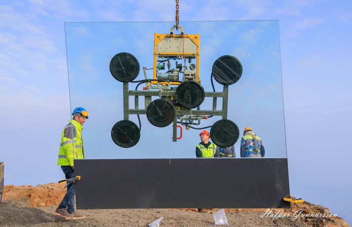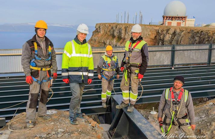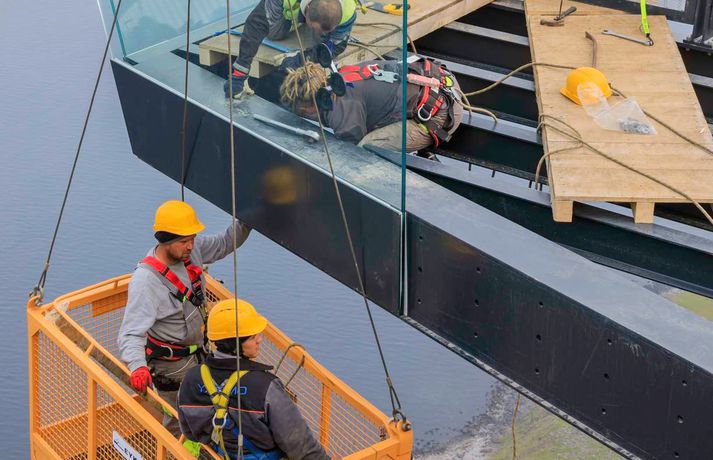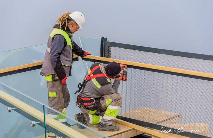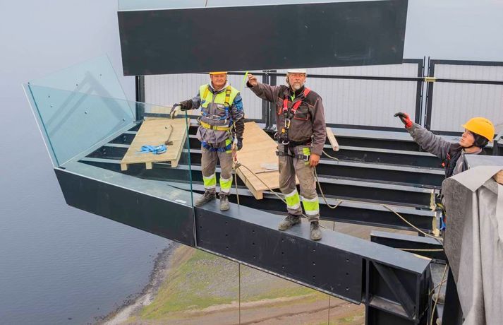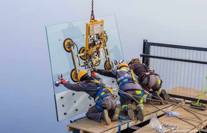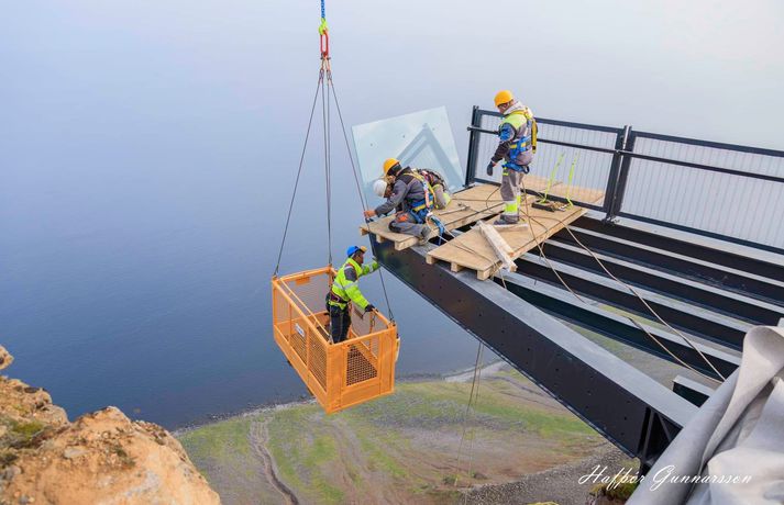 Pallurinn var smíðaður í Póllandi og fluttur til landsins, þar sem hann var boraður inn í fjallið. Nú hefur útsýnisglerið verið sett á fremsta punkt pallsins, en þar munu þeir allra hugrökkustu njóta stórfenglegs útsýnis yfir Ísafjarðardjúpið. Hafþór Gunnarsson Öryggislínur eru festar í vinnuhópinn, þar sem meira en sex hundruð metra fall er niður í hafið fyrir neðan.Hafþór Gunnarsson Iðnaðarmenn hafa undið hörðum höndum að verkefninu í yfir sex hundruð metra hæð. Eins og sjá má á meðfylgjandi myndum eru þetta einstaklega krefjandi og hættulegar aðstæður. Hafþór Gunnarsson hefur myndað verkefnið frá upphafi og þannig skrásett þessa einstöku framkvæmd. Sallarólegir á stálbitum í 640 metra hæð.Hafþór Gunnarsson Einbeitingin í hámarki.Hafþór Gunnarsson Eins og komið hefur fram í umfjöllun okkar um verkefnið veitti Framkvæmdasjóður ferðamannastaða 160 milljónum króna til byggingar pallsins. Búast má við því að pallurinn verði einn vinsælasti ferðamannastaður Vestfjarða. Fylgst með að allt gangi vel fyrir sig.Hafþór Gunnarsson Fleiri myndir frá Hafþóri má sjá í myndaalbúminu hér fyrir neðan. Einstaklega krefjandi vinnuaðstæður en útsýnið er að minnsta kosti frábært.Hafþór GunnarssonÞað er ekki hver sem er sem hefði getað tekið af sér að vinna að útsýnispallinum á Bolafjalli.Hafþór GunnarssonHandriðið er komið á sinn stað og lokamynd að koma á pallinn.Hafþór GunnarssonÖryggisglerið flutt á réttan stað.Hafþór GunnarssonHafþór GunnarssonHafþór GunnarssonVonast er til þess að pallurinn verði einn vinsælasti ferðamannastaður Vestfjarða.Hafþór GunnarssonHafþór GunnarssonHafþór GunnarssonHafþór GunnarssonHandriðinu komið fyrir í þokunni.Hafþór GunnarssonHafþór Gunnarsson