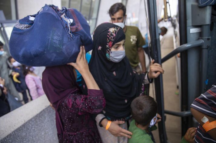 Tvær afganskar fjölskyldur komnar og fleiri á leiðinni Kjartan Kjartansson skrifar 28. ágúst 2021 13:16 Afgansk fjölskylda við komuna til Washington-borgar í Bandaríkjunum. Þúsundir Afgana hafa þegar flúið land undan yfirvofandi stjórn talibana en mun fleiri sitja eftir með sárt ennið. Vísir/EPA Tvær afganskar konur sem stunduðu nám í Jafnréttisskólanum Gró á Íslandi eru komnar til landsins með fjölskyldum sínum. Utanríkisráðuneytið veit af fjórum Afgönum til viðbótar sem eru á leiðinni til landsins. Ríkisstjórnin samþykkti tillögu flóttamannanefndar um að taka á móti allt að 120 manns frá Afganistan í vikunni. Ætlunin er að styðja við fjölskyldur fólks sem eru þegar á Íslandi og á rétt á fjölskyldusameiningu, einstaklinga í bráðahættu vegna starfa, ýmist fyrir Atlantshafsbandalagið eða í jafnréttismálum. Það síðastnefnda á við um fjölskyldurnar tvær sem komu til landsins í gær. Mbl.is sagði frá komu þeirra í gærkvöldi. Sveinn Guðmarsson, upplýsingafulltrúi utanríkisráðuneytisins, segir við Vísi að þar séu á ferð tvær konur sem dvöldu á Íslandi við nám í því sem þá kallaðist Jafnréttisskóli Sameinuðu þjóðanna en kallast nú Jafnréttisskólinn Gró og fjölskyldur þeirra, alls sex manns. Fólkið kemur hingað með milligöngu danskra stjórnvalda. Það fékk flugfar með Dönum frá Afganistan, fyrst til Islamabad í Pakistan og síðan áfram til Kaupmannahafnar. Þá segir Sveinn að ráðuneytið viti af því að fjórir Afganar sem hafa dvalarleyfi á Íslandi séu einnig á leið til landsins. Ráða fólki frá því að fara að flugvellinum Loftbrú sem vestrænar þjóðir hafa haldið út frá flugvellinum í Kabúl er nú við það að lokast. Bresk stjórnvöld segjast ætla að ljúka brottflutningi í dag og bandarískt herlið ætlar að fara alfarið frá landinu á þriðjudag. Sveinn segir að vegna þessa ráði íslensk stjórnvöld öllu því fólki sem þau hafa verið í sambandi við í Afganistan frá því að fara út á flugvöll í Kabúl. Á annað hundrað manns féll í sjálfsmorðssprengjuárás í mannþröng fyrir utan flugvöllinn á fimmtudag. Hryðjuverkasamtökin Ríki íslams í Afganistan lýstu yfir ábyrgð á ódæðinu. Bandarísk stjórnvöld búast við því að frekari hryðjuverk gætu verið framin nú síðustu daga brotthvarfsins frá Kabúl. Framhaldið í komum afganskra flóttamanna til Íslands er því óljóst. Sveinn segir að samþykkt ríkisstjórnarinnar um móttöku flóttafólks standi óháð því hver staðan í landinu í augnablikinu. Íslensk stjórnvöld hafa þegar lýst sig tilbúin að taka við að minnsta kosti tuttugu fyrrverandi starfsmönnum Atlantshafsbandalagsins og fjölskyldum þeirra frá Afganistan. Afganistan Flóttafólk á Íslandi Utanríkismál Tengdar fréttir Taka við allt að 120 flóttamönnum frá Afganistan Íslensk stjórnvöld áætla að taka á móti allt að 120 flóttamönnum frá Afganistan en heildarfjöldi liggur ekki endanlega fyrir. Ríkisstjórnin samþykkti í morgun tillögur flóttamannanefndar vegna þess ástands sem skapast hefur í Afganistan í kjölfar valdatöku Talibana. 24. ágúst 2021 11:22 Mest lesið Virðist ekki vera hægt á Íslandi Innlent Hiti geti mest náð átján stigum Veður Hyggst kæra dyraverði Auto til lögreglu Innlent „Ótrúlega sorglegt að pabbi sé búinn að vera svona lengi í þessari stöðu“ Innlent Ný könnun Maskínu: „Væri alveg ný staða í íslenskum stjórnmálum“ Innlent Gaf fingurinn á Miklubraut Innlent Stytting framhjá Blönduósi ekki á samgönguáætlun Innlent „Bandaríkin eiga ekki að taka yfir Grænland“ Erlent Breiddi út faðminn fyrir rasista: „Þið þurfið ekki að biðjast afsökunar á að vera hvít lengur“ Erlent „Ég hef aldrei upplifað annan eins harm“ Innlent Fleiri fréttir Virðist ekki vera hægt á Íslandi Stytting framhjá Blönduósi ekki á samgönguáætlun Vestmannaeyingar fá að eiga Vestmannaeyjar Hyggst kæra dyraverði Auto til lögreglu „Ótrúlega sorglegt að pabbi sé búinn að vera svona lengi í þessari stöðu“ Höfðu samband við dönsku herstjórnina á Grænlandi Ný könnun Maskínu: „Væri alveg ný staða í íslenskum stjórnmálum“ Glæný Maskínukönnun og jólaóveður Ársæll hringdi beint í utanríkisráðherra eftir fundinn Ósannað að fimmtán ára stúlka hafi stungið sextán ára pilt tvisvar Sameina Farice, Öryggisfjarskipti og hluta Neyðarlínunnar Gaf fingurinn á Miklubraut Birtir drög að lögum um lagareldi: Hyggst leggja niður Fiskeldissjóð Hundrað og fjörutíu milljarða bótakrafa á Samherja sé súrrealísk Skemmdir í kirkjugörðum vegna aksturs utan vegar Ólýsanlegur harmur fyrir fjölskylduna og söfnun hleypt af stokkunum „Ég hef aldrei upplifað annan eins harm“ Vill leiða lista Sjálfstæðismanna í Reykjanesbæ „Þetta hefur verið þungur tími“ Naut aðstoðar samskiptasérfræðinga vegna veiðigjaldamálsins Hrindir af stað söfnun fyrir móður stúlkunnar sem lést í Suður-Afríku Varð vitni að ótrúlegum norðurljósum: „Mér fannst þetta magnað“ Færir nýársboðið fram á þrettándann Fjórir fluttir á sjúkrahús eftir bílveltu á Suðurlandi Leggur aftur til hverfislögreglustöð í Breiðholti Nú má heita Love, Tóní, Ranimosk og Draumur Kvartar til umboðsmanns og vonar að Vegagerðin sjái að sér Ætlar ekki að beita sér í máli starfsmanns Útlendingastofnunar „Ég vil ekki nokkurn tímann sjá neitt svona aftur“ Gyðingar á Íslandi upplifa aukinn ótta Sjá meira