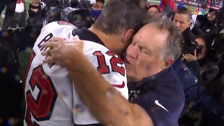„Ég hef ekki séð svona þurrt knús síðan ég knúsaði fyrrverandi kærustuna mína í Krónunni“ Hjörtur Leó Guðjónsson skrifar 6. október 2021 07:32 Tom Brady og Bill Belichick fallast í faðma. Mynd/Skjáskot Tom Brady snéri aftur á sinn gamla heimavöll með nýju liði þegar að Tampa Bay Buccaneers heimsóttu New England Patriots í NFL-deildinni í amerískum fótbolta í gærnótt. Vel var tekið á móti gömlu hetjunni, en sérfræðingar í Lokasókninni fóru yfir endurkomu Brady í þætti sínum í gær. Henry Birgir Gunnarsson, Magnús Sigurjón Guðmundsson og Gunnar Ormslev fóru yfir nýliðna umferð í NFL-deildinni, og þar bar auðvitað hæst að nefna endurkomu Tom Brady á sinn gamla heimavöll. „Það var vel tekið á móti honum, og það var mikil kurteisi og virðing,“ sagði Henry Birgir í upphafi innslagsins. „Þetta var svolítið magnað að sjá þetta og heyra virðinguna. Hann heilsaði upp á alla, hann þekkir náttúrulega hvern einasta húsvörð þarna.“ Strákarnir voru þó sammála um það að ekki hafi allir verið jafn ánægðir að sjá Brady aftur, en þeim fannst hans fyrrum þjálfari, Bill Belichick, hálf áhugalaus þegar hann tók á móti sínum gamla leikmanni. „Sjáiði hérna. Hérna kemur styðsta faðmlag mannkynssögunnar. Sjáiði hvað þetta verður fallegt og einlægt þegar að Bill Belichick mætir til tjah, sonarins. Þetta er nú bara eins og sonur hans,“ sagði Henry. „Þetta var svo hratt að við urðum að sýna það hægt.“ „Ég hef ekki séð svona þurrt knús síðan ég knúsaði fyrrverandi kærustuna mína í Krónunni. Vandræðalegt,“ sagði Magnús þegar að faðmlag Belichick og Brady var sýnt á skjánum. Strákarnir fóru svo betur yfir leikinn sjálfan, en innslagið í heild sinni má sjá í spilaranum hér fyrir neðan. Klippa: Endurkoma Tom Brady NFL Lokasóknin Mest lesið Arnar Daði rekinn frá Stjörnunni en áfram þjálfari kvennaliðsins Handbolti Koepka fyrsta stjarnan sem riftir samningi við LIV Golf Ótrúlegur sigur á HM: „Ég er mjög tregur svo pressan nær ekki til mín“ Sport „Þetta er stærsti klúbbur Íslands“ Íslenski boltinn Man. Utd reyndi stíft en Semenyo kaus City Enski boltinn Þessi tíu eru tilnefnd sem Íþróttamaður ársins 2025: 23 ára aldursmunur Sport Sagan ekki sönn: „Veit ekki hvaðan þetta á að hafa komið“ Íslenski boltinn Öll höllin æpti nafn Gísla í spennutrylli Handbolti Stefndi á ÓL en fannst látinn á hótelherbergi Sport Arsenal í undanúrslit eftir vító Enski boltinn Fleiri fréttir Ekkert spilað í vetur en gæti mætt Íslandi í fyrsta leik á EM Stefndi á ÓL en fannst látinn á hótelherbergi „Þetta er stærsti klúbbur Íslands“ Ótrúlegur sigur á HM: „Ég er mjög tregur svo pressan nær ekki til mín“ Koepka fyrsta stjarnan sem riftir samningi við LIV Kaupmannahafnarbúi afgreiddi Úganda Arsenal í undanúrslit eftir vító Arnar Daði rekinn frá Stjörnunni en áfram þjálfari kvennaliðsins Man. Utd reyndi stíft en Semenyo kaus City Öll höllin æpti nafn Gísla í spennutrylli Iwobi og Lookman áberandi í sigri Nígeríu „Tölfræðilega séð eiga þeir ekkert að vera í þessari stöðu“ Guðrún Brá og Gunnlaugur Árni slógu best í ár Amanda hætt hjá Twente Jackson hóf Afríkumótið með látum Fullkrug leysir Origi af í Mílanó Versta tímabil Vinícius í mörg ár og samningaviðræður sigla í strand Kongóliðar byrja á sigri Glódís framlengir samninginn við Bayern Chelsea setur sig í samband við Semenyo Sagan ekki sönn: „Veit ekki hvaðan þetta á að hafa komið“ Hætt við að spila í Ástralíu en óvíst hvar leikurinn verður Neymar kominn á lappir og lofar að skora í úrslitaleik HM Tryggðu þrjú lið í úrslitakeppnina Jiménez jafnaði bestu vítaskyttu sögunnar Kansas frá Kansas til Kansas Slot mun sakna Isak í tvo mánuði eftir „glórulausa tæklingu“ Sjáðu „auma“ vítið sem skilaði Fulham sigri Hápunktur ársins að jafna pabba á heimavelli Missti alveg stjórn á skapinu en það skilaði sigri Sjá meira