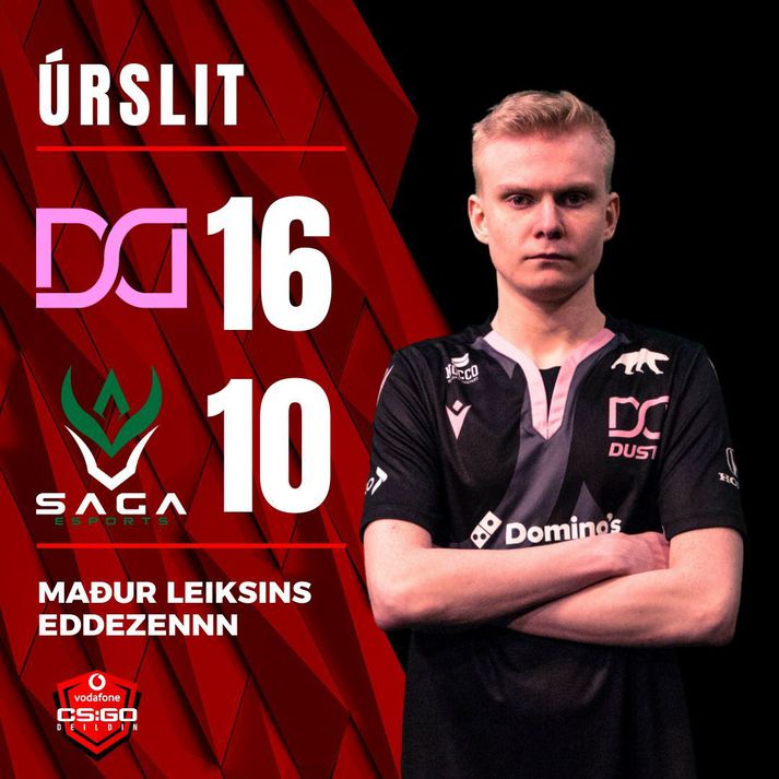 Dusty hafði betur gegn Sögu Snorri Rafn Hallsson skrifar 13. október 2021 15:46 Fyrir leikinn þótti lið Dusty sigurstranglegra, enda nýbúnir að rúlla yfir reynsluboltana í Ármanni í síðustu viku þar sem þjálfarinn Clvr lék stórt hlutverk. Leikmenn Sögu átti svo harma að hefna eftir að hafa staðið uppi í hárinu á sterku liði XY í síðasta leik sínum en tapað að lokum. Dusty og Saga mættust í Nuke kortinu sem bæði lið þekkja bæði afar vel. ADHD, leikmaður Sögu getur gert góða hluti þar á vappanum og var því spennandi einvígi milli hans og Thor í kortunum. Saga vann hnífalotuna og fékk því að byrja í vörn (Counter-Terrorists). Liðið mætti sjóðheitt til leiks og krækti sér í fyrstu þrjár loturnar. Pandaz felldi þrjá í fyrstu lotu og næstu tveimur var bjargað fyrir horn af þeim félögum Brnr og ADHD. Sigrarnir reyndust þó dýrir og fjárhagurinn var ekki upp á sitt besta. Í fjórðu lotu keypti Dusty AK á línuna en Saga þurfti að spara við sig í vopnakaupum og búnaði. Dusty nýtti það til að tryggja sér völdin á útisvæðinu og sigla fram úr Sögu. Saga gafst þó alls ekki upp og tókst að jafna leika og munaði þar um ADHD á vappanum til að koma Sögu í yfirtölu snemma í lotunum. Thor spýtti þá í lófana og tók að fella ADHD í staðinn og þannig gátu leikmenn Dusty þétt sínar raðir og náð stjórn á hálfleiknum. Staða í hálfleik: Dusty 9 - 6 Saga Aftur fór Saga vel af stað í upphafi hálfleiks. Leikmenn liðsins komust langt inn á kortið áflogalaust og var við það að jafna leika á ný í tuttugustu lotu þegar galgopalega innkoma kom í kollinn á þeim og leikmenn sögu stráféllu fyrir þéttri vörn Dusty. Eftir það var lítið úr því sem Saga reyndi að gera. Þrátt fyrir að búa yfir snjöllum aðgerðum virðist vanta breidd í liðið. Þegar Dusty náði að stoppa í götin sem mynduðust höfðu í vörninni gat Saga lítið dregið upp úr hattinum til að bregðast við því. Eddezennn átti frábæran síðari hálfleik og munaði hársbreidd á að hann næði fallegum ás þegar Midgard felldi síðasta leikmann Sögu í tuttugustu og fjórðu lotu. Dusty vélin var þá komin í gang og tengdi liði saman síðustu fimm loturnar til að tryggja sér annan sigurinn á tímabilinu. Lokastaða: Dusty 16 - 10 Saga Dusty situr nú á toppi deildarinnar ásamt XY og mætir nýliðum Kórdrengja á föstudaginn í næstu viku. Eftir situr Saga með sárt ennið á botninum en það er aldrei vita hvort þeim takist að krækja sér í stig gegn Vallea næsta þriðjudag. Sýnt verður frá leikjunum á Stöð 2 Esport og á Twitch síðu Rafíþróttasamtaka Íslands. Rafíþróttir Vodafone-deildin