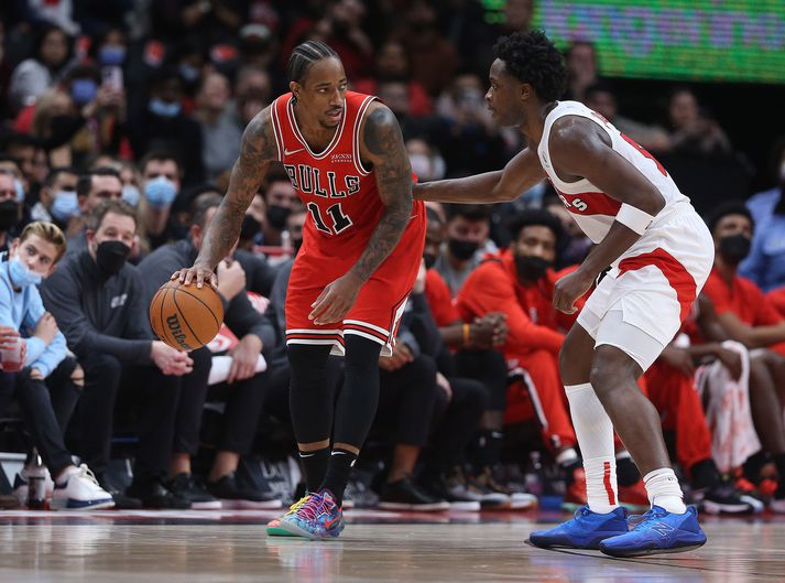 Bulls ekki byrjað betur síðan Jordan lék með liðinu Ingvi Þór Sæmundsson skrifar 26. október 2021 07:30 DeMar DeRozan skoraði 26 stig þegar Chicago Bulls vann gamla liðið hans, Toronto Raptors. getty/Steve Russell Fara þarf aftur til tíma Michaels Jordan til að finna jafngóða byrjun á tímabili hjá Chicago Bulls í NBA-deildinni og núna. Bulls sigraði Toronto Raptors, 108-111, í nótt og hefur unnið alla fjóra leiki sína á tímabilinu. Bulls er eina ósigraða liðið í Austurdeildinni. Þetta er í fjórða sinn sem Bulls vinnur fyrstu fjóra leiki sína á tímabili en í fyrstu þrjú skiptin sem það gerðist var Jordan leikmaður liðsins. Bulls hefur ekki byrjað jafn vel og tímabilið 1996-97. Þá vann liðið 69 af 82 leikjum sínum í deildarkeppninni og varð meistari, annað árið í röð. The BEST plays from the @chicagobulls first 4-0 start since 1996-97! pic.twitter.com/HhHZRJGLe4— NBA (@NBA) October 26, 2021 DeMar DeRozan skoraði 26 stig fyrir Bulls og Zach LaVine 22. OG Anunoby var stigahæstur hjá Toronto með 22 stig. 26 points for @DeMar_DeRozan.4-0 start for the @chicagobulls pic.twitter.com/XcOrPubqeA— NBA (@NBA) October 26, 2021 Giannis Antetokounmpo skoraði þrjátíu stig, tók tíu fráköst og gaf níu stoðsendingar þegar meistarar Milwaukee Bucks unnu Indiana Pacers, 109-119. Khris Middleton bætti 27 stigum við fyrir Milwaukee sem hefur unnið þrjá af fyrstu fjórum leikjum sínum á tímabilinu. Malcom Brogdon skoraði 25 stig fyrir Indiana. 30p/10r/9a for @Giannis_An34.27p/7a for @Khris22m. The @Bucks improve to 3-1 pic.twitter.com/f9iu3ttEyE— NBA (@NBA) October 26, 2021 Sigurgöngu Charlotte Hornets lauk þegar Boston Celtics kom í heimsókn. Boston vann 129-140 eftir framlengingu. Jayson Tatum skoraði 41 stig fyrir Boston og Jaylen Brown þrjátíu. LaMelo Ball og Miles Bridges skoruðu 25 stig hvor fyrir Charlotte. 41 for @jaytatum0 in the @celtics OT win! pic.twitter.com/UkoVd4TCsH— NBA (@NBA) October 26, 2021 Úrslitin í nótt Toronto 108-111 Chicago Indiana 109-119 Milwaukee Charlotte 129-140 Boston Atlanta 122-104 Detroit Brooklyn 104-90 Washington Miami 107-90 Orlando Minnesota 98-107 New Orleans Denver 87-99 Cleveland LA Clippers 116-86 Portland NBA er á Stöð 2 Sport en upplýsingar um útsendingar má finna hér. NBA körfuboltinn er hluti af Stöð 2 Sport erlent sem kostar 3.990 krónur á mánuði. NBA Mest lesið Þessi tíu eru tilnefnd sem Íþróttamaður ársins 2025: 23 ára aldursmunur Sport Sagan ekki sönn: „Veit ekki hvaðan þetta á að hafa komið“ Íslenski boltinn Sakaður um niðurlægingu: „Við viljum ekki hafa hann sem þjálfara“ Handbolti Erfitt að vera í burtu þegar mamma greindist Fótbolti Slot mun sakna Isak í tvo mánuði eftir „glórulausa tæklingu“ Enski boltinn Kansas frá Kansas til Kansas Sport Einn leikmaður með samning og völlurinn ólöglegur Fótbolti Glódís framlengir samninginn við Bayern Fótbolti Áfallið staðreynd og Isak búinn í aðgerð Enski boltinn Missti alveg stjórn á skapinu en það skilaði sigri Körfubolti Fleiri fréttir Missti alveg stjórn á skapinu en það skilaði sigri Stórstjarna úr WNBA-deildinni í heimsókn á Íslandi ÍR-ingar bæta við sig reyndum og hittnum Króata Í bann fyrir að kasta flösku í barn Hjalti Þór ráðinn aðalþjálfari Álftaness Kolbrún María kom við sögu í endurkomu Hannover Næstframlagshæstur í grátlegu tapi Fékk næstum 4,5 milljóna króna sekt fyrir að sýna dómara fingurinn „Komum eins og aumingjar inn í þennan leik“ „Jólasteikin mun bragðast betur í ljósi þessa sigurs“ Stjarnan - Álftanes 108-104 | Unnu grannaslaginn naumlega Uppgjörið: Ármann - ÍA 102-83 | Ármann náði í gríðarlega mikilvæg stig í fallbaráttunni með sigri gegn Skagamönnum Jokic tók NBA-met af Abdul-Jabbar í nótt KR á frábærum stað en getur ekki unnið titilinn Útilokar ekki breytingar: „Er klárlega að líta í kringum mig“ Uppgjörið: Keflavík - Njarðvík 93-83 | Enn taplausir í Sláturhúsinu „Ánægður að spila ekki betur en þetta en vinna samt“ „Svo lengi sem það er ekki jákvæð og góð umfjöllun um okkur erum við sáttir“ „Hefðum þurft að hafa heppnina með okkur í liði“ ÍR - Valur 82-85 | Baráttusigur í Breiðholti „Sáttur að geta farið heim, borðað vel og fengið mér nokkra kalda“ Tindastóll - KR 130-117 | Kláruðu gestina í seinni hálfleik Þór Þ. - Grindavík 94-106 | Baráttusigur gegn löskuðu liði Þórs Liðsfélagar Guðbjargar ekki fæddir þegar hún spilaði fyrsta leikinn Þola þeir ekki gott umtal? „Helmingur minna leikmanna skilur ekki íslensku“ „Ef við hefðum ekki verið að setja þessi skot þá hefðum við skíttapað“ KR á toppinn Uppgjörið: Grindavík - Haukar 92-93 | Fullkomin jólagjöf Spilaði 13 mínútur en var stigahæstur Rýndu í gamlar myndir: „Svakalega ertu kringlóttur í framan“ Sjá meira