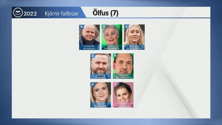 Sjálfstæðisflokkurinn heldur fjórum fulltrúum, líkt og í kosningunum árið 2018, og getur því setið áfram einn í meirihluta. Svona fóru kosningarnar: B-listi Framfarasinna í Ölfusi: 30,5% með tvo fulltrúa D-listi Sjálfstæðisflokksins: 55,9% með fjóra fulltrúa H-listi Íbúaflokksins: 13,7% með einn fulltrúa Eftirfarandi náðu kjöri í bæjarstjórn: Hrönn Guðmundsdóttir (B) Vilhjálmur Baldur Guðmundsson (B) Gestur Þór Kristjánsson (D) Sigurbjörg Jenný Jónsdóttir (D) Grétar Ingi Erlendsson (D) Erla Sif Markúsdóttir (D) Ása Berglind Hjálmarsdóttir (H) Sjálfstæðisflokkurinn hefur farið með völdin í Ölfusi frá 2018.Vísir/Vilhelm