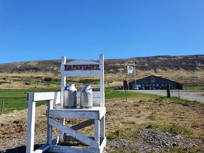 Helga Elínborg Guðmundsdóttir og Þorgrímur Einar Guðbjartsson mjólkurfræðingur reka myndarlegt kúabúa á Erpsstöðum en þau eru líka með skemmtilega sveitaverslun, sem selur framleiðsluvörur búsins. Rjómabúið var stofnað 2009 þegar ísframleiðslan hófst og síðan hefur starfsemin vaxið og vaxið með fjölbreyttu vöruúrvali af búinu. Erpsstaðir eru vinsæll staður hjá ferðamönnum. „Já, ég held að hann sé orðinn bara ansi þekktur, nafnið orðið þekkt og já, já, við erum að fá mjög mikið af gestum yfir hásumarið,“ segir Helga. Erpsstaðir eru vinsæll staður hjá ferðamönnum að heimsækja.Magnús Hlynur Hreiðarsson Helga segir að það sem af er sumri hafi verið mjög gott og hún á von á því að það verði þannig fram á haust enda mikið af ferðamönnum á ferðinni á svæðinu. Er þetta ekki bara ótrúlega skemmtilegt? "Jú, þetta er mjög skemmilegt. Kannski er þetta líka skemmtilegt af því að þetta er vertíð, svo þegar haustið kemur þá fer maður í sína daglegu rútínu og verður bara venjulegur bóndi.“ Broddurinn á Erpsstöðum er alltaf mjög vinsæll. Hér er Helga með tvær flöskur.Magnús Hlynur Hreiðarsson Helga segir að rjómaísinn sé lang vinsælastur á vörum Erpsstaða en það er ekki bara mannfólkið sem er hrifið af ísnum, nei, nei, svínin á bænum elska líka ísinn. Ísinn er vinsælasta varan á Erpsstöðum.Magnús Hlynur Hreiðarsson „Já, ísinn er mjög vinsæll hjá svínunum, þau geta étið endalaust af honum“, segir Helga og hlær. Bændurnir á Erpsstöðum eru að standa sig ótrúlega vel og gera góða hluti á bænum.Magnús Hlynur Hreiðarsson Facebook síða Erpsstaða