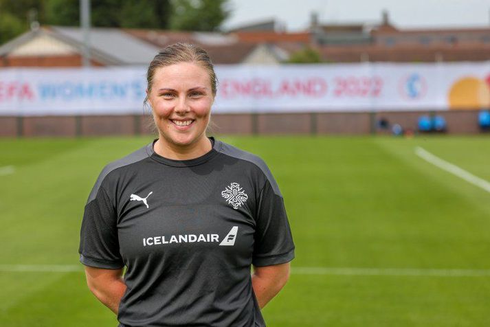 Dúna: Þetta var bara eitt símtal og ég var klár Óskar Ófeigur Jónsson skrifar 12. júlí 2022 09:30 Guðrún Þórbjörg Sturlaugsdóttir er styrktarþjálfari íslenska liðsins og eina konan í þjálfarateyminu. Vísir/Vilhelm Guðrún Þórbjörg Sturlaugsdóttir er ekki kölluð annað en Dúna af þeim sem þekkja hana. Hún er kannski ekki alltaf í sviðsljósinu en tekur engu að síður virkan þátt í æfingum íslenska landsliðsins á EM í Englandi. Guðrún Þórbjörg er styrktarþjálfari íslenska liðsins og fylgist líka vel með því hvort álagið sé rétt á leikmenn landsliðsins. Það er á hennar ábyrgð að koma stelpunum í gírinn fyrir allar æfingar. „Það er frábært að vera hluti af þessum hóp. Þetta eru algjörir snillingar, bæði starfsfólkið og stelpurnar í liðinu. Algjörir fagmenn og maður getir lært helling. Það er góða stemmning í hópnum og þetta er bara geggjað,“ sagði Guðrún Þórbjörg Sturlaugsdóttir, styrktarþjálfari íslenska liðsins. „Ég sé um fyrstu fimmtán til tuttugu mínúturnar á hverri æfingu. Svo sé ég um GPS-ið þar sem við erum að fylgjast með því hvað stelpurnar hlaupa mikið, hvað þær taka marga sprettmetra og ýmislegt. Við reynum að stjórna álaginu með þeim upplýsingum,“ sagði Guðrún. Klippa: Guðrún Þórbjörg: Reyni að gera hana eins skemmtilega og ég get Hún leggur metnað sinn í að gera upphitun stelpnanna skemmtilega. „Það þarf að undirbúa sig fyrir hverja æfingu. Upphitunin er ekki skemmtilegasti parturinn af æfingunni þannig að ég reyni að krydda aðeins upp á þetta og gera hana eins skemmtilega og ég get. Svo er GPS-vinnan eftir æfingu getur verið talsvert mikil,“ sagði Guðrún. Guðrún var ánægð með vinnusemi stelpnanna okkar i jafnteflinu á móti Belgíu. „Þetta var bara hörkuleikur og þær hlupu mikið. Það er alveg staðfest. Þær verða þreyttar í dag þannig að endurheimtin er mikilvæg. Við ætlum að sjá til þess að þær verði klárar í næsta leik,“ sagði Guðrún. Hún þarf ekki mikið að sinna einstaklingsþjónustu fyrir leikmenn liðsins. „Sem betur fer ekki. Þetta eru bara atvinnumenn og þær kunna sitt fag. Ég er samt alltaf til staðar ef til þarf,“ sagði Guðrún. Hún hefur verið með landsliðinu undanfarin tvö ár. „Ég er búin að vera með síðan að Ási og Steini tóku við en síðan þá er ég búin að fylgja þeim.,“ sagði Guðrún og það þurfti ekki að sannfæra hana mikið. „Þetta var bara eitt símtal og ég var klár,“ sagði Guðrún. Það má sjá viðtalið í myndbandinu hér fyrir ofan. EM 2022 í Englandi Landslið kvenna í fótbolta Mest lesið Áfallið staðreynd og Isak búinn í aðgerð Enski boltinn Einn leikmaður með samning og völlurinn ólöglegur Fótbolti Vildi tapa legg: „Mesti hávaði sem ég hef heyrt“ Sport Salah færði Egyptum draumabyrjun Fótbolti Körfuboltakvöld: Tilþrif tímabilsins til þessa Körfubolti Steraleikarnir segi ungu fólki að það sé aldrei nógu fullkomið Sport Hættur aðeins þrítugur Golf Dagskráin í dag: Kæst yfir NFL, pílu og enska boltanum Sport Afkáralegt fagn hjá hetju Sambíu Fótbolti Sagði látna systur sína hafa tryggt sigurinn ótrúlega Sport Fleiri fréttir Einn leikmaður með samning og völlurinn ólöglegur Salah færði Egyptum draumabyrjun Fulham skildi Forest eftir við fallsvæðið Áfallið staðreynd og Isak búinn í aðgerð Neres hetja Napoli í Sádi-Arabíu Aron Einar lagði upp dýrmætt sigurmark Afkáralegt fagn hjá hetju Sambíu Glódís Perla veik í jólafríið en enn taplaus Glódís og Hákon best í fótboltanum á árinu Frelsaði fjárfestirinn Dani Alves gefur sjálfum sér samning Fagnaði titli Liverpool sem óður maður um alla borg Mbappé breytti um fagn af góðu tilefni „Allir virðast elska hann“ Meira en 37 stöðugildi hjá Knattspyrnusambandi Íslands Táningur fær mikið hrós fyrir viðbrögð sín þegar mótherji missti meðvitund „Þetta mun ekki buga okkur“ Guardiola mun vigta leikmenn Man City eftir jólin „Ef þið væruð Antoine Semenyo, hvert mynduð þið fara?“ Freyr himinlifandi með íslensku strákana Sjáðu geggjaðan snúning Alberts áður en hann skoraði frábært mark Óskar Hrafn um komu Arnórs Ingva: „Gífurlega dýrmætt fyrir KR“ Áhorfendur ærðust eftir mögulega mark mótsins í fyrsta leik Sjáðu mörkin: Rogers sá um Manchester United Hleður Kjartan lofi eftir frábæra frumraun með Aberdeen Óttast að Isak hafi fótbrotnað Túfa gerir þriggja ára samning í Svíþjóð Arnór Ingvi orðinn leikmaður KR Albert skoraði í fyrsta sigri Fiorentina Bæjarar aftur á sigurbraut Tvenna frá Rogers tryggði Villa sigur gegn Manchester United Sjá meira
