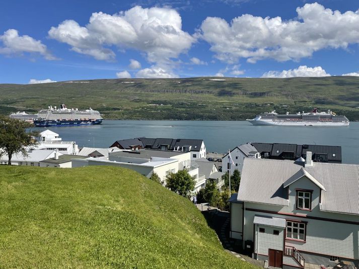 Pétur Ólafsson, hafnarstjóri hjá Hafnarsamlagi Norðurlands, segir í samtali við fréttastofu að oftast væri hægt að hafa þrjú skemmtiferðaskip í höfninni en þar sem skipin sem komu í dag séu í stærri kantinum hafi eitt þurft að víkja. Starfsmenn skipsins ákváðu að hafa það úti á Polli frekar en að sleppa Akureyri alfarið. Tvö stærðarinnar skip voru við Akureyrarbryggju í dag.Vísir/Bjarki „Skipafélögin eru að bóka með margra ára fyrirvara, tveggja ára fyrirvari er mjög algengur. Það má eiginlega segja að það sé fyrstur kemur fyrstur fær, en auðvitað þarf aðeins að pússa þetta þegar allar bókanirnar eru komnar,“ segir Pétur. Skipin tvö sem lögðu við höfnina í dag heita Mein Schiff 4 og Viking Jupiter og það sem kastaði akkeri á Pollinum heitir Carnival Pride. Samanlagður hámarksfjöldi farþega í skipunum þremur er 5.560 manns. Í sumar hafa skemmtiferðaskip verið með sextíu til sjötíu prósenta bókunarhlutfall og því má gera ráð fyrir að um 3.600 farþegar hafi heimsótt Akureyri í dag. Farþegum Carnival Pride var komið til lands með minni bátum.Aðsend
