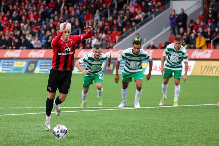 Víkingur vann 2-0 sigur gegn The New Saints í undankeppni Sambandsdeildar Evrópu í fótbolta í kvöld og er því í flottum málum fyrir útileikinn í næstu viku. Kristall Máni Ingason skoraði bæði mörk Víkinga, úr vítaspyrnum. Ari Sigurpálsson krækti í fyrri vítaspyrnuna en Kristall náði sjálfur í þá seinni, við litla hrifningu gestanna. New Saints fékk fyrsta færi leiksins eftir tæplega tveggja mínútna leik. Kyle McLagan átti þar klaufaleg mistök sem Josh Daniels nýtti sér og komst einn gegn Ingvar Jónssyni, markverði Víkings, en Ingvar gerði vel í að loka á hann og varði. Eftir færi gestanna róaðist leikurinn. Víkingur vann sig betur inn í leikinn þegar á leið. Kristall Máni Ingason var hættulegastur hjá heimamönnum og fékk tvö góð færi til að koma heimamönnum yfir en gestirnir gerðu vel í að leysa þá pressu. Á 27. mínútu gerðist Leo Smith brotlegur inn í eigin vítateig þar sem hann steig aftan í Ara Sigurpálsson sem var á leiðinni í skot og um vafalausa vítaspyrnu að ræða. Hættulegasti leikmaður Víkings í leiknum Kristall Máni Ingason steig á vítapunktinn. Kristall tók lítið skopp áður en hann renndi boltanum í hægra hornið þar sem Connor Roberts, markmaður New Saints, hafði farið í vinstra hornið. Fyrra víti Kristals þar sem hann renndi boltanum í hægra horniðVísir/Diego Logi Tómasson var óheppinn að bæta ekki við forystu Víkings en hann fékk nokkur marktækifæri en inn fór boltinn ekki og Víkingur var einu marki yfir í hálfleik. Dýrlingarnir gerðu eina breytingu í hálfleik. Eftir að Víkingur hafi verið með öll völd á vellinum í fyrri hálfleik brugðu gestirnir á það ráð að fara í fimm manna varnarlínu. Þegar tæplega tíu mínútur voru liðnar af síðari hálfleik flautaði Peter Kralovic, dómari leiksins, aðra vítaspyrnu á New Saints. Josh Pask var í baráttunni við Kristal Mána þar sem Pask fór í boltann en virtist aðeins axla Kristal Mána sem féll við og Peter Kralovic flautaði ósanngjarna vítaspyrnu. Seinni vítaspyrna Kristals þar sem hann renndi boltanum í vinstra horniðVísir/Diego Kristall Máni tók vítið sjálfur og notaði sömu brellu og í fyrra vítinu þar sem hann tók létt skopp en að þessu sinni renndi hann boltanum í vinstra hornið á meðan Connor Roberts stökk í það hægra. Gestirnir fengu færi í uppbótatíma til að minnka muninn en nýttu það ekki og þar við sat. Víkingur vann 2-0 og eru með pálmann í höndunum fyrir seinni leikinn. Víkingar fögnuðu með sínu fólki eftir leikVísir/Diego Af hverju vann Víkingur Reykjavík? Gestirnir fóru illa með gott færi snemma leiks þegar leikurinn var markalaus. Eftir það stýrði Víkingur leiknum og skapaði sér haug af færum sem skilaði sér í tveimur vítaspyrnum. Víkingur leysti vel stóra og stæðilega hafsenta New Saints með góðum hraða og var upplegg Arnars Gunnlaugssonar að þreyta andstæðinginn sem gekk upp. Hverjir stóðu upp úr? Kristall Máni Ingason lék sinn síðasta heimaleik fyrir Víking Reykjavík. Kristall fer til Rosenborg í næsta mánuði og kvaddi Víkina með stæl. Kristall skoraði tvö mörk bæði úr vítum og fiskaði hann sjálfur síðari vítaspyrnuna. Ingvar Jónsson, markmaður Víkings, hélt hreinu í kvöld og stóð vaktina vel milli stanganna. Ingvar varði frábærlega í upphafi leiks og þegar New Saints reyndi að ógna í föstum leikatriðum kom Ingvar oftar en ekki út og hirti boltann. Hvað gekk illa? Þungir og hægir varnarmenn New Saints voru í vandræðum með snögga sóknarlínu Víkings. Heimamenn stungu þá ítrekað af sem skapaði mikla hættu. Peter Kralovic, dómari leiksins, gerði dýr mistök þegar hann flautaði vítaspyrnu í síðari hálfleik þar sem Josh Pask fór augljóslega í boltann áður en Kristall féll niður og það var nokkuð augljóst að Pask braut ekki á Kristali Mána. Hvað gerist næst? Liðin mætast aftur í Walse næsta þriðjudag klukkan 17:15. Kristall Máni: Þetta var ódýrt víti sem ég fiskaði Kristall Máni skoraði tvö mörk úr vítum í kvöldVísir/Diego Kristall Máni Ingason, leikmaður Víkings, var ánægður með sigurinn á New Saints. Þetta var síðasti heimaleikur Kristals og mun hann kveðja Víkina með söknuði. „Við héldum hreinu og skoruðum tvö mörk. Mér fannst við heilt yfir rúlla yfir þá og það fannst mér standa upp úr,“ sagði Kristall Máni eftir leik. Víkingur var marki yfir í hálfleik og stýrðu heimamenn umferðinni og átti New Saints í erfiðleikum með að koma sér inn í leikinn. „Við héldum boltanum vel og létum hann ganga hratt. Þeir fóru að þreytast og við hefðum getað refsað þeim með fleiri mörkum þar sem við fengum færi til þess.“ Kristall Máni fiskaði afar umdeilda vítaspyrnu í síðari hálfleik og fannst honum snertingin ekki mikil. „Þetta var ódýrt víti en það var kominn tími til að maður fengi eins og eina vítaspyrnu þar sem það hefur oft verið sparkað í mig fastar en þetta.“ Kristall Máni lék sinn síðasta heimaleik með Víkingi Reykjavík í kvöld. Kristall er ánægður með tíma sinn hjá Víkingi og hlakkar til að takast á við næsta verkefni. „Þetta eru mínir síðustu leikir fyrir Víking Reykjavík. Það verður erfitt að fara en ég er einnig spenntur fyrir næsta skrefi,“ sagði Kristall Máni að lokum. Myndir: Kristall fagnaði marki sínu í fyrri hálfleikVísir/Diego Ari Sigurpálsson í baráttunniVísir/Diego Júlíus Magnússon átti öflugan leik á miðjunniVísir/Diego Arnar Gunnlaugsson var í sparigallanum í leik kvöldsinsVísir/Diego Pablo Punyed var allt í öllu í leik kvöldsinsVísir/Diego Anthony Limbrick, þjálfari New Saints á hliðarlínunni í leik kvöldsinsVísir/Diego Logi Tómasson með fyrirgjöf í leik kvöldsinsVísir/Diego