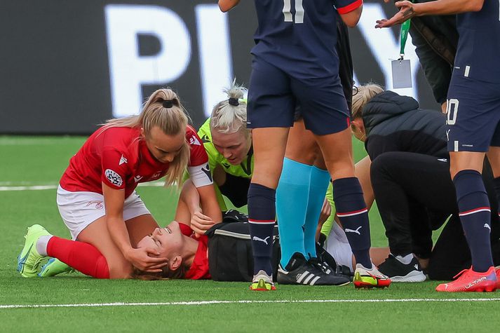 Þykist vita að hún hafi slitið krossband í fjórða sinn Ingvi Þór Sæmundsson skrifar 22. september 2022 10:35 Elísa Viðarsdóttir og Sandra Sigurðardóttir huga að Mist Edvardsdóttur eftir að hún meiddist í leik Vals og Slavia Prag í gær. vísir/vilhelm Mist Edvardsdóttur grunar sterklega að hún hafi slitið krossband í hné í leik Vals og Slavia Prag í umspili um sæti í riðlakeppni Meistaradeildar Evrópu í gær. Mist ætti að þekkja einkennin enda slitið krossband í þrígang. „Ég fer í myndatöku í dag eða á morgun en ég þykist nú vita að þetta hafi verið krossbandið,“ sagði Mist í samtali við Vísi í morgun. Hún meiddist eftir um tuttugu mínútna leik í gær og haltraði af velli. Í hennar stað kom Lillý Rut Hlynsdóttir í fyrsta leik sínum í rúmt ár. Mist segist hafa fundið kunnuglegan verk þegar hún meiddist. „Já, eina sem var frábrugðið hinum þremur skiptunum var að þarna var þetta í kontakt. En hreyfingin sem hnéð fór í, ég fann smellinn og allt það sem kemur á eftir var alveg eins. Þetta var full kunnuglegt,“ sagði Mist. Valur tapaði leiknum í gær, 0-1. Seinni leikurinn fer fram í Prag á miðvikudaginn í næstu viku. Valskonur gætu haldið utan sem nýkrýndir Íslandsmeistarar. Ef Valur vinnur Aftureldingu í næstsíðustu umferð Bestu deildar kvenna á laugardaginn verður liðið Íslandsmeistari annað árið í röð og í þriðja sinn á síðustu fjórum árum. Mist hefur tekið þátt í öllum sextán leikjum Vals í Bestu deildinni og skorað fjögur mörk. Hún lék einnig þrjá leiki og skoraði tvö mörk í Mjólkurbikarnum sem Valskonur unnu. Besta deild kvenna Valur Meistaradeild Evrópu í fótbolta kvenna Mest lesið Þessi tíu eru tilnefnd sem Íþróttamaður ársins 2025: 23 ára aldursmunur Sport Sagan ekki sönn: „Veit ekki hvaðan þetta á að hafa komið“ Íslenski boltinn Arsenal í undanúrslit eftir vító Enski boltinn Sakaður um svindl á HM í pílukasti Sport Sakaður um niðurlægingu: „Við viljum ekki hafa hann sem þjálfara“ Handbolti Erfitt að vera í burtu þegar mamma greindist Fótbolti Áfallið staðreynd og Isak búinn í aðgerð Enski boltinn Arnar Daði rekinn frá Stjörnunni en áfram þjálfari kvennaliðsins Handbolti Hættur aðeins þrítugur Golf Sjáðu geggjaðan snúning Alberts áður en hann skoraði frábært mark Fótbolti Fleiri fréttir Sagan ekki sönn: „Veit ekki hvaðan þetta á að hafa komið“ Meira en 37 stöðugildi hjá Knattspyrnusambandi Íslands Óskar Hrafn um komu Arnórs Ingva: „Gífurlega dýrmætt fyrir KR“ Arnór Ingvi orðinn leikmaður KR Breiðablik kaupir Jónatan frá Norrköping Elías mættur til meistaranna KR sagt vera að landa Arnóri Ingva Hilmar Árni til starfa hjá KR Segir fjórðung í bók Óla ósannan Víkingur í úrslit Bose-bikarsins eftir sigur „Verið heiður að spila í appelsínugulu með frábærum liðsfélögum“ Þekkir Egilshöllina vel og skoraði gegn fyrrum félögum Strákar Heimis Guðjóns fengu slæman skell í fyrsta leik Axel verður áfram hjá Aftureldingu Kveður pabba sinn í Laugardalnum og fer til FH „Félag sem var í basli með að ná endum saman og greiða laun á réttum tíma“ Skrýtið og taktlaust: „Ég er ekkert sátt með niðurstöðuna“ Fanndís kveður sviðið: „Ég er búin að fella nokkur tár“ Gylfi með tvö og Víkingar byrja á sigri Frá Akureyri til Danmerkur Markadrottningin heldur að landsliðið sé búið spil Strákarnir í 2. flokki Vals þeir einu sem ekki spila fyrir áramót Dæturnar vildu norður: „Mun alltaf gera allt fyrir þær“ Stjarnan sækir markvörð í 3. deildina „Ég var orðinn algjörlega bugaður“ Jónatan áfram á Hlíðarenda: „Var alltaf jákvæður fyrir því að framlengja“ Óli Jó kallar ráðninguna á Jóa Kalla algjört bull „Ég elska þig Ísland, takk fyrir allt!“ Sextán ára með fernu fyrir meistara Víkings Valur dregur sig úr Bose-bikarnum Sjá meira