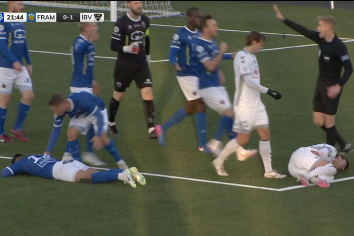 „Þú getur ekki hlaupið um og keyrt niður fólk“ Óskar Ófeigur Jónsson skrifar 17. október 2022 11:01 Guðjón Ernir Hrafnkelsson og Jesus Natividad Yendis Gomez lágu báðir eftir á vellinum í kjölfar samstuðsins. S2 Sport Eyjamenn fengu víti á móti Fram í gær og í græna herbergi Stúkunnar voru menn ekki sammála um hvort um réttan dóm hafi verið að ræða. Stúkumenn fóru hins vegar yfir það hvernig þau mál enduðu áður en þeir komu inn í myndver til að taka upp þátt gærkvöldsins. Lárus Orri Sigurðsson, sérfræðingur í Stúkunni, hefur alltaf haft harðar og jafnvel öðruvísi skoðanir á því hvort að það sé rétt að dæma víti eða ekki. Stúkan fór sérstaklega yfir vítaspyrnuna sem Eyjamenn fengu á móti Fram í Bestu deildinni í gær. „Þú hefur alltaf haft miklar skoðanir á þessu. Víti eða ekki víti. Þú segir reyndar alltaf ekki víti. Þú sagðir það líka í dag. Þegar við vorum að horfa á þetta, alls ekki víti sagði hann,“ sagði Guðmundur Benediktsson. Talaði við fróðari menn „Hvað gerir hann þá? Ég sá að það var efi í augunum hans samt þegar hann var að segja þetta. Hann ætlaði bara að vera harður og segja ekki víti. Ég held að hann hafi talað við sér fróðari menn,“ sagði Guðmundur. „Þetta er alltaf víti er það ekki,“ spurði Guðmundur. „Orðrétt fékk ég: Þú getur ekki hlaupið um og keyrt niður fólk. Það var það sem ég fékk. Þetta er víti,“ sagði Lárus Orri Sigurðsson. „Hann byrjar alltaf á ekki víti. Það er svona útgangspunkturinn alltaf hjá honum,“ skaut Guðmundur inn í léttum tón. Mjög klaufalegt „Þetta er mjög klaufalegt. Hann sér ekki manninn en keyrir hann náttúrulega niður. Jú, ég kem á vítavagninn með ykkur,“ sagði Lárus Orri. Hér fyrir neðan má sjá umræðuna og svo auðvitað brotið þar sem góður hjálpaði sérfræðingi Stúkunnar að taka U-beygjuna. Klippa: Stúkan: Vítadómur í leik Fram og ÍBV Besta deild karla Fram ÍBV Stúkan Mest lesið Koepka fyrsta stjarnan sem riftir samningi við LIV Golf Arnar Daði rekinn frá Stjörnunni en áfram þjálfari kvennaliðsins Handbolti Ótrúlegur sigur á HM: „Ég er mjög tregur svo pressan nær ekki til mín“ Sport Man. Utd reyndi stíft en Semenyo kaus City Enski boltinn Þessi tíu eru tilnefnd sem Íþróttamaður ársins 2025: 23 ára aldursmunur Sport Sagan ekki sönn: „Veit ekki hvaðan þetta á að hafa komið“ Íslenski boltinn Öll höllin æpti nafn Gísla í spennutrylli Handbolti Arsenal í undanúrslit eftir vító Enski boltinn Kaupmannahafnarbúi afgreiddi Úganda Fótbolti Erfitt að vera í burtu þegar mamma greindist Fótbolti Fleiri fréttir Sagan ekki sönn: „Veit ekki hvaðan þetta á að hafa komið“ Meira en 37 stöðugildi hjá Knattspyrnusambandi Íslands Óskar Hrafn um komu Arnórs Ingva: „Gífurlega dýrmætt fyrir KR“ Arnór Ingvi orðinn leikmaður KR Breiðablik kaupir Jónatan frá Norrköping Elías mættur til meistaranna KR sagt vera að landa Arnóri Ingva Hilmar Árni til starfa hjá KR Segir fjórðung í bók Óla ósannan Víkingur í úrslit Bose-bikarsins eftir sigur „Verið heiður að spila í appelsínugulu með frábærum liðsfélögum“ Þekkir Egilshöllina vel og skoraði gegn fyrrum félögum Strákar Heimis Guðjóns fengu slæman skell í fyrsta leik Axel verður áfram hjá Aftureldingu Kveður pabba sinn í Laugardalnum og fer til FH „Félag sem var í basli með að ná endum saman og greiða laun á réttum tíma“ Skrýtið og taktlaust: „Ég er ekkert sátt með niðurstöðuna“ Fanndís kveður sviðið: „Ég er búin að fella nokkur tár“ Gylfi með tvö og Víkingar byrja á sigri Frá Akureyri til Danmerkur Markadrottningin heldur að landsliðið sé búið spil Strákarnir í 2. flokki Vals þeir einu sem ekki spila fyrir áramót Dæturnar vildu norður: „Mun alltaf gera allt fyrir þær“ Stjarnan sækir markvörð í 3. deildina „Ég var orðinn algjörlega bugaður“ Jónatan áfram á Hlíðarenda: „Var alltaf jákvæður fyrir því að framlengja“ Óli Jó kallar ráðninguna á Jóa Kalla algjört bull „Ég elska þig Ísland, takk fyrir allt!“ Sextán ára með fernu fyrir meistara Víkings Valur dregur sig úr Bose-bikarnum Sjá meira