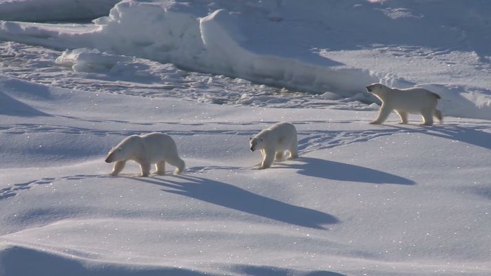 Frétt Stöðvar 2: Þýsk ísbrjóturinn og rannsóknarskipið Pólstjarnan var meðal annars látið reka með norðurskautsísnum í MOSAIC verkefninu veturinn 2019 til 2020 á meðan hundruð vísindamanna frá tuttugu löndum sinntu rannsóknum. Vísindamenn létu þýska ísbrjótinn og rannsóknarskipið Pólstjörnuna reka með norðurskautsísnum og var það í fyrsta skipti sem það var gert að vetri til.Alfred Wegener stofnunin „Fyrst tókum við eftir því að rekið var mun hraðara en fyrir áratugum. Við fórum í raun í kjölfar leiðangurs Fridjofs Nansens fyrir 130 árum sem hann fór á tréskipi. Hann þurfti þrjú ár til að reka í gegnum norðurskautsísinn en það tók okkur aðeins eitt ár. Það er vegna þess að ísinn er miklu þynnri, miklu yngri, meira hreifanlegur og rekur hraðar," segir Dr Markus Rex prófessor í loftslagseðlisfræði við Podsdam háskóla sem tók þátt í skipulaginu MOSAIC leiðangursins og tók einnig þátt í honum. Leiðangursfólk rakst meðal annars á fjölskyldur hvítabjarna með húna sem fæddust vorið sem leiðangurinn stóð yfir.Alfred Wegener stofnunini Þessar afleiðingar loftslagsbreytinganna væru ekki góðar fréttir fyrir hvítabirni sem öfluðu sér lífsviðurværis á ísnum. Enn væri hægt að snúa þróuninni við en mannkynið hefði skamman tíma til þess. Leiðangursfólk á Pólstjörnunni hefði átti marga fundi með ísbjörnum. Dr. Markus Rex einn af leiðangursstjórum Pólstjörnunnar segir enn hægt að snúa þynningu norðurskautsíssins við en mannkynið hafi ekki langan tíma til þess.Stöð 2/Egill „Á þessu ári fengum við um sextíu heimsóknir frá hvítabjörnum alla leið í rannsóknarbúðir okkar. Það var stöðug áskorun að halda öllum öruggum á ísnum á meðan þessi dýr voru í nágrenninu," segir Rex. Vísindamenn hafi oft átt fótum sínum fjör að launa undan hraðskreiðum ísbjörnum „Margoft. Við urðum mjög oft að yfirgefa ísinn vegna þess að hvítabirnir nálguðust. Það kom að því að við þróuðum ferla þannig að við gætum unnið öðrum meginn við skipið á meðan birnir voru á veiðum hinum meginn við það," segir Rex. Stundum voru vísindamenn að störfum öðrum meginn við rannsóknarskipið á meðan hvítabirnir voru á veiðum hinum megin við það.Alfred Wegener stofnunin Hvítabjarnastofninn á mið-norðurskautshafinu væri enn vel haldinn. „Þarna er mjög heilbrigt samfélag hvítabjarna. Við sáum mjög vel nærð dýr. Einnig fjölskyldur hvítabjarna með húna sem fæddust vorið sem leiðangurinn stóð yfir," segir Rex. Björninn kunni best við sig á þunnum ís sem auðveldi þeim selveiðar. En nú þynnist ísinn hratt og björninn leiti því norðar en áður. „Og þynning er aðeins fyrsta skrefið að því að ísinn hverfi. Þannig að framtíðin lítur ekki vel út fyrir hvítabirnina," segir Markus Rex.