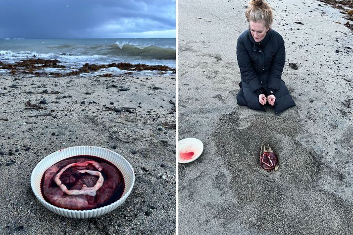 Íris Stefanía jarðaði fylgjuna í uppáhaldsfjörunni Elísabet Hanna skrifar 21. október 2022 07:00 Þegar heim var komið af spítalanum eftir fæðinguna fann Íris hjá sér að hún væri ekki tilbúin að kveðja fylguna en nú, ári síðar, hafi tíminn verið kominn. Aðsend Listakonan Íris Stefanía Skúladóttir jarðaði fylgjuna sína í uppáhalds fjörunni sinni. „Ég vildi bara hafa nánasta kjarnann með mér, fólkið sem ég treysti. Ég var að kveðja og vildi fá að gera það án þess að vera meðvituð um fólkið í kringum mig,“ segir hún um athöfnina í samtali við Vísi. Íris var í veikindaleyfi á þriðju meðgöngunni sinni og náði að gefa sér tíma til þess að fræðast betur um meðgöngur og fæðingar en hún hafði náð á sínum fyrri meðgöngum. Hún segir það hafa verið valdeflandi að átta sig á því að hún mætti spyrja spurninga og stjórna ferðinni sjálf. „Þegar ég kom inn í þriðju fæðinguna vildi ég stjórna öllu sjálf,“ segir hún. Fylgjan er mögnuð Það sem greip athygli hennar sérstaklega var fylgjan og það hvernig þessu einstaka líffæri, sem líkaminn býr til, sé hent í ruslið eins og úrgang. „Fylgjur eru svo magnaðar en þeim er hent eins og rusli á spítölum. Mér finnst þær eigi betra skilið. Þær eru ekki úrgangur eftir fæðingu. Þær eru stórkostlegt líffæri sem tengir tvær manneskjur saman,“ sagði Íris í færslu á samfélagsmiðli sínum. Eftir að Íris átti þriðja barnið sitt óskaði hún eftir því að fá að eiga fylgjuna en fékk þau svör að það væri strangt til tekið ekki í boði. Hún segist þó hafa fengið hana heim í poka á endanum en segir vinkonur sínar þó ekki hafa verið jafn heppnar með svör. „Hjá einni var henni bannað að eiga hana og hjá annarri týndist hún, fór bara í ruslið og fannst ekki aftur.“ Athöfn við sjóinn Þegar heim var komið af spítalanum eftir fæðinguna fann Íris hjá sér að hún væri ekki tilbúin að kveðja hana en nú, ári síðar, hafi tíminn verið kominn. „Ég er sjálf sjávartengd, það er mitt turn on,“ segir hún um valið á staðsetningunni. „Þegar ég er illa fyrirkölluð fer ég í fjöruna og ég er mikið í sjósundi og ég vildi hafa þá tengingu.“ Íris kvaddi fylgjuna og þakkaði henni fyrir allt sem hún hefur gert.Aðsend Í upphafi segist hún ekki hafa verið viss um það hvort að hún ætti að bjóða fimmtíu manns eða vera ein en endaði á því að hafa aðeins innsta kjarnann sinn hjá sér. „Ég vildi bara hafa nánasta kjarnann með mér, fólkið sem ég treysti. Ég var að kveðja og vildi fá að gera það án þess að vera meðvituð um fólkið í kringum mig.“ Hún segist ekki hafa viljað hafa fólk í kringum sig sem gæti þótt athöfnin skrítin. „Ég skal alveg vera flippaða týpan en ég kæri mig ekki um það þegar eitthvað skiptir mig miklu máli,“ bætir hún við. Hún segir viðbrögðin hafa verið góð en það kom henni á óvart þegar vinkonur hennar hrósuðu henni fyrir að vera ögrandi. „Ég fattaði ekki að þetta væri ögrandi. Við þurfum að sjá þessar myndir og sjá þetta efni til þess að venjast því,“ segir hún um myndirnar sem hún birti af fylgjunni. „Ef við sýnum aldrei þetta skrítna, fjölbreytilega litróf þá venjumst við því aldrei.“ Unaðsleg fæðing Fyrir fæðinguna kynntist hún heimspekinni á bak við Orgasmic birth sem snýst um það að eiga öruggar og ánægjulegar fæðingar. Íris segir markmiðið ekki vera að að fá fullnægingu eða stunda sjálfsfróun, þó að það geti fylgt ferlinu, heldur að eiga ánægjulega fæðingu þar sem þú ert við völd. Hún segir hormónið Oxytocin hjálpa til í fæðingu og því leggi fæðingarnámskeið oft mikið upp úr því að láta sér líða vel. Slökkva ljósin og fá snertingu frá maka. „En svo þorir enginn að fara lengra og segja það er hægt að fróa sér, nudda kynfærin, kyssast og jafnvel stunda kynlíf,“ segir Íris. Hún bætir því við að núna verði eflaust einhverjir sjokkeraðir. Sjálf segist hún hafa kynnt sér málið mjög vel fyrir sína fæðingu. Íris segir fæðinguna hafa verið mjög góða.Aðsend „Ég gerði það á milli hríða, nuddaði kynfærasvæðið og nuddaði snípinn og tengdi við líkamann. Tengdi við svæðið. Tengdi við barnið. Tengdi við útvíkkunina, legið og píkuna.“ Hún segir það bæði hafa hjálpað með sársaukann og að tengjast. „Ég tók fæðinguna upp og horfi á hana til þess að láta mér líða vel, ég hefði ekki getað gert það með mínar fyrri fæðingar,“ segir Íris. Hún er þakklát fyrir að hafa upplifað svona valdeflandi og góða fæðingu. Í dag fræðir hún aðra áhugasama um kynveruna sem býr innra með okkur. Ástin og lífið Barnalán Heilsa Tengdar fréttir „Hæ nýi magi“ Fyrirsætan Ashley Graham þakkar líkamanum sínum fyrir allt sem hann hefur gefið henni í tilefni þess að þrír mánuðir eru liðnir síðan hún eignaðist tvíburadrengina sína. 26. apríl 2022 14:30 Arna Ýr deilir myndbandi af fæðingu sonar síns Fegurðardrottningin og hjúkrunarfræðineminn Arna Ýr Jónsdóttir ákvað að deila afar persónulegu myndbandi af fæðingu sonar síns. Hún segir neikvæðar fæðingarsögur vera háværar í samfélaginu. Með birtingu myndbandsins vill hún sýna þeim sem eiga von á sínu fyrsta barni að fæðingar geti líka verið rólegar og fallegar. 30. september 2021 15:00 Greip stúlkuna í skyndifæðingu og tók óvænt á móti systur hennar sex árum síðar Sjúkraflutningamaður, sem fyrir einskæra tilviljun tók á móti barni hjá sömu móður með sex ára millibili, veit ekki til þess að slíkt hafi komið fyrir áður. Fagnaðarfundir urðu þegar foreldrarnir áttuðu sig á tilviljuninni og heilbrigð s