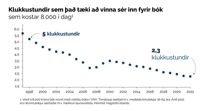 Það styttist í jólin. Verslanir keppast því við að fylla hillur af nýprentuðum bókum. Vísir fjallaði um málið í vikunni þar sem sagði að verð á bókum hækki með hverju ári og bókin stefni í að kosta tæplega átta þúsund krónur, að jafnaði. Aðspurður hvort bækur væru dýrar eða ódýrar svaraði bóksali: „Á tímum Shakespeare hafi bókin kostað á við 25 brauðhleifa, sem væru 12 þúsund krónur í íslensku samfélagi í dag“. Þarna var vel að orði komist og málið sett í áhugavert samhengi. Skoðum þetta betur. Bylting í bókaframleiðslu Áður fyrr voru bækur aðeins á færi efnafólks. Ástæðan er einföld. Framleiðsla á handritum og bókum var verulega tímafrek, enda fór hún fram í höndum skrifara. Áætlað er að fyrir nokkrum öldum hafi tekið um átta mánuði að framleiða eitt eintak af Biblíunni. Þar af leiðandi var bókaframleiðsla mjög takmörkuð.[1] Á 15. öld þróaði Johannes Gutenberg nýja aðferð til að búa til bækur. Hún byggði á endurnýtanlegum prentstöfum og notkun pressu til að prenta heilar síður í einu. Prentvélin var komin til sögunnar. Í stað þess að það tæki marga mánuði að framleiða eina bók, var nú hægt að búa til margar bækur á einum degi. Tæknin var ekki einungis byltingarkennd, heldur ruddi brautina fyrir nýja tegund hugmyndafræði í framleiðslu um Evrópu. Prentiðja var ein fyrsta atvinnugreinin þar sem framleiðsla byggði á hagnaðardrifinni starfsemi. Í krafti kapítalismans breiddist tæknin út um Evrópu og tókst bókaútgáfa í kjölfarið á flug.[2] Blindur er bóklaus maður En eru bækur dýrar? Sagnfræðingar telja að á 13. öld hafi bók kostað ígildi nokkurra mánaða vinnu, eða heilan helling. Á myndinni að neðan sést raunkostnaður bóka á Bretlandseyjum frá 13. öld. Hver punktur táknar verð bóka, að því gefnu að bókin hafi kostað 100 árið 1860. Þannig má sjá að á 14. öld kostaði bók nærri 18-falt meira en hún gerði 1860. Enn fremur sjást tvær grundvallarbreytingar á myndinni sem urðu til þess að verð á bókum lækkaði. Annars vegar þegar pappírsframleiðsla hófst á 12. öld og hins vegar þegar prentvélin kom til sögunnar á 15. öld. Tækniframfarir Gutenbergs og hagnaðardrifin starfsemi fyrirtækja varð til þess að bækur hríðféllu í verði og urðu með tímanum aðgengilegri almenningi. Aukin framleiðsla varð til þess að bókaflóran varð fjölbreyttari, lestrarkunnátta jókst og þekking í vestrænu samfélagi breiddist út með miklu hraði. Þar að auki má glöggt sjá hvernig framleiðni í prentiðju jókst til muna með tilkomu prentvélarinnar. Færri vinnandi hendur þurfti til að framleiða bækur og framleiðslutími varð þá talinn í klukkustundum í stað vikna. Í kjölfarið lækkaði verðið. Áætlað er að framleiðni í prentiðju hafi tuttugufaldast á fyrstu 200 árum eftir uppfinningu Gutenbergs.[3] Þessi saga af byltingu í bókaframleiðslu sýnir okkur hvernig tækniframfarir auka framleiðni og framleiðslu sem gerir bæði vörur og þjónustu ódýrari. Hvað með bækur í dag? Það er deginum ljósara að bækur eru margfalt ódýrari í dag en þær voru fyrr á öldum. Spólum nú nokkrar aldir fram í tímann. Frá árinu 1997 hefur almennt verðlag á Íslandi u.þ.b. þrefaldast. Verð á bókum hefur ekki hækkað nærri jafn mikið eða tæplega tvöfaldast. Hér er þó aðeins hálf sagan sögð og rétt að skoða verð á bókum borið saman við kaupmátt launa, eða; hvað þarf að vinna lengi til að kaupa sér bók? Í frétt Vísis kom fram að bækur kosti 8.000 kr. að jafnaði og ályktað að bækur yrðu sífellt dýrari. Það er sennilega í hærri kantinum, en látum það liggja á milli hluta. Árið 1997 tók tæplega 5 klukkustundir fyrir meðal íslendinginn að vinna sér inn fyrir bók. Þá má ætla að bókin hafi kostað um 4.000 kr. og hefur hún því um tvöfaldast að nafnverði síðan þá.[4] Þar sem laun hafa hækkað mun meira tekur í dag aðeins 2,3 klukkustundir að vinna sér inn fyrir bókinni og hún orðin ódýrari þegar tekið tillit er til aukins kaupmáttar launa. Mikið vatn hefur runnið til sjávar síðan Johannes Gutenberg fann upp prentvélina en það gefur auga leið að framleiðniaukningin sem í henni fólst var til mikilla framfara fyrir vestrænt samfélag, og síðar meir heiminn allan. Staðreyndin er sú að enn í dag hafa tækniframfarir og framleiðniaukning orðið til þess að kaupmáttur launa hefur aukist verulega. Í kjölfarið hafa bækur, og ýmsar aðrar vörur og þjónusta haldið áfram að lækka í verði. Því skiptir máli að líta ekki aðeins til nafnverðs, heldur setja verðþróun í samhengi við kaupmátt. Að öllu virtu eru bækur ódýrari í dag en áður fyrr. Bækur eru ágætar, en sagan segir að hið þjóðfræga enska skáld John Betjeman hafi sagt á dánarbeðinu að hann hafi aðeins eina eftirsjá í lífinu: að hann hafi ekki stundað meira kynlíf. Við skulum endilega nýta okkur verðþróun bóka þessi jólin, en gætum okkur samt á því að láta stærstu eftirsjá skáldsins ekki verða okkar eigin. Betra er brjóstvit en bókvit. Höfundur er hagfræðingur Viðskiptaráðs. Heimildir: [1] Sjá umfjöllun um bókaverð í Morgunblaðinu í nóvember 1999. [2] Sjá Clark (2007) [1] Sjá Clark (2007) [2] A History of Mechanical Inventions: Revised Edition