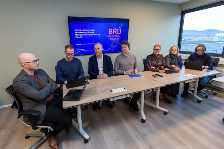 Tilboðið var lagt fram á fundi samninganefnda Eflingar og Samtaka atvinnulífsins sem hófst fyrir stundu með ríkissáttasemjara. Þar segir að samtökin leggi til að gerður verði efnislega samhljóða kjarasamningur milli SA og Eflingar og gerður var við 18 af 19 aðildarfélögum Starfsgreinarsambandsins. Sem fyrr segir segist samninganefnd SA þó tilbúin til að ræða aðlögun kjarasamningsins að þörfum Eflingarfólks, en þó innan þess ramma sem samningurinn við Starfsgreinasambandið markaði. Bjóða afturvirkni frá 1. nóvember verði samningurinn undirritaður innan viku Í tilboðinu kemur fram að SA bjóði að kjarasamningurinn gildi afturvirkt frá 1. nóvember, svo fremi sem hann verði undirritaður innan viku, eigi síðar en 11. janúar næstkomandi. Samninganefnd Eflingar á fundi með samninganefnd Samtaka atvinnulífsins í desember á síðasta ári.Vísir/Vilhelm Í tilboðinu, sem fréttastofa hefur undir höndum, er farið yfir forsendur kjarasamningsins sem Samtök atvinnulífsins undirrituðu við Starfsgreinasambandið á dögunum. Eyjólfur Árni Rafnsson, formaður SA, fór fyrir samninganefnd samtakanna á fundinum í dag. Hann segir að blæbrigðamunur sé á tilboði SA til Eflingar og þeim kjarasamningum sem undirritaðir voru við Starfsgreinasambandið í desember. Klippa: Blæbrigðamunur á tilboði SA Þar er sú afstaða Samtaka atvinnulífsins að nýir kjarasamningar sem þau hafi gert við Starfsgreinasambandið og samflot verslunarmanna og iðnaðarmanna og gildi fyrir um áttatíu þúsund manns á almennum vinnumarkaði, séu stefnumarkandi, áréttuð. Í tilboðinu segir að Samtök atvinnulífsins sjái ekki málefnalegar forsendur fyrir greiðslu sérstaks framfærsluálags á félagsvæði Eflingar á höfuðborgarsvæðinu, Kjós, Hveragerði, Ölfusi og Grímsnses- og Grafningshreppi. Í síðasta tilboði Eflingar til SA var meðal annars gert ráð fyrir fimmtán þúsund króna flatri framfærsluuppbót. Í tilboðinu lýsa samtökin sig reiðubúin til að ræða nánar sérstöðu félagsmanna Eflingar en þó með því skilyrði að það verði innan kostnaðarrama og meginlína þess samnings sem gerður var við Starfsgreinasambandið.