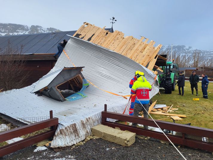 Hús í Kjósinni fór í sundur Auður Ösp Guðmundsdóttir og Viktor Örn Ásgeirsson skrifa 11. febrúar 2023 12:29 Brak úr húsinu fauk á víð og dreif. Brynjar Bjarnason Hús við Meðalfellsvatn í Kjós fór í sundur í hvassviðrinu nú skömmu fyrir hádegi. Að sögn sjónarvotta fór húsið í sundur og fuku brotin á víð og dreif um svæðið í vindhviðunum. Brynjar Már Bjarnason, hjá björgunarsveitinni Kili, segir að mannskapur hafi verið sendur á staðinn. „Það er verið að tryggja þak sem farið hefur og skemmt einhver þrjú eða fjögur hús í grenndinni og þeir eru nýlentir á svæðinu. Þetta er einhver bústaður sem er í byggingu og þakið virðist hafa sprungið upp,“ segir Brynjar Már. Brynjar segir að aðgerðir hafi gengið vel en brak úr húsinu fauk meðal annars út í Meðalfellsvatn. Þakið fauk alla leið út í Meðalfellsvatn.Brynjar Bjarnason Fréttin hefur verið uppfærð. Björgunarsveitir Kjósarhreppur Veður Mest lesið „Ég hef aldrei upplifað annan eins harm“ Innlent Gaf fingurinn á Miklubraut Innlent Hrindir af stað söfnun fyrir móður stúlkunnar sem lést í Suður-Afríku Innlent Breiddi út faðminn fyrir rasista: „Þið þurfið ekki að biðjast afsökunar á að vera hvít lengur“ Erlent Ný könnun Maskínu: „Væri alveg ný staða í íslenskum stjórnmálum“ Innlent Systir og amma drengs í meðferð létust í Suður-Afríku Innlent Málið sem Trump getur ekki losað sig við Erlent Ætlar ekki að beita sér í máli starfsmanns Útlendingastofnunar Innlent Hundrað og fjörutíu milljarða bótakrafa á Samherja sé súrrealísk Innlent Sextán ára fékk greitt fyrir að færa Epstein stúlkur Erlent Fleiri fréttir Virðist ekki vera hægt á Íslandi Stytting framhjá Blönduósi ekki á samgönguáætlun Vestmannaeyingar fá að eiga Vestmannaeyjar Hyggst kæra dyraverði Auto til lögreglu „Ótrúlega sorglegt að pabbi sé búinn að vera svona lengi í þessari stöðu“ Höfðu samband við dönsku herstjórnina á Grænlandi Ný könnun Maskínu: „Væri alveg ný staða í íslenskum stjórnmálum“ Glæný Maskínukönnun og jólaóveður Ársæll hringdi beint í utanríkisráðherra eftir fundinn Ósannað að fimmtán ára stúlka hafi stungið sextán ára pilt tvisvar Sameina Farice, Öryggisfjarskipti og hluta Neyðarlínunnar Gaf fingurinn á Miklubraut Birtir drög að lögum um lagareldi: Hyggst leggja niður Fiskeldissjóð Hundrað og fjörutíu milljarða bótakrafa á Samherja sé súrrealísk Skemmdir í kirkjugörðum vegna aksturs utan vegar Ólýsanlegur harmur fyrir fjölskylduna og söfnun hleypt af stokkunum „Ég hef aldrei upplifað annan eins harm“ Vill leiða lista Sjálfstæðismanna í Reykjanesbæ „Þetta hefur verið þungur tími“ Naut aðstoðar samskiptasérfræðinga vegna veiðigjaldamálsins Hrindir af stað söfnun fyrir móður stúlkunnar sem lést í Suður-Afríku Varð vitni að ótrúlegum norðurljósum: „Mér fannst þetta magnað“ Færir nýársboðið fram á þrettándann Fjórir fluttir á sjúkrahús eftir bílveltu á Suðurlandi Leggur aftur til hverfislögreglustöð í Breiðholti Nú má heita Love, Tóní, Ranimosk og Draumur Kvartar til umboðsmanns og vonar að Vegagerðin sjái að sér Ætlar ekki að beita sér í máli starfsmanns Útlendingastofnunar „Ég vil ekki nokkurn tímann sjá neitt svona aftur“ Gyðingar á Íslandi upplifa aukinn ótta Sjá meira