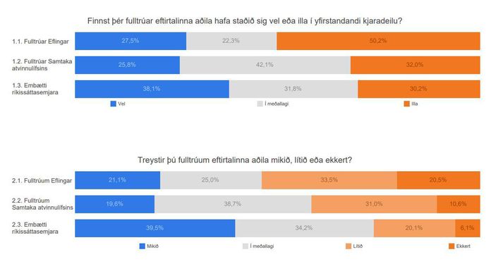 Þetta kemur fram í nýrri könnun Maskínu sem einblínir á kjaradeilu Eflingar við Samtök atvinnulífsins. Rúmlega fjörutíu prósent landsmanna treysta samtökunum lítið eða illa. Mest traust er borið til embættis ríkissáttasemjara. Könnunin var lögð fyrir Þjóðgátt Maskínu dagana 8. til 13. febrúar og voru svarendur 1080 talsins. Þátttakendur voru spurðir tveggja spurninga varðandi Eflingu, Samtök atvinnulífsins og embætti ríkissáttasemjara og svo skoðað í samhengi við menntun, tekjur og pólitískar skoðanir. Spurningarnar voru eftirfarandi: 1. Finnst þér fulltrúar Eflingar/Samtaka atvinnulífsins/ríkissáttasemjara hafa staðið sig vel eða illa í yfirstandandi kjaradeilu? 2. Treystir þú fulltrúum Eflingar/Samtaka atvinnulífsins/embætti ríkissáttasemjara mikið, lítið eða ekkert? Samantekt á niðurstöðunum má sjá á myndinni hér að neðan. Litlu munar á Eflingu og Samtökum atvinnulífsins en í kringum fjórðungur þjóðarinnar telur fulltrúa Eflingar og SA hafa staðið sig vel. Tæplega fjörutíu prósent telja sáttasemjara hafa staðið sig vel. Samantekt á niðurstöðum könnunarinnar.Maskína Töluvert fleiri landsmenn telja hins vegar fulltrúa Eflingar hafa staðið sig illa eða um helmingur. Í kringum þrjátíu prósent landsmanna telja SA og sáttasemjara hafa staðið sig illa. Varðandi traust til aðilanna þriggja nýtur sáttasemjari mest trausts eða um fjörutíu prósent landsmanna sem treysta sáttasemjara mikið. Um fimmtingur þjóðarinn treystir Eflingu og SA mikið. Hægt er að kynna sér niðurstöðurnar nánar í skjalinu að neðan. Tengd skjöl Kjaradeila_MaskínuskýrslaPDF1.7MBSækja skjal