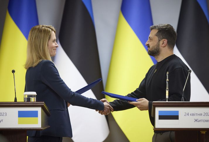 Bætist í hóp ríkja sem styðja inngöngu Úkraínu í NATO Kristinn Haukur Guðnason skrifar 25. apríl 2023 11:30 Kallas og Zelenskí við undirritunina í Zítómír héraði. EPA Eistar bætast í hóp þeirra ríkja Atlantshafsbandalagsins sem styðja inngöngu Úkraínu. Viljayfirlýsing var undirrituð í gær í Zítómír héraði í norðurhluta Úkraínu Kaja Kallas, forsætisráðherra Eistlands, og Vólódímír Selenskí, forseti Úkraínu, undirrituðu í gær viljayfirlýsingu um að Úkraína fái inngöngu í Atlantshafsbandalagið (NATO). „Í yfirlýsingunni er lögð áhersla á samstarf og að Úkraína komist nær inngöngu í NATO, einkum í tengslum við NATO fundinn sem haldinn verður í Vilníus í júlí, sem og staðfestuna um að samhæfa aðgerðir til þess að tryggja öryggi Úkraínu fyrir inngönguna,“ sagði Ihor Sovkva, talsmaður Selenskí á samfélagsmiðlum eftir undirritunina. Nefndi hann að Eistland sé tíunda NATO ríkið sem undirriti þess konar yfirlýsingu. Hin séu Ísland, Belgía, Ítalía, Tékkland, Litháen, Lettland, Pólland, Svartfjallaland og Slóvenía. „Lokatakmarkið er einfalt, að hraða inngöngu Úkraínu. Þangað til erum við að vinna að því að fá yfirlýsingar ríkja um öryggistryggingar áður en við göngum í NATO,“ sagði Sovkva. Dyggasta stuðningsþjóðin Eistland hefur verið ein dyggasta stuðningsþjóð Úkraínu síðan innrás Rússa hófst í febrúar árið 2022. Hefur Eistland veitt hlutfallslega langmest allra í aðstoð til Úkraínu. Það er tvo þriðju hernaðarútgjalda landsins eða um 1 prósent af þjóðarframleiðslunni. Eistland hefur leitt stuðningsverkefni á vettvangi Evrópusambandsins, svo sem að útvega eina milljón stórskotaliðs sprengjur. Auk þess að skrifa undir viljayfirlýsinguna skrifuðu Kallas og Selenski undir stuðning við friðaráætlun Úkraínumanna, stuðning við Evrópusambandsumsókn Úkraínu og stuðning við að komið verði á fót sérstökum sakamáladómstól til þess að draga rússneska stríðsglæpamenn til ábyrgðar. Eistland Úkraína Innrás Rússa í Úkraínu NATO Mest lesið Ríkissjóður greiðir fyrir flutning hinna látnu til Íslands Innlent „Krítískur massi af snarbrjáluðu fólki nær yfirhöndinni“ Innlent Ekið á konu á Langholtsvegi Innlent Trump nefnir nýja kynslóð orrustuskipa í höfuðið á sjálfum sér Erlent Undrandi á ráðningu ráðgjafa Innlent Hyggst kæra dyraverði Auto til lögreglu Innlent Fjölgun eldri kvenna í Kvennaathvarfi: „Þessar konur bíða ekki“ Innlent Skapari Call of Duty lést í bílslysi Erlent Sektaður um hundruð þúsunda fyrir að sparka í hund Innlent Ný könnun Maskínu: „Væri alveg ný staða í íslenskum stjórnmálum“ Innlent Fleiri fréttir Kínverjar og Rússar lýsa yfir stuðningi við Venesúela Skapari Call of Duty lést í bílslysi Trump nefnir nýja kynslóð orrustuskipa í höfuðið á sjálfum sér „Bandaríkin eiga ekki að taka yfir Grænland“ Nýr ritstjóri stöðvaði umfjöllun um brottvísanir Trump Breiddi út faðminn fyrir rasista: „Þið þurfið ekki að biðjast afsökunar á að vera hvít lengur“ Sprengdu rússneskan hershöfðingja í loft upp í Moskvu Undirbúningur árásarinnar stóð yfir í marga mánuði Trump skipar sendifulltrúa fyrir Grænland Segir unnið að því að móta sameiginlega nálgun Bandaríkjanna, Úkraínu og Evrópu Sýknaður af nauðgun eftir að hafa verið skimaður fyrir sjaldgæfri svefnröskun Málið sem Trump getur ekki losað sig við Grunaður um manndráp eftir að tveggja ára drengur féll úr blokk Fóru um borð í vélvana rússneskt skip Baulað á Albanese á minningarathöfn á Bondi-strönd Kvarta yfir ritskoðun Epstein-skjala: „Við vitum ekki hvað við vitum ekki“ Níu skotnir til bana á krá Sextán ára fékk greitt fyrir að færa Epstein stúlkur Ljósmyndir horfnar úr Epstein-skjölunum, þar á meðal ein af Trump Vilja dauðarefsingu af borðinu vegna hagsmunaáreksturs ráðherra Pútín sagður hafa valið Witkoff Gerðu umfangsmiklar árásir gegn ISIS í Sýrlandi Það helsta úr fyrsta skammti Epstein-skjalanna Epstein-skjölin birt Draga tilvist neðanjarðarhafs á Títan í efa Réðust á skip úr skuggaflotanum þúsundir kílómetra frá Úkraínu Enn fleiri myndir úr safni Epsteins: „En hún vill þúsund dali fyrir hverja stúlku“ Trump vill til tunglsins fyrir 2028 Herða reglur og ráðast í endurkaup á skotvopnum Morðinginn í Brown háskóla fannst látinn Sjá meira
