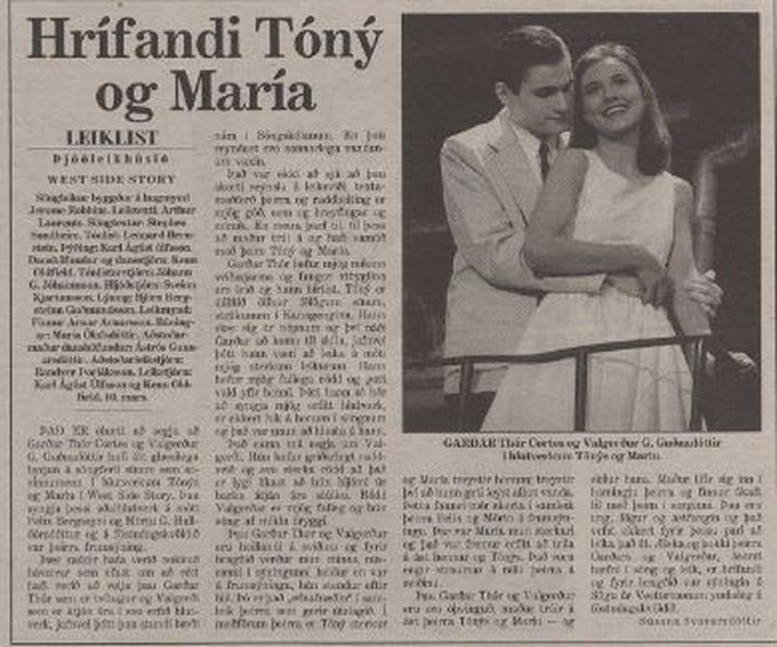 „Við smullum strax saman“ Íris Hauksdóttir skrifar 14. maí 2023 10:51 Vala Guðna og Garðar Thor voru ógleymanleg í hlutverkum sínum sem María og Tóný. aðsend Söngleikjaparið Vala Guðna og Garðar Thor Cortes hafa fyrir löngu gert garðinn frægan en þau slógu fyrst í gegn sem Tóný og María í Þjóðleikhúsinu. Nú, tæpum þrjátíu árum síðar taka þau aftur saman höndum með nýskipaðri söngleikjadeild innan Söngskólans í Reykjavík. „Það var löngu kominn tími á þetta,“ segir Valgerður Guðnadóttir, eða Vala eins og hún er alltaf kölluð. Þau Garðar Thór Cortes munu stýra saman nýrri söngleikjadeild í Söngskólanum í Reykjavík næstkomandi vetur en skólinn fagnar fimmtíu ára afmæli um þessar mundir. Leiðir þeirra Völu og Garðars lágu fyrst saman árið 1995 þegar þau léku Maríu og Tóný ógleymanlega í söngleiknum West Side Story, eða Saga úr Vesturbænum, sem settur var upp í Þjóðleikhúsinu. Vala og Garðar í hlutverkum sínum sem þau María og Tóný. Umfjöllun frá 12. mars 1995 í Morgunblaðinu. Vala var þá á nítjánda aldursári en Garðar nýskriðinn yfir tvítugt. Hann hafði gert garðinn frægan sem Nonni í sjónvarpsþáttunum Nonni og Manni en Vala hafði haslað sér völl innan sem utan veggja Verzlunarskólans. Vala og Garðar smullu strax vel saman og ríkti mikið traust á milli þeirra.aðsend „Við Garðar kynntumst í Söngskólanum. Ég var nýbyrjuð í náminu en hann hafði lokið fyrsta ári þegar við fengum hlutverkin í West Side Story. Við smullum strax saman, urðum góðir vinir og það ríkti mikið traust á milli okkar. Við sungum saman á ýmsum tónleikum og uppákomum meðan við vorum í Söngskólanum sem var skemmtilegt. Í síðari tíð höfum við líka unnið talsvert saman þó það hefði auðvitað mátt vera meira. Við tókum til að mynda þátt í Frostrósum um árabil, meðal annars í þrælskemmtilegri tónleikaferð um landið sem og á tónleikum Óperudrauganna,“ segir Vala og nefnir sömuleiðis söngleikinn Carmen negra og óperurnar Carmen og Töfraflautuna í uppsetningu Íslensku óperunnar. Vala sem Christine í Óperudraugnum.aðsend Bæði hafa líka sungið aðalhlutverk í Phantom of the Opera en ekki í sömu uppsetningum. „Það er langt síðan við höfum leitt saman hesta okkar svona tvö og það verður ekki bara ánægjulegt heldur líka langþráð að vinna saman við stofnun þessarar nýju deildar innan Söngskólans í Reykjavík.“ Garðar og Vala segjast ákaflega ánægð að sameina krafta sína á ný innan nýskipaðrar deildar Söngskólans.aðsend Spurður hvernig það hafi verið á sínum tíma að taka að sér aðalhlutverk á stóra sviði Þjóðleikhússins segir Garðar Thór það hafa verið draumi líkast. „Ég man eftir mömmu að skutla mér bakdyramegin í Þjóðleikhúsið og ég kallaði á hana rétt áður en ég gekk inn um dyrnar: „Það er ekkert betra en þetta.“ Það var nokkurn veginn þannig sem mér leið. Ég naut þess í botn að fá að túlka Tóný. Það er svo gaman að búa til persónur á sviðinu og fá að túlka tilfinningar þeirra í söng og leik – sönn forréttindi að fá að starfa við það.“ Að springa úr spenningi að fá að stíga á stóra sviðið „Þetta voru fyrstu stóru hlutverkin okkar beggja,“ bætir Vala við og heldur áfram. „Við vorum ung og óreynd, í fyrsta sinn í atvinnuleikhúsi. Garðar var auðvitað landsþekktur eftir Nonna og Manna – frægur út fyrir landsteinana og ég hafði vakið athygli í Verzló-söngleikjum og sjónvarpsleikriti. Það breytir því þó ekki að ég var að springa úr spenningi að fá að stíga á stóra sviðið í Þjóðleikhúsinu. Ég var bara barn þarna innan um alla reynsluboltana. Vala í hlutverki sínu í Óperudraugnum.aðsend Það að fá tækifæri til að leika og syngja stórt hlutverk var eitthvað sem mig hafði dreymt um frá því ég var lítil og bjó til leikrit sem ég sýndi með söng í stofunni heima. Mamma fór með mig í leikhús og óperur þegar tækifæri gafst svo það að standa sjálf á stóra sviðinu í fyrsta sinn er minning sem ég mun aldrei gleyma.“ Spurður hvort þau Vala hefðu strax náð að stilla strengi sína saman svarar Garðar ákaft játandi. „West Side Story var fyrsta verkefnið okkar saman en Carmen negra kom nokkrum árum síðar. Árið 1999 söng ég síðan sem Raúl í Phantom of the Opera á West End í London. Ég átti svo eftir að syngja hlutverk Óperudraugsins í framhaldssöngleiknum Love Never Dies í Þýskalandi, Frakklandi og Bandaríkjunum.“ Garðar í hlutverki sínu sem Óperudraugurinnaðsend Fékk símtal frá Andrew Lloyd Webber Það var Andrew Lloyd Webber sem hringdi sjálfur í Garðar og bauð honum hlutverkið. „Já, það er skemmtileg saga að segja frá því hvernig það kom til. Ég hafði verið að syngja á tónleikum til heiðurs Elaine Paige í Royal Albert Hall í London. Andrew Lloyd Webber var viðstaddur og furðaði sig á því að hafa ekki heyrt míns getið fyrr. Við Elaine Page áttum sama umboðsmann á þessum tíma. Sá var samferða Lloyd Webber í lyftu á leið í búningsherbergi Elaine Paige að loknum tónleikum til að færa henni blóm. Þá segir Webber við umboðsmanninn minn: „Við verðum að ná Garðari í Love Never Dies áður en Cameron [Mackintosh] nær honum í Vesalingana“. Ég var nokkurn veginn ráðinn þarna á staðnum en eftir gott símtal við hann sjálfan var þetta staðfest. Þetta var framhaldssöngleikur á Phantom of the Opera og byggður á lögunum þaðan. Ég söng síðar hlutverk Óperudraugsins í Þýskalandi, Frakklandi og í Norður-Ameríku. Sýningar sem gengu um nokkurra ára skeið. Ég var sömuleiðis valinn til að syngja hlutverk Óperudraugsins í Phantom of the Opera í París en viku 