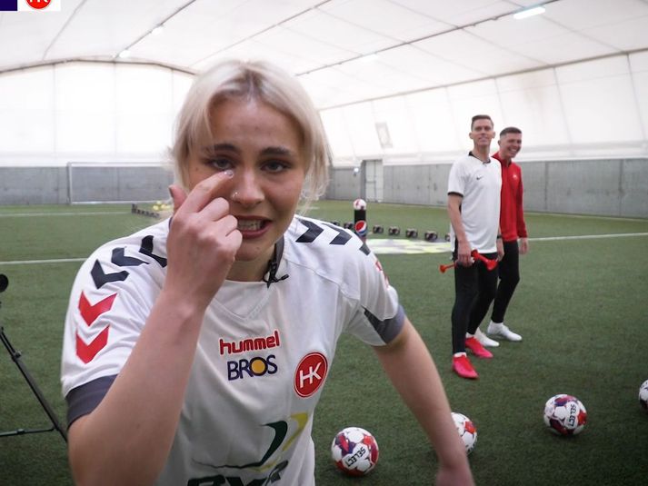 Diljá sló í gegn í Besta þættinum: „Þetta er ógeðslega vont“ Sindri Sverrisson skrifar 23. júní 2023 13:01 Diljá Pétursdóttir táraðist af sársauka í keppninni en harkaði svo af sér og átti frábæra endurkomu. Eurovision-stjarnan Diljá Pétursdóttir var senuþjófur þegar HK og Breiðablik mættust í Besta þættinum, til að hita upp fyrir nágrannaslag liðanna sem fram fer í Kórnum í kvöld, í Bestu deild karla. Þáttinn má nú sjá á Vísi. Diljá og Leifur Andri Leifsson, fyrirliði HK, mættu Blikunum Höskuldi Gunnlaugssyni og Stefáni Inga Sigurðarsyni. „Mér er illt í tánni,“ kallaði Diljá fljótlega eftir að keppnin hófst, þar sem þátttakendur spörkuðu bolta í gegnum göt og spiluðu fótbolta-boccia, eftir að hafa svarað nokkrum spurningum. Söngkonan magnaða gaf nokkrum sinnum til kynna að fótboltaferill hennar væri talsvert styttri en keppinauta hennar. „Þetta er ógeðslega vont. Eiga þessir skór ekki að vera að passa að þetta sé ekki svona sársaukafullt? Ég er komin með tár í augun,“ sagði Diljá og sýndi sjónvarpsvélinni það. Hún sá hins vegar til þess að keppnin varð æsispennandi, rétt eins og síðast þegar Breiðablik og HK mættust í hreint ævintýralegum leik. Þáttinn má sjá hér að neðan. Klippa: Besti þátturinn: Breiðablik gegn HK Leikur HK og Breiðabliks hefst í Kórnum kl. 19.15 og er að sjálfsögðu í beinni og veglegri útsendingu á Stöð 2 Sport. Besta deild karla Breiðablik HK Besti þátturinn Mest lesið Þessi tíu eru tilnefnd sem Íþróttamaður ársins 2025: 23 ára aldursmunur Sport Sagan ekki sönn: „Veit ekki hvaðan þetta á að hafa komið“ Íslenski boltinn Sakaður um niðurlægingu: „Við viljum ekki hafa hann sem þjálfara“ Handbolti Erfitt að vera í burtu þegar mamma greindist Fótbolti Arsenal - Crystal Palace | Síðasta lausa sætið í undanúrslitum Enski boltinn Glódís framlengir samninginn við Bayern Fótbolti Slot mun sakna Isak í tvo mánuði eftir „glórulausa tæklingu“ Enski boltinn Kansas frá Kansas til Kansas Sport Einn leikmaður með samning og völlurinn ólöglegur Fótbolti Áfallið staðreynd og Isak búinn í aðgerð Enski boltinn Fleiri fréttir Sagan ekki sönn: „Veit ekki hvaðan þetta á að hafa komið“ Meira en 37 stöðugildi hjá Knattspyrnusambandi Íslands Óskar Hrafn um komu Arnórs Ingva: „Gífurlega dýrmætt fyrir KR“ Arnór Ingvi orðinn leikmaður KR Breiðablik kaupir Jónatan frá Norrköping Elías mættur til meistaranna KR sagt vera að landa Arnóri Ingva Hilmar Árni til starfa hjá KR Segir fjórðung í bók Óla ósannan Víkingur í úrslit Bose-bikarsins eftir sigur „Verið heiður að spila í appelsínugulu með frábærum liðsfélögum“ Þekkir Egilshöllina vel og skoraði gegn fyrrum félögum Strákar Heimis Guðjóns fengu slæman skell í fyrsta leik Axel verður áfram hjá Aftureldingu Kveður pabba sinn í Laugardalnum og fer til FH „Félag sem var í basli með að ná endum saman og greiða laun á réttum tíma“ Skrýtið og taktlaust: „Ég er ekkert sátt með niðurstöðuna“ Fanndís kveður sviðið: „Ég er búin að fella nokkur tár“ Gylfi með tvö og Víkingar byrja á sigri Frá Akureyri til Danmerkur Markadrottningin heldur að landsliðið sé búið spil Strákarnir í 2. flokki Vals þeir einu sem ekki spila fyrir áramót Dæturnar vildu norður: „Mun alltaf gera allt fyrir þær“ Stjarnan sækir markvörð í 3. deildina „Ég var orðinn algjörlega bugaður“ Jónatan áfram á Hlíðarenda: „Var alltaf jákvæður fyrir því að framlengja“ Óli Jó kallar ráðninguna á Jóa Kalla algjört bull „Ég elska þig Ísland, takk fyrir allt!“ Sextán ára með fernu fyrir meistara Víkings Valur dregur sig úr Bose-bikarnum Sjá meira