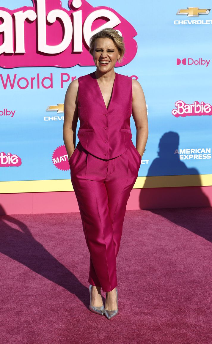 Hver stórstjarnan á fætur annarri gekk bleika dregilinn fyrir frumsýninguna í sínu allra fínasta pússi. Dua Lipa at the #Barbie world premiere. pic.twitter.com/hENl8WwqGr— Film Updates (@FilmUpdates) July 10, 2023 Söngkonan Dua Lipa var meðal gesta en hún syngur þemalag Barbie myndarinnar Dance The Night og var algjör senuþjófur í stórglæsilegum gegnsæjum og glitrandi Bottega Veneta kjól. Hér má sjá tónlistarmyndband við Barbie lagið Dance The Night: Margot Robbie, sem fer með aðalhlutverk í myndinni sem aðal Barbie-in af mörgum, klæddist öllu svörtu frá toppi til táar á frumsýningunni. Hún hefur skartað hinum ýmsu bleiku fötum á kynningarferðalagi fyrir myndina en hefur mögulega ákveðið að leggja skæru litina á hilluna í bili. Hún hélt þó ekki aftur af glamúrnum, glitraði í steinuðum Schiaparelli kjól og dró innblástur frá Barbie dúkkunni „Solo in the Spotlight“ frá sjöunda áratuginum. Barbie og Ken raunheima, Margot Robbie and Ryan Gosling, glæsileg á heimsfrumsýningu Barbie myndarinnar í gær. Frazer Harrison/FilmMagic Ryan Gosling klæddist ljósbleiku frá toppi til táar í jakkafötum frá tískuhúsinu Gucci. Hér má sjá fleiri myndir af fræga fólkinu á frumsýningu Barbie: Margot Robbie og Scott Evans leika bæði í Barbie myndinni. Robbie var glæsileg í svörtum Schiaparelli kjól og Evans í bleikum skóm og bleikum jakkafötum, en ekki hvað! Photo by Frazer Harrison/FilmMagic Dua Lipa var stórglæsileg á heimsfrumsýningu Barbie í gærkvöldi og skein sínu allra skærasta. Albert L. Ortega/Getty Images Leikstjóri Barbie myndarinnar Greta Gerwig mætti í öllu bleiku og brosti sínu breiðasta. Frazer Harrison/FilmMagic Barbie leikarahópurinn ásamt leikstjóranum. Frá vinstri: Ryan Gosling, America Ferrera, Ariana Greenblatt, Issa Rae, Margot Robbie, Greta Gerwig, Simu Liu og Hari Nef stórglæsileg saman á heimsfrumsýningu Barbie. Albert L. Ortega/Getty Images Bleik bomba! Issa Rae með bleika förðun, í bleikum kjól, með bleikt veski og í bleikum skóm.Axelle/Bauer-Griffin/FilmMagic/Getty Michael Cera klæddist bleikri hördragt og ljósum skóm. Axelle/Bauer-Griffin/FilmMagic Alexandra Shipp klæðist stórglæsilegum Miu Miu galakjól.Axelle/Bauer-Griffin/FilmMagic/Getty America Ferrera í góðum gír í gærkvöldi glæsileg í ljósbleiku satín setti frá Bandaríska tískuhúsinu ST. JOHN. Frazer Harrison/FilmMagic Leikkonan og grínistinn Kate McKinnon fer með hlutverk einnar af mörgum Barbie í Barbie myndinni. Hún virtist skemmta sér vel á frumsýningunni í gær í dökkbleikri dragt.Frazer Harrison/FilmMagic Margot Robbie var þó með bleika slæðu í hendinni þrátt fyrir að vera annars svartklædd. Rodin Eckenroth/WireImage Simu Liu og Allison Hsu voru flott á frumsýningunni í bláu. Rodin Eckenroth/WireImage Hari Nef klæðist hér svörtum Celine galakjíol og skín skært. Rodin Eckenroth/WireImage Margot Robbie og rappgoðsögnin Nicki Minaj. Michael Buckner/Variety via Getty Images „Hi Barbie, wanna go for a ride?“ Barbie bíllinn var að sjálfsögðu á staðnum!Michael Buckner/Variety via Getty Images