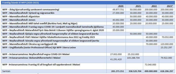 Búast má við því að á árinu muni þeim fjölga um milljónir sem búa við alvarlegt fæðuóöryggi og þeim einnig fjölga sem búa við hungursneyð. Á sama tíma og neyðin er veruleg hefur framlögum til Matvælaáætlunar Sameinuðu þjóðanna minnkað um fjóra milljarða á einu ári. „Í ár eru nokkrir lykilgefendur að minnka framlögin sín verulega, sérstaklega Bandaríkin, og því býst WFP við því að heildarframlög minnki um fjóra milljarða á þessu ári á sama tíma og neyðin eykst,“ segir Andreas Hansen, nýr svæðisstjóri Norðurlandaskrifstofu Matvælaáætlunar Sameinuðu þjóðanna. Hann tók við nýju hlutverki í ágúst eftir að hafa unnið fyrir stofnunina í um tólf ár, þarf af síðustu fjögur á svæðisskrifstofu í Austur-Afríku. Andreas vinnur í Kaupmannahöfn þar sem skrifstofa norðurlandsskrifstofanna er staðsett. Hann hefur síðustu vikur heimsótt þau lönd sem heyra undir skrifstofuna. Á döfinni er að koma til Íslands fyrir jól. „Ég stefni á að heimsækja allar höfuðborgir landanna til að hitta alla helstu samstarfsaðila okkar, blaðamenn og aðila í einkageiranum. Til að tryggja að matvælaöryggi sé á dagskrá, bæði opinberlega og í stjórnmálum,“ segir Andreas. Matarpokum á vegum Matvælaáætlunar Sameinuðu þjóðanna er dreift um allan heim.Vísir/EPA „Þetta er í fyrsta sinn í tólf ár sem ég er í Kaupmannahöfn og í þessu nýja hlutverki vil ég nota stöðu mína til að vekja athygli á matvælaóöryggi og hungursneyð.“ Andreas segir að stofnunin finni vel fyrir minnkandi framlögum og það hafi bein áhrif á þann fjölda sem þau geta aðstoðað. Í fyrra hafi þau aðstoðað 160 milljónir manns og safnað um fjórtán milljörðum það árið en að vegna þess stóra gats sem nú er í framlögum til stofnunarinnar hafi þau þurft að takmarka aðstoð sína í mörgum löndum. Hann segir eitt dæmi Sómalíu. Þar hafi í fyrra verið miklir þurrkar og hungursneyð og WFP hafi aukið við aðstoð þar og komið í veg fyrir hungursneyð. En vegna minni framlaga í ár megi gera ráð fyrir að þrjá milljónir einstaklinga í landinu fái ekki þá aðstoð sem þau þurfi nauðsynlega á að halda. „Það er eins í Afganistan, Súdan og í öðrum löndum. Svo fólk skilji þetta þá get ég reynt að setja þetta í samhengi. Í Kaupmannahöfn ver meðalfjölskylda um fimmtán prósent tekna sinna í mat á meðan fjölskylda í Súdan ver 90 prósent allra sinna tekna í mat. Þetta er þeim gríðarleg áskorun.“ Stríðið í Úkraínu hefur mikið áhrif Hann segir Úkraínustríðið hafa haft veruleg áhrif á matvælaverð um allan heim en að stofnunin hafi fundið fyrir því í innkaupum. Hann segir að samkomulagið sem hafi verið undirritað um kornflutning um Svartahafið hafi skipt verulega miklu máli og að það hafi verið töluvert áfall þegar því var ekki framlengt í júlí á þessu ári. Það hafi reynst stofnuninni erfitt að geta ekki fengið kornvöru frá Úkraínu og að enn sé verið að leita að staðgenglum. „Þetta þýðir bara, eins og með fjármagnið, að við hjálpum færri eða með minni skömmtum.“ Börn í Jemen deila mat. Matvælaáætlun Sameinuðu þjóðanna hefur varað við hættuástandi í Jemen náist ekki að safna meira fjármagn. Vísir/EPA Hvað varðar málefni núlíðandi stundar segir Andreas að hann hafi verulegar áhyggjur af matvælaöryggi vegna átaka og ástands í Ísrael og Palestínu. „Allt frá því í júní á þessu ári höfum við þegar þurft að draga verulega úr matarstuðningi í Palestínu, eða allt um 60 prósent,“ segir Andreas og að hann óttist að aðgengi að mat og vatni eigi enn eftir að verða verra. Það eigi eftir að hafa afdrifaríkar afleiðingar. Spurður hvernig honum líði þegar staðan er þessi segir Andreas að tilfinningin sé hrikaleg og að frá því að hann gekk til liðs við stofnunina hafi staðan aðeins versnað, sérstaklega síðustu árin. „Ég nýt þeirra forréttinda að starfa hérna í Kaupmannahöfn og hef aldrei þurft að upplifa hungur en margir samstarfsfélagar mínir í til dæmis Afganistan eða Jemen þurfa að taka erfiðar ákvarðanir á hverjum degi um að taka mat frá þeim sem í svöng og gefa þeim sem eru að svelta. Þetta eru erfiðar ákvarðanir sem snúast um það hver á að fá mat og hver ekki.“ Vonar að Norðurlöndin gefi meira Andreas segir að vegna þessarar stöðu reyni WFP nú að höfða til Norðurlandanna um að auka fjárframlög sín. Hann segir að samanlagt hafi Norðurlöndin í fyrra verið fjórði stærsti gefandi til stofnunarinnar og gefið meira en 500 milljónir Bandaríkjadala. Þau búist við minni framlögum í ár og það megi að mestu rekja til þess að Svíar gefi minna í ár en í fyrra. „Ísland gefur minnst í samanburði við hina en miðað við höfðatölu og efnahagskerfið þá eru þær fimm milljónir Bandaríkjadala sem Íslendingar gefa mikið.“ Samkvæmt upplýsingum frá utanríkisráðuneytinu er stofnunin áherslustofnun í mannúðarstarfi Íslands en stjórnvöld vinna einnig með stofnuninni í þróunarsamvinnu. Á sviði mannúðaraðstoðar veitir Ísland kjarnaframlög til stofnunarinnar, framlög samkvæmt langtímaáheitum á áherslusvæðum og sem viðbrögð við neyðaráköllum. Á sviði þróunarsamvinnu hefur sendiráð Íslands í Malaví átt í tvíhliða samstarfi við WFP um heimaræktaðar skólamáltíðir. Þá hefur sendiráðið einnig veitt neyðaraðstoð í gegnum WFP í kjölfar COVID-19, hitabeltisstorma og uppskerubrests. Yfirlit um framlög Íslands til WFP frá 2020 til 2023. Frekari upplýsingar um framlög til þróunarsamvinnu Íslands má finna á www.openaid.is Mynd/Utanríkisráðuneytið Andreas segir stofnunina ekki búast við því að Norðurlöndin brúi það bil