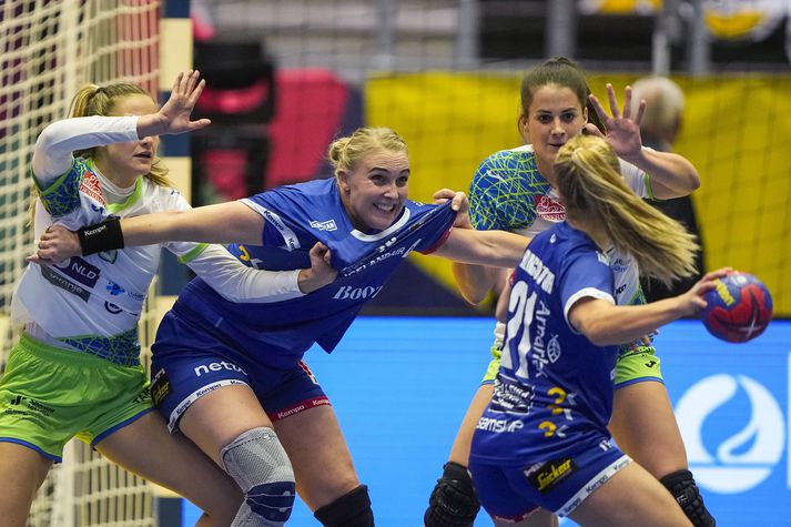 Íslenska kvennalandsliðið í handbolta mátti þola sex marka tap er liðið mætti Slóvenum í fyrsta leik liðsins á HM í tólf ár. Lokatölur 30-24, en íslensku stelpurnar voru hársbreidd frá því að snúa leiknum sér í vil eftir afar erfiða byrjun. Það var nokkur skjálfti í íslensku stelpunum í upphafi leiks á þeirra fyrsta stórmóti í tólf ár, og kannski eðlilega. Slóvenska liðið virtist ætla að keyra yfir íslenska liðið og Stelpurnar okkar náðu ekki að klára nægilega margar sóknir með skoti á markið. Slóvenía náði mest sjö marka forystu í fyrri hálfleik í stöðunni 11-4 eftir um það bil tólf mínútna leik. Þá vöknuðu islensku stelpurnar loksins til lífsins, fyrst varnarlega, og sóknarleikurinn fylgdi svo í kjölfarið. Slóvenska liðið skoraði ekki mark í um átta mínútur og Ísland saxaði hægt og rólega á forystu þeirra slóvensku. Elín Jóna Þorsteinsdóttir kom vel inn í markið í stað Hafdísar Renötudóttur og íslenska liðið minnkaði muninn niður í þrjú mörk áður en hálfleikurinn var á enda, staðan 16-13, Slóvenum í vil, þegar flautað var til hálfleiks og liðin gengu til búningsherbergja. Natasa Ljepoja raðaði inn mörkum fyrir slóvenska liðið.EPA-EFE/Beate Oma Dahle NORWAY OUT Íslenska liðið virtist ætla að hiksta í upphafi síðari hálfleiks líkt og liðið gerði í upphafi leiks. Í þetta sinn var liðið þó fljótt að hrista af sér slenið og við tóku æsispennandi mínútur þar sem liðin skiptust á að skora. Íslenska liðið fékk nokkur tækifæri til að minnka muninn niður í tvö mörk, en það virtist ganga illa. Það tókst þó loksins þegar Thea Imani Sturludóttir þrumaði boltanum í slána og inn og fiskaði varnarmann Slóveníu af velli í leiðinni. Íslenska liðið minnkaði svo muninn niður í eitt mark í stöðunni 20-19 í næstu sókn. Nær komust íslensku stelpurnar þó ekki og slóvenska liðið jók fostkot sitt á ný. Slóvenar höfðu tveggja marka forystu í stöðunni 24-22, en skoruðu næstu þrjú mörk leiksins og náðu fimm marka forskoti þegar tæpar fimm mínútur voru til leiksloka. Eftir það var aldrei spurning hvorum megin sigurinn myndi enda og íslensku stelpurnar þurftu að sætta sig við gríðarlega svekkjandi sex marka tap, 30-24. Íslenska kvennalandsliðið í handbolta lék sinn fyrsta leik á stórmóti í tólf ár í dag.EPA-EFE/Beate Oma Dahle NORWAY OUT