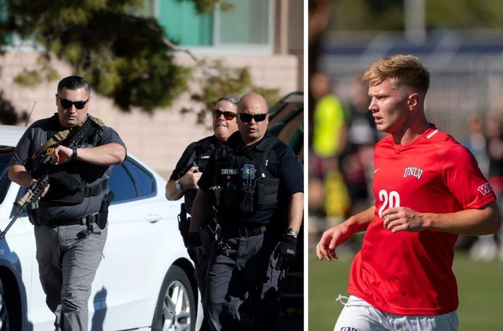 Íslenskur nemandi í Las Vegas: „Ólíkt öðru sem ég hef upplifað áður“ Samúel Karl Ólason skrifar 6. desember 2023 23:02 Hermann Þór Ragnarsson spilar fyrir UNLV Rebels, fótboltalið Háskóla Nevada. AP/Aðsend Hermann Þór Ragnarsson, nemandi við Háskóla Nevada í Las Vegas í Bandaríkjunum, segist aldrei hafa upplifað annað eins, eftir að skotárás var gerð í skólanum fyrr í kvöld. Minnst þrír voru skotnir til bana, auk árásarmannsins, og einn er særður á sjúkrahúsi, eftir að árásarmaður hleypti af skotum inn í húsnæði skólans þar sem viðskiptafræði er kennd. Hann fór því næst inn í byggingu sem er nokkurs konar Háskólatorg skólans og hóf einnig skothríð þar. Þegar árásin hófst sendi skólinn út skilaboð um að árás væri yfirstandandi og að nemendur ættu að flýja, hefðu þeir tök á því. „FLÝIÐ, FELIÐ YKKUR, BERJIST,“ stóð í skilaboðum skólans á X, áður Twitter. Sjá einnig: Skotárás í Las Vegas - „Flýið, felið ykkur, berjist“ Um fjörutíu mínútum eftir að útkall barst til lögreglunnar var því lýst yfir að árásarmaðurinn væri látinn. Skömmu áður hafði lögreglan sagt hann króaðan af. Í samtali við Vísi segir Hermann, sem hóf nám í skólanum í haust, að hann hafi fyrst orðið var við árásina með skilaboðunum frá skólanum. Þá var verið að flytja nemendur úr skólanum. Lögregluþjónar gengu milli húsa með gífurlegan viðbúnað á skólalóðinni. „Þetta er náttúrulega ólíkt öðru sem ég hef upplifað áður,“ segir Hermann. „Maður er bara í sjokki.“ Hermann segist sækja kennslustundir í byggingunni þar sem árásin hófst en hann hafi þá verið í annarri byggingu. Árásir sem þessar þykja tiltölulega tíðar í Bandaríkjunum. Aðspurður um það hvort hann hafi haft það í huga þegar hann tók ákvörðun um að fara í nám í Bandaríkjunum, segir Hermann svo ekki vera. „Maður hafði heyrt af skotárásum í Bandaríkjunum en það var ekkert sem ég var að spá í áður en ég fór út.“ Bandaríkin Skotárásir í Bandaríkjunum Íslendingar erlendis Mest lesið Ríkissjóður greiðir fyrir flutning hinna látnu til Íslands Innlent Falskar netverslanir: Auglýsir rýmingarsölu nokkrum dögum eftir opnun Innlent „Krítískur massi af snarbrjáluðu fólki nær yfirhöndinni“ Innlent Ekið á konu á Langholtsvegi Innlent Íslendingur í gæsluvarðhaldi í Kólumbíu vegna gruns um kynferðisbrot Erlent Trump nefnir nýja kynslóð orrustuskipa í höfuðið á sjálfum sér Erlent Lögreglan lýsir eftir Birni Þorláki Innlent Undrandi á ráðningu ráðgjafa Innlent Hyggst kæra dyraverði Auto til lögreglu Innlent Sektaður um hundruð þúsunda fyrir að sparka í hund Innlent Fleiri fréttir Fleiri Epstein-skjöl birt: Prinsinn bað um „óviðeigandi vinkonur“ Saka AfD um að ganga erinda Kremlverja Kínverjar og Rússar lýsa yfir stuðningi við Venesúela Skapari Call of Duty lést í bílslysi Trump nefnir nýja kynslóð orrustuskipa í höfuðið á sjálfum sér „Bandaríkin eiga ekki að taka yfir Grænland“ Nýr ritstjóri stöðvaði umfjöllun um brottvísanir Trump Breiddi út faðminn fyrir rasista: „Þið þurfið ekki að biðjast afsökunar á að vera hvít lengur“ Sprengdu rússneskan hershöfðingja í loft upp í Moskvu Undirbúningur árásarinnar stóð yfir í marga mánuði Trump skipar sendifulltrúa fyrir Grænland Segir unnið að því að móta sameiginlega nálgun Bandaríkjanna, Úkraínu og Evrópu Sýknaður af nauðgun eftir að hafa verið skimaður fyrir sjaldgæfri svefnröskun Málið sem Trump getur ekki losað sig við Grunaður um manndráp eftir að tveggja ára drengur féll úr blokk Fóru um borð í vélvana rússneskt skip Baulað á Albanese á minningarathöfn á Bondi-strönd Kvarta yfir ritskoðun Epstein-skjala: „Við vitum ekki hvað við vitum ekki“ Níu skotnir til bana á krá Sextán ára fékk greitt fyrir að færa Epstein stúlkur Ljósmyndir horfnar úr Epstein-skjölunum, þar á meðal ein af Trump Vilja dauðarefsingu af borðinu vegna hagsmunaáreksturs ráðherra Pútín sagður hafa valið Witkoff Gerðu umfangsmiklar árásir gegn ISIS í Sýrlandi Það helsta úr fyrsta skammti Epstein-skjalanna Epstein-skjölin birt Draga tilvist neðanjarðarhafs á Títan í efa Réðust á skip úr skuggaflotanum þúsundir kílómetra frá Úkraínu Enn fleiri myndir úr safni Epsteins: „En hún vill þúsund dali fyrir hverja stúlku“ Trump vill til tunglsins fyrir 2028 Sjá meira