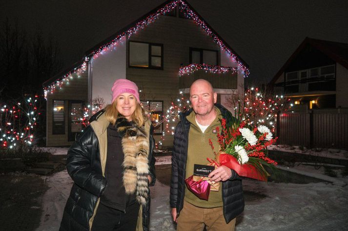 Lista- og menningarráð Kópavogs stóð í ár í annað sinn fyrir leitinni að Jólahúsi Kópavogs. Á vef Kópavogsbæjar kemur fram að dæmt sé út frá samhengi við umhverfið, birtu og jólafíling/stemmingu. „Falleg kyrrð í ljósdýrðinni“ Daltún 1 var valið jólahús ársins í ár. Umsögn dómnefndar: „Falleg kyrrð í ljósdýrðinni, umhverfið hjálpar vissulega til með þessum fallegu trjám sem umliggja húsið. Einföld litasamsetningin sveipar ákveðnum töfrablæ yfir húsið allt um kring.“ Elísabet Sveinsdóttir forseti bæjarstjórnar og formaður lista- og menningarráðs og Hjörtur Eiríksson eigandi jólahúss Kópavogs 2023.Kópavogsbær Jólahús ársins í fyrra í jólagötu ársins í ár Jólagata Kópavogs í ár er Múlalind, en þar stendur eitt mest skreytta hús landsins, Múlalind 2, sem var einmitt jólahús Kópavogs í fyrra. Umsögn dómnefndar: „Það er nú ekki annað hægt en að komast í jólaskap þegar keyrt/gengið er inn í Múlalindina. Fyrstu tvö húsin er einstaklega vel og mikið skreytt, þau setja tóninn fyrir alla götuna sem sú jólalegasta í Kópavogi þetta árið.“ Við Múlalind eru tvö einstaklega mikið og vel skreytt hús sem hafa vakið mikla athygli.Kópavogsbær Þá var Sunnusmári 22 - 28 útnefnt Jólafjölbýlishús Kópavogs 2023. Í umsögn dómnefndar segir að það sé mjög fallegt hversu samtaka nágrannarnir í Sunnusmáranum séu, allir hafi sett eins seríu og því sé heildarútkoman einstaklega falleg. Birtan/bjarminn frá húsinu sést langar leiðir og verður fallegri því nær maður kemur að húsinu. Sunnusmári 22 - 28 er Jólafjölbýlishús Kópavogs árið 2023.Kópavogsbær