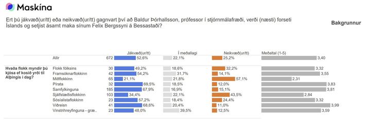 Kosningamaskína Baldurs ræsir vélarnar Jakob Bjarnar skrifar 5. mars 2024 11:36 Valli Sport, Felix og Baldur og Gunni Helga. Valli sport lét gera sérstaka könnun þar sem fram kemur að hugur þjóðarinnar til framboðs Baldurs er afar jákvætt. Það gefur hugsanlegu framboðinu byr undir báða vængi. vísir Baldur Þórhallsson prófessor í stjórnmálafræði virðist hafa undirbúið framboð sitt til forseta Íslands gaumgæfilega án þess þó að hafa tilkynnt um það formlega. Vel mannað kosningateymi gefur vísbendingar og fyrir liggur könnun sem ætti að gefa Baldri byr undir báða vængi. Baldur og Felix - alla leið er nafnið á Facebook-hópi sem telur 6.500 manns nú þegar þetta er skrifað og fjölgar sífellt. Gunnar Helgason, góðvinur hjónanna og hægri helmingur dúettsins Gunni og Felix, fer fyrir hópnum þar sem fólk skorar á Baldur að bjóða sig fram. Til hópsins var stofnað eftir að hópur fólks hittist á heimili Baldurs og Felix í gærkvöldi til að fara yfir málin og stöðuna. Þangað var komið saman fólk úr ólíkum áttum sem átti það sameiginlegt að geta hugsað sér Baldur sem forseta. Könnun kynnt fyrir mannskapnum Þar var meðal annarra mættur Valgeir Magnússon, betur þekktur sem Valli sport, og kynnti hann fyrir hópnum könnun sem hann lét gera en þar var hugur þjóðarinnar til framboðs Baldurs kannaður. Valli kynnti könnun sína á fundi stuðningsmanna Baldurs í gær.aðsend Í könnuninni er til samanburður við tvo aðra einstaklinga sem nefndir hafa verið sem hugsanlegir frambjóðendur; þau Ólafur Jóhann Ólafsson rithöfundur og forstjóri og Höllu Tómasdóttur forstjóra. Óhætt er að segja að Baldur komi mjög vel út úr þeim samanburði. „Ástæðan fyrir því að ég gerði þessa könnun núna og einnig fyrir 8 árum var að ég hef persónulega mikinn áhuga á að fá Baldur og Felix á Bessastaði og ég veit að það eru margir með sömu skoðun,“ segir Valli í samtali við Vísi. Könnunin var lög fyrir í Þjóðgátt Maskínu, sem er þjóðhópur fólks (e. panel) sem dreginn er með tilviljun úr Þjóðaskrá á netinu. Svarendur eru allstaðar að af landinu 18 ára og eldri. Könnunin fór fram 7. til 13. febrúar 2024 og voru svarendur 967 talsins. Í könnuninni kemur eitt og annað athyglisvert fram en þjóðin virðist jákvæð gagnvart því að Baldur bjóði sig fram. Niðurstöðurnar eru brotnar niður og kemur til dæmis í ljós að konur eru áfram um að Baldur gefi kost á sér. Sé litið til þess hvaða flokka svarendur styðja eru Miðflokkurinn og Sjálfstæðisflokkurinn, sem er reyndar lítill í könnuninni, eru helst mótfallnir Baldri. „Báðir eru þeir framúrskarandi menn og væru frábært teymi í þetta mikilvæga starf. Baldur er einn fremsti fræðimaður í heiminum, á sínu sviði, sem er um áhrifa smáríkja.“ Fyrsti yfirlýsti samkynhneigði forsetinn Valli segir Baldur þekkja stjórnkerfið út og inn, sem skiptir máli, auk þess að koma mjög vel fyrir. Felix, sem undanfarin ár hefur verið helsta sprautan í Eurovision fyrir Íslands hönd, sjónvarpsmaður og rithöfundur, væri „verulega sterkur stuðningur við þau verkefni sem forsetinn þarf að takast á við ásamt því hversu góður hann er í tengslamyndun. Þeir hafa báðir mjög fallega sýn á heiminn og kunna að fá fólk með sér,“ segir Valli. Og hann bætir við, því sem má heita rúsínan í pylsuendanum: „Til viðbótar þá hefur það hvergi gerst í heiminum að samkynhneigður einstaklingur hefur verð þjóðkjörinn forseti. Það væru góð mannréttindaskilaboð frá Íslandi að það myndi gerast.“ Reyndar er þetta ofsagt hjá Valla, nokkur dæmi eru um samkynhneigða forseta svo sem Edgars Rinkēvičs í Lettlandi en hann er þingkjörinn, Baldur yrði vissulega fyrsti yfirlýst samkynhneigði þjóðkjörni einstaklingurinn á Bessastöðum. Valli segir Felix frábæra viðbót við framboð Baldurs en þeir yrðu fyrstu samkynhneigða forsetaparið sem Valli telur góð skilaboð út í hinn stóra heim. Valli segir að til að fá þetta í samhengi hafi hann valið að láta einnig kanna stuðning við Ólaf Jóhann og Höllu. „En þau voru valin þar sem ég taldi líklegt að þau væru að undirbúa framboð. Könnunin er gerð svona þar sem það sýnir best hvaða möguleika fólk hefur á þessum tímapunki að skoða hversu margir eru jákvæðir fyrir framboðinu frekar en hvern það myndi kjósa. Það er ekki hægt að kanna það þegar enginn veit hverjir eru í framboði.“ Eins og áður sagði kynnti Valli könnunina fyrir stuðningsmönnum Baldurs, innsta hring í gær, og var gerður góður rómur af því sem þar kemur fram. Veraldarvön í kosningum mætt til leiks Athygli vekur að meðal þeirra sem eru mættir í Facebook-hópinn er fólk sem hefur verið í lykilhlutverki bak við tjöldin í hinum ýmsu kosningabaráttum undanfarin ár. Meðal annars framboð Jóns Atla Benediktssonar til rektors Háskóla Íslands, framboð Guðlaugs Þórs Þórðarsonar hjá Sjálfstæðisflokknum og líklega ber hæst framboð Guðna Th. Jóhannessonar til forseta Íslands fyrir átta árum. Heimir Hannesson fagnar sigri í forsetakosningunum með Elizu Reid og Guðna fyrir átta árum. Um er að ræða meðal annars þau Erlu Maríu Tölgyes, Heimir Hannesson, Janus Arn Guðmundsson, Ísak Rúnarsson og Sigurð Helga Birgisson. Erla María og Janus voru á meðal fundargesta í gær. Um er að ræða sannkallaða reynslubolta sem virðast nú vinna í því hörðum höndum að tryggja að Baldur verði næsti forseti Íslands. Það er gulls í gildi að hafa sterkt kosningateymi á bak við sig þegar farið er í baráttuna. Ísak og Erla María fagna sigri Jóns Atla í kjöri til rektors Háskóla Íslands. Hvort Baldur fari fram þó líklegur sé er enn óvíst þó það verði