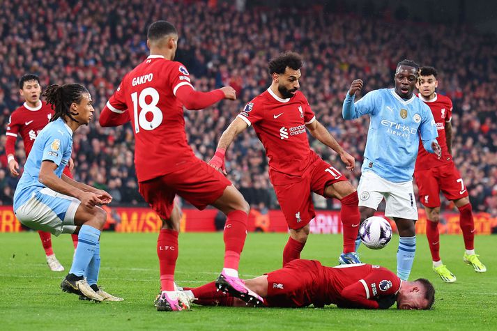 Howard Webb hefur nú tjáð sig um frammistöðu dómarans á þessum umdeildu lokasekúndum leiksins en úrslit hans gæti gert útslagið í baráttunni um Englandsmeistaratitilinn í vor. Liverpool stuðningsmenn sem og knattspyrnustjórinn Jürgen Klopp voru æfir yfir því að Doku væri ekki refsað fyrir það að fara með takkana í brjóstkassa Mac Allister. Atvikið gerðist innan vítateigs, í stöðunni 1-1 og rétt áður en leikurinn var flautaður af. Webb fór yfir málið í hinum reglubunda VAR-þætti þar sem er farið yfir þá dóma sem myndbandsdómarar hafa tekið fyrir. Webb segir samt að ef dómarinn hefði dæmt víti þá hefði því ekki verið breytt. Þetta var því dæmi um dóm sem er réttur hvorum megin við línuna sem hann endaði. Howard Webb explains the following decisions on Match Officials Mic'd Up:Liverpool's penalty appeal v Man CityWest Ham's overturned goal v Aston VillaVilla's penalty appeal v West HamMcGinn's red card v SpursWest Ham's penalty appeal v BurnleyBrownhill's red card v Palace pic.twitter.com/q6yjCx66WA— Premier League (@premierleague) March 19, 2024 „Ef dómarinn hefði dæmt þetta á vellinum þá hefði Varsjáin staðfest þann dóm og alveg eins ef hann hefði ekki dæmt það,“ sagði Howard Webb. „Við heyrum í Michael Oliver sem segir að boltinn hafi verið á milli manna sem voru að fara í tæklingu. Boltinn er of lágt til að skalla hann. Doku lyftir fætinum til að sparka í boltann og hann kemur við boltann,“ sagði Webb. „Já hann kemur aðeins við MacAllister líka. Mac Allister kemur inn í hann og hann nær ekki að fara í boltann. Ég skil samt vel að menn séu ósammála um þennan dóm,“ sagði Webb. „Varsjáin á ekki að breyta hlutum nema að það séu góðar sannanir fyrir þeim breytingum. Þú verður að vera alveg viss að þú sért að breyta rétt. Oft hafa menn ekki nægar sannanir til að breyta eða sjá hlutina nægilega vel til að dæma,“ sagði Webb. „Augljóslega var Michael [Oliver] í þeirri stöðu þarna. Svo fer Varsjáin að skoða þetta og sér heldur ekki þetta skýrt eða skorinort. Þarna er atvik sem kallar á huglægt mat og Varsjáin heldur sig frá slíku. Menn eru klofnir í afstöðu sinni til þessa dóms,“ sagði Webb. Are we surprised? Howard Webb has lost all credibility now. Why not just admit that this was a foul? Try reading law 12 Howard. No-one @FA_PGMOL has got the bollocks to take Michael Oliver on. That in itself is dangerous. pic.twitter.com/ufaq8Zb9zI— Richard Keys (@richardajkeys) March 20, 2024