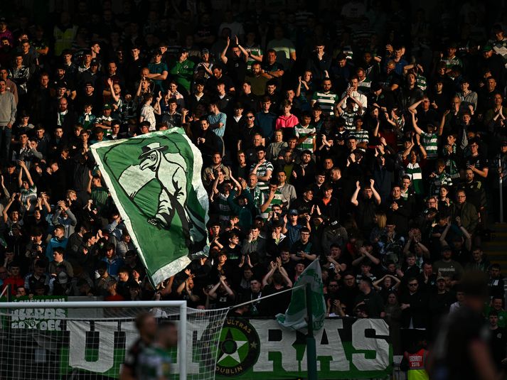 Víkingar eru úr leik í undankeppni Meistaradeildar Evrópu eftir 2-1 tap gegn Shamrock Rovers í Dublin. Nikolaj Hansen gat jafnað metin úr vítaspyrnu í uppbótartíma en skaut í stöng. Fyrri leik liðanna á heimavelli Víkinga lauk með markalausu jafntefli og því allt galopið fyrir leikinn í kvöld. Heimamenn komust í 2-0 í fyrri hálfleik með tveimur mörkum frá sóknarmanninum Johnny Kenny. Mörkin komu á 8. og 19. Mínútu, sitthvoru megin á vellinum en í bæði skiptin lék Kenny á Oliver Ekroth og kom boltanum framhjá Ingvari í markinu. Erfið staða fyrir Víkinga í hálfleik sem urðu að bregðast við og gerðu tvær breytingar í hálfleik. Johnny Kenny og Karl Friðleifur Gunnarsson í baráttunni í leiknum í kvöld.Vísir/Getty Þyngri og reynslumeiri leikmenn inn í Matta Villa og Nikolaj Hansen sem átti eftir að skila sér að einhverju leyti því Nikolaj Hansen minnkaði muninn í þeim síðari með góðum skalla eftir fyrirgjöf frá Ara Sigurpálssyni. Víkingar töluvert sterkari aðilinn frá fyrsta flauti síðari hálfleiks. Heimaliðið missti mann af velli þegar stundarfjórðungur var eftir þegar Jack Byrne missti sig örlítið og klippti Valdimar Þór niður aftan frá. Við þetta settust Írarnir enn neðar og Víkingar þjörmuðu að markinu. Svo þegar öll sund virtust lokuð fengu Víkingar vítaspyrnu á lokamínútu uppbótartíma. Fyrirliði heimamanna, Roberto Lopes, tæklaði Valdimar Þór innan teigsins og Gillet, dómari leiksins, benti á puntkinn. Tilfinningarnar voru miklar í leikslok.Vísir/Getty Fyrirliði Víkinga, Nikolaj Hansen, tók vítið og gat komið leiknum í framlengingu með marki. Hann skaut hins vegar í stöngina og framhjá og dómari leiksins flautaði leikinn af strax í kjölfarið. Grátleg niðurstaða fyrir Víkinga sem fara nú í undankeppni Sambandsdeildarinnar. Atvik leiksins Það er bara eitt sem kemur til greina. Það er vítið á lokasekúndum uppbótartíma. Það er fyrirliðinn sem stígur upp, tekur liðið á bakið og vissi að hann yrði annað hvort hetja eða skúrkur. Mér sýndist Nikolaj bíða eftir markmanninum sem fór snemma í annað hornið. Niko var seinn að skipta um horn og náði ekki að stýra boltanum fyrir innan stöngina. Sorglegur endir fyrir Víkinga sem gáfu allt í þetta. Stjörnur og skúrkar Leikurinn skiptist upp í tvo hálfleika. Johnny Kenny og Roberto Lopes voru lang bestir í fyrri hálfleik. Kenny skorar bæði mörkin og Lopes slökkti í Víkingum. Valdimar Þór Ingimundarson var algjörlega magnaður í síðari hálfleiknum og klárlega stjarna þess. Johnny Kenny og Karl Friðleifur Gunnarsson í baráttunni í leiknum í kvöld.Vísir/Getty Oliver Ekroth hefur átt mjög marga mun betri daga varnarlega. Ég hef aldrei séð hann í eins miklu veseni með einn leikmann áður. Johnny Kenny lét hann líta út fyrir að vera einhver allt annar leikmaður en sá Ekroth sem við þekkjum úr Bestu deildinni. Dómarinn Mér fannst Gillet með fína stjórn á þessu, ekki nema von enda dæmir að jafnaði í hverri viku í Ensku Úrvalsdeildinni. Rauða spjaldið rétt, vítið rétt og heilt yfir öll gul spjöld rétt líka. Stuðningsmenn Shamrock Rovers létu vel í sér heyra.Vísir/Getty Stemning og umgjörð Það hefur verið alveg ofboðslega gaman að vera á þessum leik. Það var algjörlega mögnum stemning hjá Írunum í stúkunni. Sungu og trölluðu allan leikinn og fögnuðurinn þegar Nikolaj klúðrari var nánast engu líkur.
