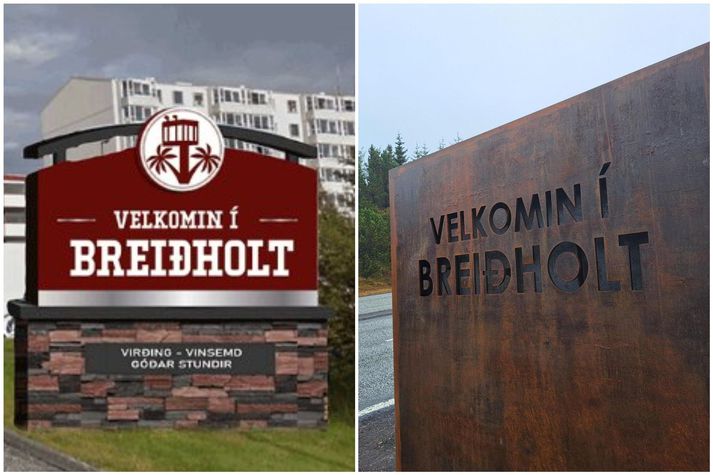 Jóhann Sveinsson, hugmyndasmiðurinn á bak við skiltið, lagði hugmyndina inn í verkefni Reykjavíkurborgar, Hverfið mitt, þar sem kosið var á milli hugmynda sem að íbúar lögðu fram sem borgin síðan framkvæmdi. Hugmynd Jóhanns er nú orðin að veruleika en á öðrum stað svo það trufli ekki umferð. „Hugmyndin var að hafa það hér efst í brekkunni og nýta blokkirnar í bakgrunni á skiltinu til að ramma inn skiltið sjálft en ákvörðun var tekin um að hafa það hér neðar í brekkunni.“ Skiptir mestu máli að hafa fengið skilti Samkvæmt hugmynd átti skiltið að líta út eins og sést á ljósmynd hér fyrir neðan en nú er það risið á öðrum stað, neðar í brekkunni við Hólahverfi og í allt öðrum búningi. Jóhann segist þó ekki svekktur með útkomuna. Til vinstri má sjá upprunalegu hugmyndina að skiltinu sem átti að standa efst í brekkunni en til hægri má sjá loka útkomuna.Aðsend „Ég er kannski ánægðastur með það að við höfum fengið skilti yfir höfuð. Niðurstaðan.. Ekki það sem var kosið um í upphafi. Fyrsta skrefið hlítur að hafa verið að fá skiltið yfir höfuð Hvort að maður sé ánægður með útlitið á skiltinu, ég gef þeim það að það lítur mun betur út á kvöldin þegar það eru upplýstir stafirnir inn í þessu.“ Fangi ekki listrænan anda Breiðholtsins Jóhann tekur fram að það væri skemmtilegra ef skiltið væri sýnilegt og áberandi allan sólarhringinn en ekki aðeins þegar það er dimmt og bendir á að það týnist aðeins á þeim stað og í þeim búning sem það er núna. Hann telur látlausan brag skiltisins ekki fanga listrænan anda Breiðholtsins. „Mér finnst þetta ekki vera í þeim skilningi mjög listrænt kannski en svo er ég ekkert djúpur í svona listfræðum og kannski er þetta listaverk, það getur vel verið.“ Fréttastofa ræddi við Jóhann á síðasta ári þegar að hugmyndin bar sigur úr býtum í verkefni Reykjavíkurborgar. Á þeim tíma var Jóhann mjög ánægður með að fá skilti í hverfið. „Þetta er í rauninni hugmynd sem við félagarnir erum búnir að ganga með lengi. Á öllum flottustu svæðum heims er glæsileg aðkoma líka og Breiðholt er auðvitað eitt af flottustu svæðum heims, það vita það allir sem hingað hafa komið,“ sagði Jóhann á sínum tíma en viðtalið við hann frá síðasta ári má berja augum í spilaranum hér fyrir neðan.