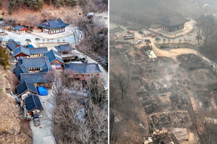 24 látnir og 1.000 ára hof brunnið í fordæmalausum gróðureldum Hólmfríður Gísladóttir skrifar 26. mars 2025 11:40 Gounsa-hofið, einnig kallað Unramsa, brann til kaldra kola í eldunum. AP/Yonhap/Baek Seung-reol/Kim Do-hoon Að minnsta kosti 24 hafa látist í skógareldum í Suður-Kóreu, sem stjórnvöld segja fordæmalausa. Flestir voru á sjötugs- og áttræðisaldri. Þá eru 26 særðir, þar af tólf lífshættulega. Yfir 23 þúsund manns hafa neyðst til að flýja eldana í suðausturhluta landsins. Þá brann Gounsa-musterið í Uiseong borg, sem er talið hafa verið reist árið 618. Munkar á staðnum, sem einnig er kallað Unramsa-hofið, eru sagðir hafa náð að bjarga nokkrum trúarlegum minjum og flytja á öruggan stað. Han Duck-soo, starfandi forseti, segir neyðarástand ríkja og að eldarnir séu að „endurskrifa metabækurnar“ um elda í landinu. 1000 year old Temple consumed by wildfireThousand-year-old Unramsa Temple on Cheondeungsan Mountain South Korea, was completely destroyed by a forest fire yesterday. It quickly spread due to strong winds, burning down both the main building and its outbuildings. “Before the… pic.twitter.com/din0YMNE1v— Global Index (@TheGlobal_Index) March 25, 2025 Gróðureldarnir hófust í Sancheong-sýslu á föstudag og náðu síðar inn í Uiseong-sýslu. Þá sækja þeir nú í átt að fjórum öðrum nálægum sýslum. Reuters hefur eftir sérfræðingi í skógarhamförum að eldurinn í Uiseong hafi breiðst út á „óhugsandi“ hraða. Þúsundir slökkviliðsmanna og um 5.000 hermenn hafa verið kallaðir út til að berjast við eldana og þá hefur einnig verið notast við þyrlur frá bandaríska hernum. Þyrla sem var við björgunarstörf í dag, hrapaði í Uiseong. Björgunarmenn virða fyrir sér bjöllu sem hékk í bjöllusal Gounsa-hofsins.AP/Yonhap/Kim Do-hoon AFP hefur eftir eplabóndanum Cho Jae-oak að hann og eiginkona hans hafi freistað þess að „vökva“ heimili sitt til að forða því frá eldunum. Þau neyddust hins vegar að lokum til að flýja. Veður hefur verið þurrt í Suður-Kóreu það sem af er ári og 244 gróðureldar kviknað, 2,4 sinnum fleiri en á sama tíma í fyrra. Gróðureldar Náttúruhamfarir Suður-Kórea Loftslagsmál Mest lesið „Ég hef aldrei upplifað annan eins harm“ Innlent Gaf fingurinn á Miklubraut Innlent Hrindir af stað söfnun fyrir móður stúlkunnar sem lést í Suður-Afríku Innlent Breiddi út faðminn fyrir rasista: „Þið þurfið ekki að biðjast afsökunar á að vera hvít lengur“ Erlent Hundrað og fjörutíu milljarða bótakrafa á Samherja sé súrrealísk Innlent „Þetta hefur verið þungur tími“ Innlent Sprengdu rússneskan hershöfðingja í loft upp í Moskvu Erlent Appelsínugular og gular viðvaranir á aðfangadag Veður Undirbúningur árásarinnar stóð yfir í marga mánuði Erlent Naut aðstoðar samskiptasérfræðinga vegna veiðigjaldamálsins Innlent Fleiri fréttir Nýr ritstjóri stöðvaði umfjöllun um brottvísanir Trump Breiddi út faðminn fyrir rasista: „Þið þurfið ekki að biðjast afsökunar á að vera hvít lengur“ Sprengdu rússneskan hershöfðingja í loft upp í Moskvu Undirbúningur árásarinnar stóð yfir í marga mánuði Trump skipar sendifulltrúa fyrir Grænland Segir unnið að því að móta sameiginlega nálgun Bandaríkjanna, Úkraínu og Evrópu Sýknaður af nauðgun eftir að hafa verið skimaður fyrir sjaldgæfri svefnröskun Málið sem Trump getur ekki losað sig við Grunaður um manndráp eftir að tveggja ára drengur féll úr blokk Fóru um borð í vélvana rússneskt skip Baulað á Albanese á minningarathöfn á Bondi-strönd Kvarta yfir ritskoðun Epstein-skjala: „Við vitum ekki hvað við vitum ekki“ Níu skotnir til bana á krá Sextán ára fékk greitt fyrir að færa Epstein stúlkur Ljósmyndir horfnar úr Epstein-skjölunum, þar á meðal ein af Trump Vilja dauðarefsingu af borðinu vegna hagsmunaáreksturs ráðherra Pútín sagður hafa valið Witkoff Gerðu umfangsmiklar árásir gegn ISIS í Sýrlandi Það helsta úr fyrsta skammti Epstein-skjalanna Epstein-skjölin birt Draga tilvist neðanjarðarhafs á Títan í efa Réðust á skip úr skuggaflotanum þúsundir kílómetra frá Úkraínu Enn fleiri myndir úr safni Epsteins: „En hún vill þúsund dali fyrir hverja stúlku“ Trump vill til tunglsins fyrir 2028 Herða reglur og ráðast í endurkaup á skotvopnum Morðinginn í Brown háskóla fannst látinn Evrópa samþykkir 90 milljarða evra lán til Úkraínu Rannsaka tengsl skotárásarinnar við annað morð Sex um borð í einkaþotu sem hrapaði Beita dómara ICC refsiaðgerðum vegna Ísrael Sjá meira