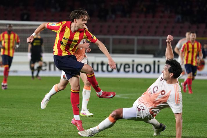 Þórir lagði upp jöfnunarmark í Íslendingaslag í Seríu A Óskar Ófeigur Jónsson skrifar 6. apríl 2025 12:28 Þórir Jóhann Helgason hefur nú lagt upp þrjú mörk í síðustu átta deildarleikjum sínum með Lecce. Getty/Gabriele Maricchiolo Íslenski landsliðsmaðurinn Þórir Jóhann Helgason gaf mikilvæga stoðsendingu þegar lið hans Lecce gerði 1-1 jafntefli við Venezia í fallbaráttuslag í ítölsku Seríu A deildinni í fótbolta. Lecce er með 26 stig í síðasta örugga sætinu í deildinni, þremur stigum frá fallsæti. Venezia er í fallsæti, fimm stigum neðar. Þetta var Íslendingaslagur en Þórir var þó sá eini sem var í byrjunarliðið. Mikael Egill Ellertsson og Bjarki Steinn Bjarkason voru báðir á bekknum hjá Feneyjaliðinu.Mikael Egill kom inn á sem varamaður á 74. mínútu en þá var staðan 1-1. Bjarki sat allan tímann á bekknum. Venezia komst í 1-0 á 50. mínútu þegar Antonino Gallo skoraði í sitt eigið mark. Jöfnunarmarkið kom á 65. mínútu en það skoraði Federico Baschirotto með skalla eftir fyrirgjöf frá Þóri í hornspyrnu. Þetta var langþráð stig hjá Þóri og félögum sem voru búnir að tapa fimm deildarleikjum í röð fyrir leikinn. Þórir hefur nú gefið þrjár stoðsendingar í fjórtán leikjum í Seríu A á þessari leiktíð en allar þessar stoðsendingar hafa komið á þessu ári og í síðustu átta leikjum hans. Ítalski boltinn Mest lesið Þessi tíu eru tilnefnd sem Íþróttamaður ársins 2025: 23 ára aldursmunur Sport Sakaður um niðurlægingu: „Við viljum ekki hafa hann sem þjálfara“ Handbolti Erfitt að vera í burtu þegar mamma greindist Fótbolti Einn leikmaður með samning og völlurinn ólöglegur Fótbolti Áfallið staðreynd og Isak búinn í aðgerð Enski boltinn Slot mun sakna Isak í tvo mánuði eftir „glórulausa tæklingu“ Enski boltinn Vildi tapa legg: „Mesti hávaði sem ég hef heyrt“ Sport Kansas frá Kansas til Kansas Sport Missti alveg stjórn á skapinu en það skilaði sigri Körfubolti Salah færði Egyptum draumabyrjun Fótbolti Fleiri fréttir Hætt við að spila í Ástralíu en óvíst hvar leikurinn verður Neymar kominn á lappir og lofar að skora í úrslitaleik HM Jiménez jafnaði bestu vítaskyttu sögunnar Slot mun sakna Isak í tvo mánuði eftir „glórulausa tæklingu“ Sjáðu „auma“ vítið sem skilaði Fulham sigri Erfitt að vera í burtu þegar mamma greindist „Svona lítur frábær ákvörðun út“ Einn leikmaður með samning og völlurinn ólöglegur Salah færði Egyptum draumabyrjun Fulham skildi Forest eftir við fallsvæðið Áfallið staðreynd og Isak búinn í aðgerð Neres hetja Napoli í Sádi-Arabíu Aron Einar lagði upp dýrmætt sigurmark Afkáralegt fagn hjá hetju Sambíu Glódís Perla veik í jólafríið en enn taplaus Glódís og Hákon best í fótboltanum á árinu Frelsaði fjárfestirinn Dani Alves gefur sjálfum sér samning Fagnaði titli Liverpool sem óður maður um alla borg Mbappé breytti um fagn af góðu tilefni „Allir virðast elska hann“ Meira en 37 stöðugildi hjá Knattspyrnusambandi Íslands Táningur fær mikið hrós fyrir viðbrögð sín þegar mótherji missti meðvitund „Þetta mun ekki buga okkur“ Guardiola mun vigta leikmenn Man City eftir jólin „Ef þið væruð Antoine Semenyo, hvert mynduð þið fara?“ Freyr himinlifandi með íslensku strákana Sjáðu geggjaðan snúning Alberts áður en hann skoraði frábært mark Óskar Hrafn um komu Arnórs Ingva: „Gífurlega dýrmætt fyrir KR“ Áhorfendur ærðust eftir mögulega mark mótsins í fyrsta leik Sjáðu mörkin: Rogers sá um Manchester United Sjá meira