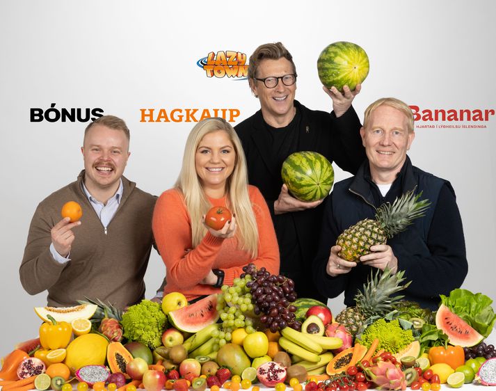 Vörurnar verða framleiddar af Bönunum og seldar í verslunum Hagkaups og Bónus. Grænmeti, ávextir, mjólkurvörur og fleiri tegundir matvæla verða í sérmerktum umbúðum og hugað verður sérstaklega að því að gera íþróttanammið að meira spennandi kosti en sælgæti. Umbúðirnar verða samkvæmt tilkynningu handhægar og innihalda skammta sem henta börnum vel. Lykilatriði að byrja snemma Í tilkynningu um verkefnið kemur fram að fyrirtækin hafi viljað stuðla að heilbrigðu mataræði barna og á sama tíma styðja við nýjar ráðleggingar um mataræði frá embætti landlæknis. „Það vantar vörur sem stuðla að heilbrigðu mataræði barna. Latibær fór í sambærilegt átak fyrir 30 árum sem skilaði sér í 22 prósenta aukningu í grænmetis- og ávaxtaneyslu barna. Við trúum því að með því að bjóða upp á hollar matvörur á áhugaverðan og skemmtilegan hátt velji börn grænmeti og ávexti oftar,“ segir Magnús Scheving. Magnús segir algert lykilatriði að byrja snemma að hafa áhrif á heilsu fólks. Mataræði sé stór hluti af því að gera fólk að heilbrigðum einstaklingum. Mataræði fólks hafi breyst mikið síðustu áratugi og algengara sé að fólk borði gjörunninn mat en áður. „Latibær var stofnaður til að hvetja fólk til að velja hollari kostinn og hvetja til hreyfingar,“ segir hann og að á þeim tíma sem fyrirtækið er stofnað hafi fáir verið að hugsa um þessa hluti. „Þetta stefndi í óefni.“ Magnús eignaðist í fyrra aftur sjónvarpsþættina ásamt vörumerki og hugverkaréttindum en fyrir tólf árum seldi hann bandaríska sjónvarpsfyrirtækinu Turner þættina og allt hugverk tengt þeim. Magnús sagði í viðtali í fyrra við það tilefni að hann vildi sjá þættina aftur í sjónvarpi, þeir ættu enn erindi við áhorfendur. Latibær er eitt þekktasta vörumerki Íslands. Þættirnir voru sýndir í um 170 löndum og þýddir á 29 tungumál. Þættirnir fóru þannig inn á um 500 milljón heimili og unnu Bafta-verðlaun og ýmis önnur verðlaun. Þá vann Magnús með Michelle Obama í Hvíta húsinu að því að hvetja fólk til hreyfingar og forseta Síle og konunginum á Spáni. Þegar Latibær var sem vinsælastur, í kringum aldamótin, var einnig leikrit í Þjóðleikhúsinu og Loftkastalanum. Þá var unnið orkuátak í samráði við stjórnvöld sem snerist um að hvetja börn til að borða meira grænmeti og ávexti. Landlæknir kynnti nýverið ráðleggingar um mataræði. Þar kom til dæmis fram að borða ætti grænmeti og ávexti með öllum máltíðum. Að minnsta kosti fimm skammta en helst átta. Nýja Latabæjarnamminu er þannig ætlað að styðja við þessar nýju ráðleggingar. Pétur Smári Sigurgeirsson, sölustjóri Banana, segir að þau hafi viljað bregðast hratt við. Frá vinstri Pétur Sigurðsson verkefnastjóri verkefnsins Bónus, Eva Laufey Kjaran, markaðsstjóri Hagkaups, Magnús Scheving, eigandi Latabæjar og Pétur Smári Sigurjónsson, sölustjóri Banana.Aðsend „Við vildum bregðast hratt við nýjum ráðleggingum í mataræði og bjóða barnafjölskyldum upp á hollar vörur á skemmtilegan hátt,“ segir hann. „Ábyrgðin á matvælaframleiðendum og smásölum á vöruúrvali verslana er mikil og við skorumst ekki undan því,“ segir Pétur Smári. Magnús segist eftir kynningu Landlæknis hafa haft samband við verslanir til að athuga hvort þær væru til í samstarf. Það hafi allir tekið vel í þá sem hann hafði samband við og skilið að þetta væri þjóðfélagslega mikilvægt. „Við erum búin að vera að vinna í þessu og ætlum að kynna þetta 30. apríl um allt land. Við erum að búa til ávexti og grænmeti og það hefur í Latabæ alltaf verið kallað ávaxtanammi. Þetta er vörumerki um allan heim. Ef þú spyrð einhvern í Mexíkó, Bretlandi eða Ástralíu hvað „sports candy“ er þá eru líklega 70 prósent sem geta svarað því.“ Hann segist reglulega hitta fólk sem nú er á barneignaraldri sem segi honum hversu mikil áhrif þættirnir höfðu á þau og þeirra mataræði og hreyfingu. „Við ætlum að svara þessu kalli og setja íþróttanammi, ávexti og grænmeti, í þessar búðir á góðum kjörum, að hafa aðgengi gott og bæta upplifunina fyrir börn. Að hvetja þau til að sleppa namminu í nammibarnum og fá sér frekar íþróttanammi.“ Matur sem krakkar vilja og geta eldað sjálf Þá segir hann það líka sorglegt hversu lítið úrvalið er af hollum mat sem er hannaður fyrir börn. Því ætli þau að gera matarlínu og holla rétti sem eru hannaðir fyrir börn. „Það verður einhvers konar matarlína sem foreldrar geta keypt og kannski eitthvað sem krakkar geta eldað sjálfir þegar þeir verða eldri.“ Magnús segir Latabæ, og aðra samstarfsaðila þeirra, vilja svara ákalli landlæknis. Aðsend Íþróttanammið verða ekki endilega skornir ávextir þótt Magnús segi það koma til greina síðar. Markmiðið sé að hafa ávextina og grænmetið í augnhæð barnanna í verslunum þannig þau geti sjálf sett í poka. „Þannig krakkarnir upplifi að þau séu að gera þetta sjálf.“ Magnús biðlar til foreldra að huga að þessu, að velja hollari kostinn. „Maður nennir oft ekki að skera ávextina niður en það er svo mikill munur. Um leið og þú skerð þá niður þá borða krakkarnir þá miklu meira en hitt. Það er svo gott að byrja snemma. Það er oft sagt að börn þurfi að smakka sjö sinnum til að finnast eitthvað gott. Fólk ætti því ekki að gefast upp eftir fyrsta skipið.“ Borðar sjálfur meira grænmeti Sjálfur á Magnús fjögur börn og segir ávexti og grænmeti alltaf hafa verið stóran part í matarræði barnanna. „Ég á einn tveggja og hálfs árs og hann er að borða miklu meira grænmeti en öll mín börn. Ég veit ekki almennilega af hverju þa