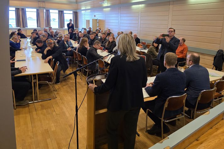Trausti Hjálmarsson, formaður Bændasamtakanna og Hanna Katrín Friðriksson atvinnuvegaráðherra fóru nýlega í hringferð um landið þar sem þau héldu sjö fundi með bænum og búaliði til að taka stöðuna í atvinnugreininni og heyra í bændum. Einn af fundunum var haldinn í félagsheimilinu Félagslundi í Flóahreppi þar sem Daði Geir Samúelsson, fjármálastjóri ylræktarstöðvanna Sólskinsgrænmetis á Flúðum, en þær eru tvær, kom í ræðustól og sagði meðal annars þetta. „Það er alveg rosalega erfitt að reyna að reka garðyrkjustöðin þegar maður er að reyna að keppa við innflutning þar sem tómatar eru kannski á 1200 krónur kílóið en við þurfum að hafa okkar tómata á 2.800 krónur upp í 3.000 krónur kílóið. Og þótt að fólk vilji gjarnan versla við okkur þá er munurinn bara orðin svo gríðarlegur. Það er orðið svolítið erfitt,“ sagði Daði Geir. Fundurinn var vel sóttur. Vísir/Magnús Hlynur Þá fór hann að tala um raforkuverð til ylræktarinnar. „Til dæmis núna um áramótin þá hækkaði rafmagnskostnaður hjá okkur um yfir 30%, þá söluhlutinn. Ef ég gef ykkur dæmi þá borga ég 16 milljónir á mánuði í rafmagnskostnað, sem sagt sala og dreifingu fyrir mínar tvær garðyrkjustöðvar. Það er um einn hektari af húsum, sem við erum með í lýsingu.“ Svo eru 22 starfsmenn að vinna hjá Daða, sem fengu launahækkun um síðustu áramót samkvæmt kjarasamningum. „Þannig að þetta er alveg gríðarlegur vandi þarna á höndum þótt að við séum með trausta neytendur og erum með verslunina í ákveðnu liði með okkur.“